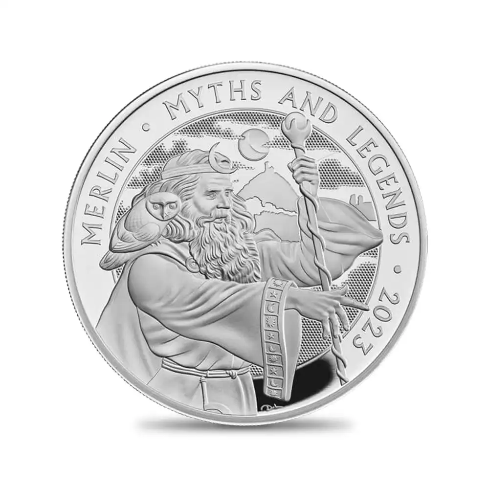 現代の我々の時代においては歴史上の実在を否定する意見が主流となりつつあるアーサー王ですが、その事実に反して王の人気は衰えを知りません。英国に数多く存在する伝説の一つとしてではなく、英国人の先祖に当たるブリトン人の偉大なる君主としてのアーサー王の歴史的な功績に対するオマージュとして、この度、特別のコインセットが満を持しての解禁となったことは誠に喜ばしい限りです。歴史的な人気ゆえに主に口伝によって受け継がれてきた王の伝説の数々は、王を含む主要な3人の登場人物の肖像を描く優れたデザインによって遂にコイン上に蘇りました。「神話と伝説」コレクションの3作品すべてを網羅するこのコインセットは、今も息づくアーサー王の変転極まりない物語を完全にデザイン化し、その現代感覚あふれる造形美によって空前の好評を博しました。同シリーズ第1弾「アーサー王」は、円卓の騎士の物語で有名なアーサー王の帝王としての威厳を頭上の王冠と手に掲げた剣が見事に象徴しています。シリーズ第2弾は、アーサー王の伝説の登場人物として名高いアンブローズ・マーリン(通称マーリン)を取り挙げます。12世紀にジェフリー・オブ・モンマスがラテン語にて記した歴史書「ブリタニア列王史」にて魔術師として紹介されるマーリンは、グレート・ブリテン島の未来についての予言を行う重要な予言者として描写されたり、今も英国に残る謎の遺跡群「ストーンヘンジ」の創造者として同書中に登場します。15世紀の薔薇戦争終結後にテューダー王朝を開いたヘンリー7世が自身をマーリンの予言による「予言の子」「赤い竜」と位置付けて以降、マーリンはグレートブリテン島を代表する魔術師と見なされるようになります。当コイン裏面にはフード付きの黒服を纏った典型的な魔術師としてのマーリンが描かれています。アーサー王の助言者、魔術師、そして預言者でもあったマーリンはこれ迄常にアーサー王と行動を共にしてきましたが、この度の同シリーズ第2弾においては単独でコイン上に描かれ、独特のキャラクターと存在感を大いに発揮しました。続く第3弾は、アーサー王伝説の名脇役として古くから人気の高い魔女「モーガン・ル・フェイ」を取り挙げます。シリーズの最終章にして英国貨幣史上初の登場となったモーガン・ル・フェイですが、ドラゴンの両翼を想起させる独特の頭部を持つ魔性の女としてこの度、コイン裏面に姿を現しました。3種の内どれもがアーサー王の伝説の主要な登場人物として欠かせない面々ですが、この度のセットコインの解禁によって全員顔を揃えることになったことは嬉しい限りです。英国人なら誰でも知っているアーサー王の伝説を恒久化する当コインセットは、豊富なラインアップによって今後、高評価を獲得することは間違いなく、今後の英国貨幣界において新たな伝説となること必至と思われます。