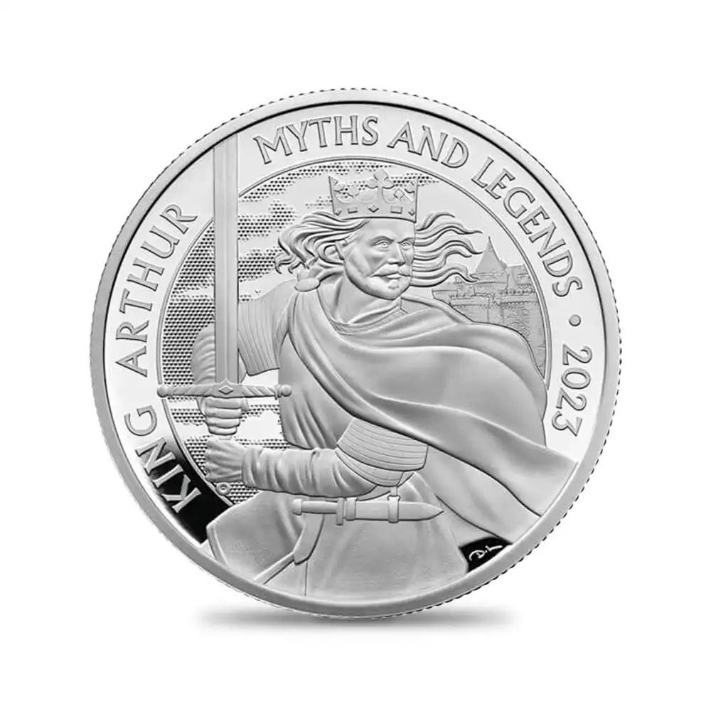 チャールズ新国王の即位と共に新たな時代を迎えた2023年度の英国貨幣界にて新風を巻き起こした全3作から成る新コインシリーズ「神話と伝説」。ブリトン人の英雄として6世紀初頭の英国史に登場して以降、常に英国人の心の拠り所として尊崇の念を抱かれ続けてきたアーサー王の存在を軸として展開する同シリーズですが、この度、その完結編として堂々の第3弾を迎えるに至りました。中世の歴史書ではアーサー王を主人公とする騎士道物語が度々取り挙げられ、次第に王は英国を象徴する英雄として認識されるようになります。ローマ帝国の衰退と共に勃興するケルト系ブリトン人勢力を率いる王は、敵対するサクソン人によるグレートブリテン島の侵攻を撃退する人物として活躍し、物語に精彩を与えてきました。しかし歴史上におけるその実在性は今日なおも議論の対象となっており、過去に発掘された王ゆかりの物品の殆どが後年の捏造品であったことから、王の存在そのものが完全に否定されるケースも多くありました。それにもかかわらず、今日まで決して歴史の闇に埋もれることなく、英国においてのみならず、国境を超越して広範囲にわたる広がりを見せたアーサー王の不動の人気は、1138年に歴史家、ジェフリー・オブ・モンマスが書き上げた主著「ブリタニア列王史」の内容によるところが大きいと言えます。ジェフリーの著作以前のウェールズやブルターニュの伝承にも頻繁に登場していたアーサー王ですが、人間の限界を超えた超自然的な存在として登場したり、グレートブリテン島を守護する屈強な戦士として描写されることが多かったようです。また時にはウェールズ人の冥界に当たる「アンヌン」を支配する呪術的な人物として描かれることも少なくありませんでした。しかしジェフリーの「列王史」を今日の歴史考証の手法によって分析する時、それまでの史実に基づく伝承の転用よりも、作者自身による創作が大部分を占めていたことがよく分かります。アーサー王の伝説は作品によって登場人物、ストーリー、テーマが大幅に異なるため、個々の解釈をより困難にしていると言えます。そして何よりも、原点となる作品が存在しないことが研究をより困難にしていることは確かです。しかしその難点にもかかわらず、王を中心として進行する物語が今日まで長期にわたって評価され続けてきた理由は、ひとえに物語そのものの面白さと、多彩な魅力を持つ登場人物たちの絶妙な性格描写を何よりの特徴としていることによります。中世期の英国を魅了し、瞬く間に市民権を獲得したアーサー王の物語でしたが、その後、その人気は次第に凋落の一途を辿ります。しかし19世紀に入って人気が復活し、21世紀の今日においても文学としてのみならず、舞台芸術、映画、テレビドラマ等によるリバイバルにとどまらず、より現代的なメディアと見なされる漫画やビデオゲームなどによっても頻繁に紹介され、無限の可能性を秘めた伝説として認知されつつあります。