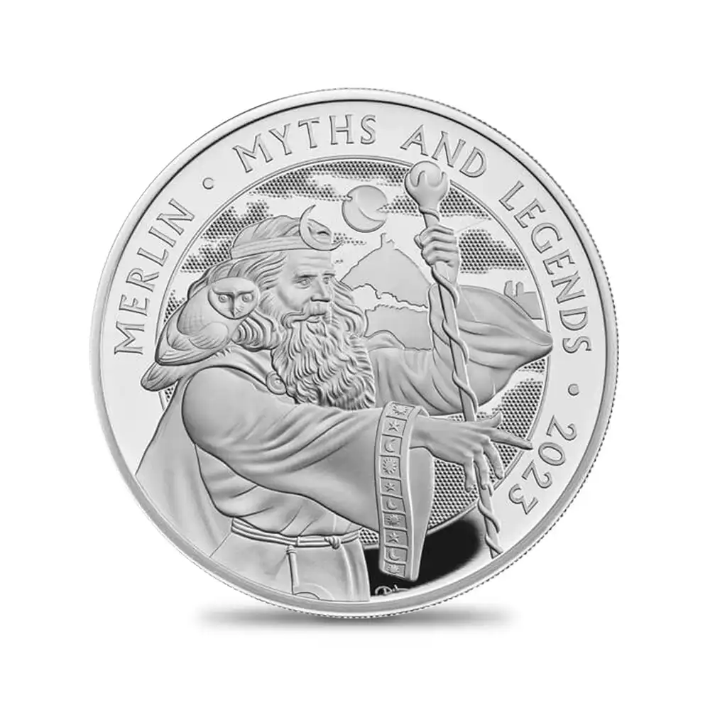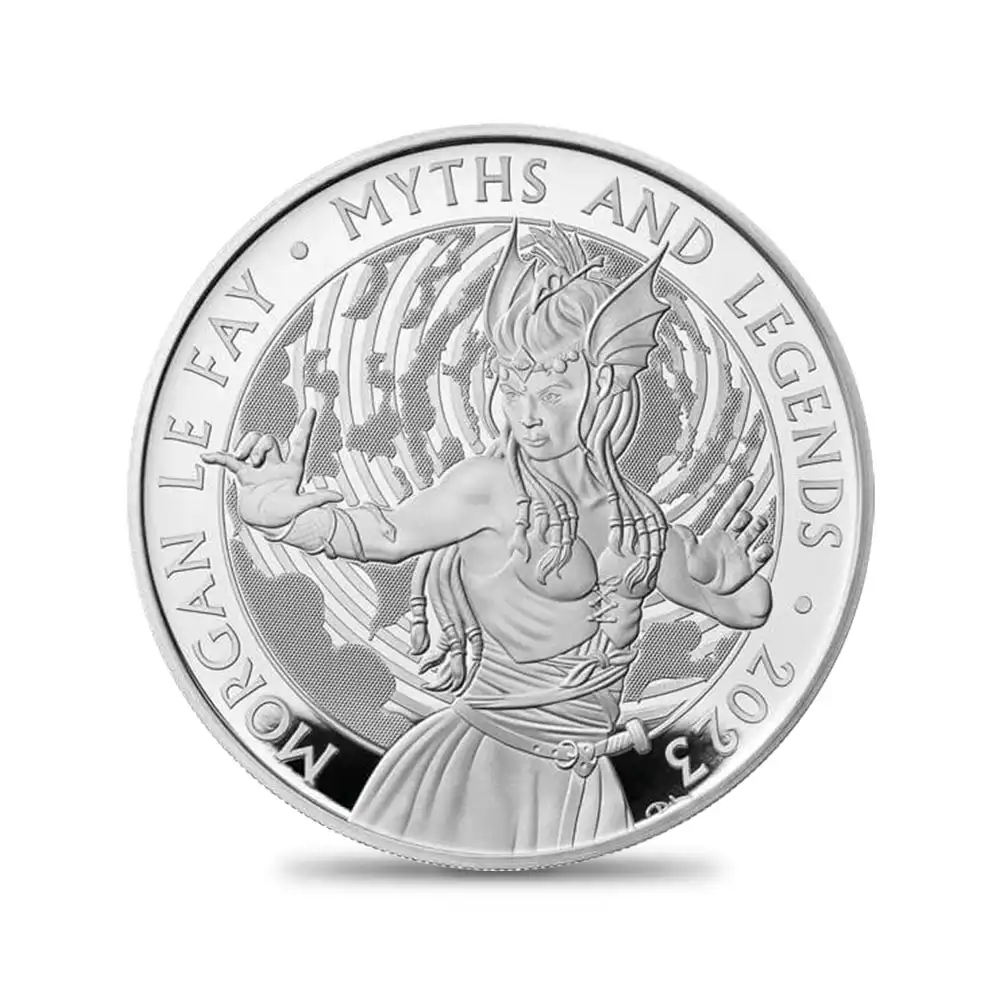 現代の我々の時代においては歴史上の実在を否定する意見が主流となりつつあるアーサー王ですが、その事実に反して王の人気は衰えを知りません。英国に数多く存在する伝説の一つとしてではなく、英国人の先祖に当たるブリトン人の偉大なる君主としてのアーサー王の歴史的な功績に対するオマージュとして、この度、特別のコインセットが満を持しての解禁となったことは誠に喜ばしい限りです。歴史的な人気ゆえに主に口伝によって受け継がれてきた王の伝説の数々は、王を含む主要な3人の登場人物の肖像を描く優れたデザインによって遂にコイン上に蘇りました。「神話と伝説」コレクションの3作品すべてを網羅するこのコインセットは、今も息づくアーサー王の変転極まりない物語を完全にデザイン化し、その現代感覚あふれる造形美によって空前の好評を博しました。同シリーズ第1弾「アーサー王」は、円卓の騎士の物語で有名なアーサー王の帝王としての威厳を頭上の王冠と手に掲げた剣が見事に象徴しています。シリーズ第2弾は、アーサー王の伝説の登場人物として名高いアンブローズ・マーリン(通称マーリン)を取り挙げます。12世紀にジェフリー・オブ・モンマスがラテン語にて記した歴史書「ブリタニア列王史」にて魔術師として紹介されるマーリンは、グレート・ブリテン島の未来についての予言を行う重要な予言者として描写されたり、今も英国に残る謎の遺跡群「ストーンヘンジ」の創造者として同書中に登場します。15世紀の薔薇戦争終結後にテューダー王朝を開いたヘンリー7世が自身をマーリンの予言による「予言の子」「赤い竜」と位置付けて以降、マーリンはグレートブリテン島を代表する魔術師と見なされるようになります。当コイン裏面にはフード付きの黒服を纏った典型的な魔術師としてのマーリンが描かれています。アーサー王の助言者、魔術師、そして預言者でもあったマーリンはこれ迄常にアーサー王と行動を共にしてきましたが、この度の同シリーズ第2弾においては単独でコイン上に描かれ、独特のキャラクターと存在感を大いに発揮しました。続く第3弾は、アーサー王伝説の名脇役として古くから人気の高い魔女「モーガン・ル・フェイ」を取り挙げます。シリーズの最終章にして英国貨幣史上初の登場となったモーガン・ル・フェイですが、ドラゴンの両翼を想起させる独特の頭部を持つ魔性の女としてこの度、コイン裏面に姿を現しました。3種の内どれもがアーサー王の伝説の主要な登場人物として欠かせない面々ですが、この度のセットコインの解禁によって全員顔を揃えることになったことは嬉しい限りです。英国人なら誰でも知っているアーサー王の伝説を恒久化する当コインセットは、豊富なラインアップによって今後、高評価を獲得することは間違いなく、今後の英国貨幣界において新たな伝説となること必至と思われます。
