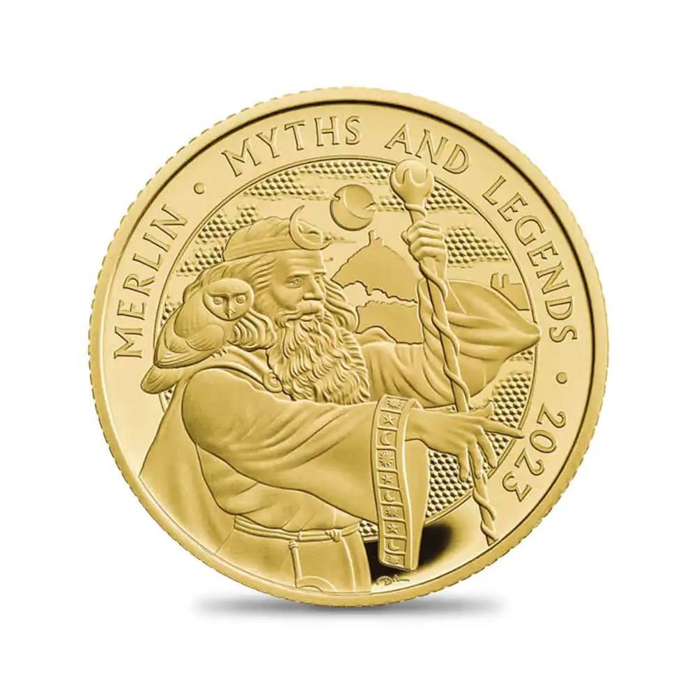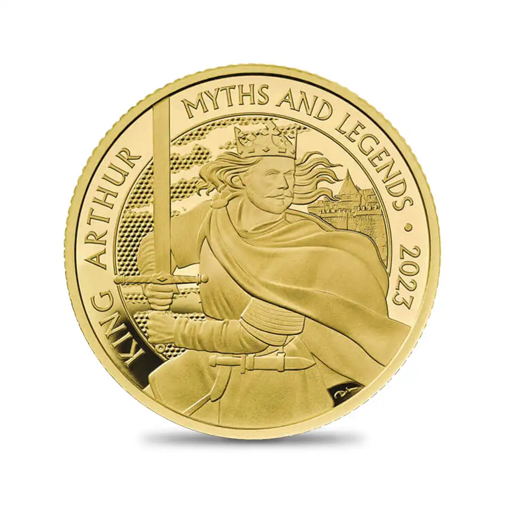 チャールズ新国王の即位と共に新たな時代を迎えた2023年度の英国貨幣界にて新風を巻き起こした全3作から成る新コインシリーズ「神話と伝説」。ブリトン人の英雄として6世紀初頭の英国史に登場して以降、常に英国人の心の拠り所として尊崇の念を抱かれ続けてきたアーサー王の存在を軸として展開する同シリーズですが、この度、その完結編として堂々の第3弾を迎えるに至りました。中世の歴史書ではアーサー王を主人公とする騎士道物語が度々取り挙げられ、次第に王は英国を象徴する英雄として認識されるようになります。ローマ帝国の衰退と共に勃興するケルト系ブリトン人勢力を率いる王は、敵対するサクソン人によるグレートブリテン島の侵攻を撃退する人物として活躍し、物語に精彩を与えてきました。しかし歴史上におけるその実在性は今日なおも議論の対象となっており、過去に発掘された王ゆかりの物品の殆どが後年の捏造品であったことから、王の存在そのものが完全に否定されるケースも多くありました。それにもかかわらず、今日まで決して歴史の闇に埋もれることなく、英国においてのみならず、国境を超越して広範囲にわたる広がりを見せたアーサー王の不動の人気は、1138年に歴史家、ジェフリー・オブ・モンマスが書き上げた主著「ブリタニア列王史」の内容によるところが大きいと言えます。ジェフリーの著作以前のウェールズやブルターニュの伝承にも頻繁に登場していたアーサー王ですが、人間の限界を超えた超自然的な存在として登場したり、グレートブリテン島を守護する屈強な戦士として描写されることが多かったようです。また時にはウェールズ人の冥界に当たる「アンヌン」を支配する呪術的な人物として描かれることも少なくありませんでした。しかしジェフリーの「列王史」を今日の歴史考証の手法によって分析する時、それまでの史実に基づく伝承の転用よりも、作者自身による創作が大部分を占めていたことがよく分かります。アーサー王の伝説は作品によって登場人物、ストーリー、テーマが大幅に異なるため、個々の解釈をより困難にしていると言えます。そして何よりも、原点となる作品が存在しないことが研究をより困難にしていることは確かです。しかしその難点にもかかわらず、王を中心として進行する物語が今日まで長期にわたって評価され続けてきた理由は、ひとえに物語そのものの面白さと、多彩な魅力を持つ登場人物たちの絶妙な性格描写を何よりの特徴としていることによります。中世期の英国を魅了し、瞬く間に市民権を獲得したアーサー王の物語でしたが、その後、その人気は次第に凋落の一途を辿ります。しかし19世紀に入って人気が復活し、21世紀の今日においても文学としてのみならず、舞台芸術、映画、テレビドラマ等によるリバイバルにとどまらず、より現代的なメディアと見なされる漫画やビデオゲームなどによっても頻繁に紹介され、無限の可能性を秘めた伝説として認知されつつあります。