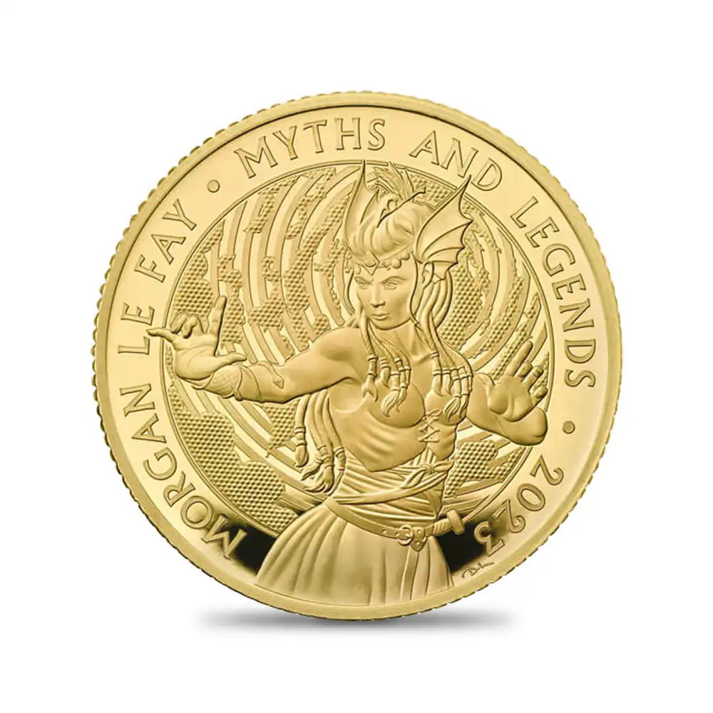 現代の我々の時代においては歴史上の実在を否定する意見が主流となりつつあるアーサー王ですが、その事実に反して王の人気は衰えを知りません。英国に数多く存在する伝説の一つとしてではなく、英国人の先祖に当たるブリトン人の偉大なる君主としてのアーサー王の歴史的な功績に対するオマージュとして、この度、特別のコインセットが満を持しての解禁となったことは誠に喜ばしい限りです。歴史的な人気ゆえに主に口伝によって受け継がれてきた王の伝説の数々は、王を含む主要な3人の登場人物の肖像を描く優れたデザインによって遂にコイン上に蘇りました。「神話と伝説」コレクションの3作品すべてを網羅するこのコインセットは、今も息づくアーサー王の変転極まりない物語を完全にデザイン化し、その現代感覚あふれる造形美によって空前の好評を博しました。同シリーズ第1弾「アーサー王」は、円卓の騎士の物語で有名なアーサー王の帝王としての威厳を頭上の王冠と手に掲げた剣が見事に象徴しています。シリーズ第2弾は、アーサー王の伝説の登場人物として名高いアンブローズ・マーリン(通称マーリン)を取り挙げます。12世紀にジェフリー・オブ・モンマスがラテン語にて記した歴史書「ブリタニア列王史」にて魔術師として紹介されるマーリンは、グレート・ブリテン島の未来についての予言を行う重要な予言者として描写されたり、今も英国に残る謎の遺跡群「ストーンヘンジ」の創造者として同書中に登場します。15世紀の薔薇戦争終結後にテューダー王朝を開いたヘンリー7世が自身をマーリンの予言による「予言の子」「赤い竜」と位置付けて以降、マーリンはグレートブリテン島を代表する魔術師と見なされるようになります。当コイン裏面にはフード付きの黒服を纏った典型的な魔術師としてのマーリンが描かれています。アーサー王の助言者、魔術師、そして預言者でもあったマーリンはこれ迄常にアーサー王と行動を共にしてきましたが、この度の同シリーズ第2弾においては単独でコイン上に描かれ、独特のキャラクターと存在感を大いに発揮しました。続く第3弾は、アーサー王伝説の名脇役として古くから人気の高い魔女「モーガン・ル・フェイ」を取り挙げます。シリーズの最終章にして英国貨幣史上初の登場となったモーガン・ル・フェイですが、ドラゴンの両翼を想起させる独特の頭部を持つ魔性の女としてこの度、コイン裏面に姿を現しました。3種の内どれもがアーサー王の伝説の主要な登場人物として欠かせない面々ですが、この度のセットコインの解禁によって全員顔を揃えることになったことは嬉しい限りです。英国人なら誰でも知っているアーサー王の伝説を恒久化する当コインセットは、豊富なラインアップによって今後、高評価を獲得することは間違いなく、今後の英国貨幣界において新たな伝説となること必至と思われます。