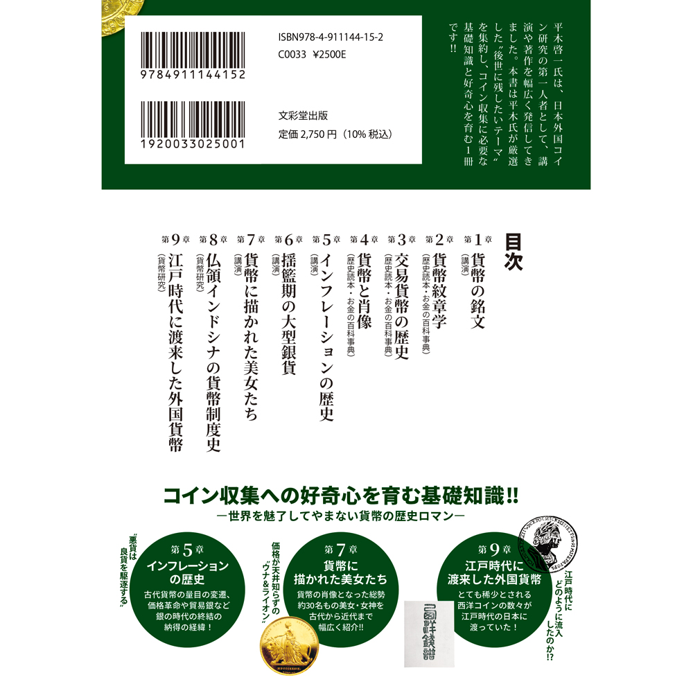 平木啓一氏は、日本外国コイン研究の第一人者として、講演や著作を幅広く発信してきました。本書は平木氏が厳選した〝後世に残したいテーマ〟を集約し、コイン収集に必要な基礎知識と好奇心を育む1冊です‼