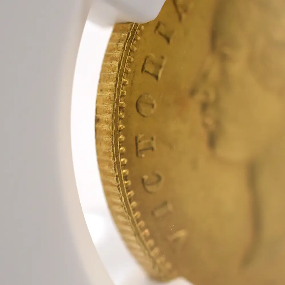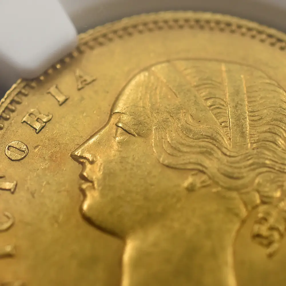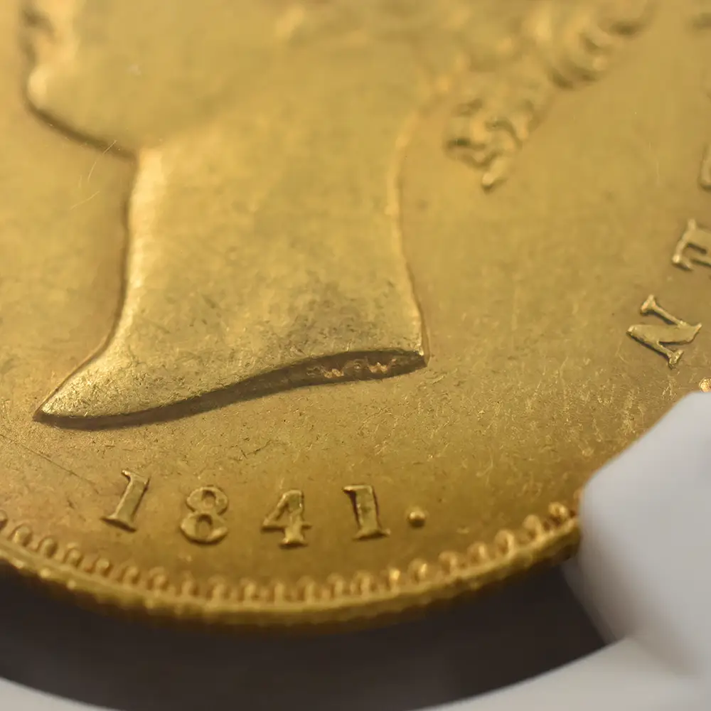 時は19世紀前半、植民地主義を推進する英国は次々と領土を獲得し、全世界に版図を広げつつありました。当時破竹の勢いで快進撃を展開していた英国にとってインドとの貿易は必要不可欠なものであり、現地での取引に使用される目的で発行されたのがモハール金貨であり、ヴィクトリア女王の治世下に発行されたものと、それよりも若干古いウィリアム4世時代のもののみが英国貨幣史上に記録されています。アンティークコインのコレクターの中でも特にヴィクトリア期のコインの熱心なコレクターの間で大変高い人気を誇るモハール金貨ですが、その理由は諸説ありです。まず第一の理由としては、ヴィクトリア期を代表する天才彫刻家にして当時のロイヤルミント彫刻部門の主任を務めたウィリアム・ワイオン(1795年-1851年)のデザインによるものであることが挙げられます。表面の肖像は言わずと知れた「ヤング・ヘッド」の愛称で知られている18歳の時の女王の秀麗なポートレートであり、英国貨幣史上の真の伝説に数えられるべき価値を持つものです。裏面のデザインもまた見るものに強い印象を与えるもので、力強いライオンが英国を象徴していることは言うまでもなく、背後のヤシの木は勝利や名声を暗示していると伝えられています。これらは空前の繁栄を謳歌していたヴィクトリア朝中期以降の大英帝国を象徴するものであり、英国が使用する貿易用通貨に描かれるには最適のデザインであったことは間違いありません。そして第2の理由としては、コレクターの蒐集意欲を掻き立てるに十分なデザイン上のバリエーションの豊富さが挙げられます。ヴィクトリア女王の治世初となった1841年版モハール金貨のデザイン別のタイプのみに絞った場合でも、多くの異なるバージョンの存在が確認されています。女王の左向きのポートレートのみを取っても2種類があり、通常の若々しく描かれた「ヤング・ヘッド」に加えて、「フォックスタイプ」と称する鋭角的なフェースラインを特徴とするものも見受けられます。また周囲の碑文も大きく分けて2種類あり、左右対称に刻まれた「ディヴァイデッド」タイプや、連続的に文字が刻まれた「コンティニュアス」タイプなどがあり、コレクターの興味を刺激する重要な要素となっています。