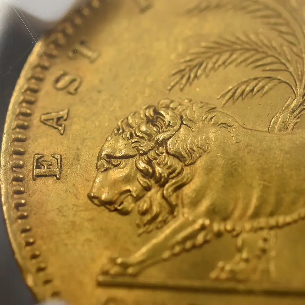 今回ご紹介させていただく英領インド発行の1841年版モハール金貨は、ヴィクトリア時代の物としては初年度に発行されたコインであり、極めてオーソドックスなデザインを特徴とする最も人気の高いものです。こちらはコイン表面に描かれた肖像周囲の碑文の「ヴィクトリア」の名と「女王」の語が左右別々に刻まれている「ディヴァイデッド」タイプのものになります。巻髪を束ねた美しい頭部は、若年ながらも知性を感じさせる18歳当時のヴィクトリア女王の躍動感あふれる横顔を描き出しており、深い感動を約束します。当時、植民地インドにおける英国側の窓口としての役割を果たしていた東インド会社の全盛期を象徴する当モハール金貨ですが、裏面の力強いライオンとヤシの木の有名な意匠と共に「東インド会社」の名称が刻まれており、古き良き時代の大英帝国を彷彿させます。貿易決済用の通貨として発行された貨幣であるモハール金貨の発行枚数は非常に多いにもかかわらず、その本来の使用目的からか保存状態の良いものが極端に少なく、現在のコイン市場にてコレクション対象として通用する逸品を発見することはそう容易いことではありません。また発行当時、このタイプのコインの使用がインド国内に限定されていたため、その影響からか現在でもインドからの国外への持ち出しが極度に制限されていることにより欧米のオークションに出品される機会も極めて稀です。その秀逸なデザインによる人気の高さゆえに保存状態の良いものは依然として高額で取引されており、時折市場に姿を見せてはコインコレクターを熱狂させているのが実状です。大英帝国の過去の栄光を物語る当モハール金貨は、英国貨幣史上の最盛期にあたるヴィクトリア期を代表する歴史的コインの真のレアリティ―として、熱烈なコイン蒐集家のキャビネットに一際重厚感をもたらすことでしょう。