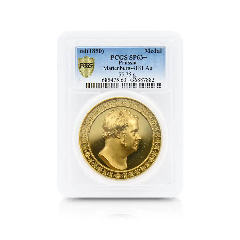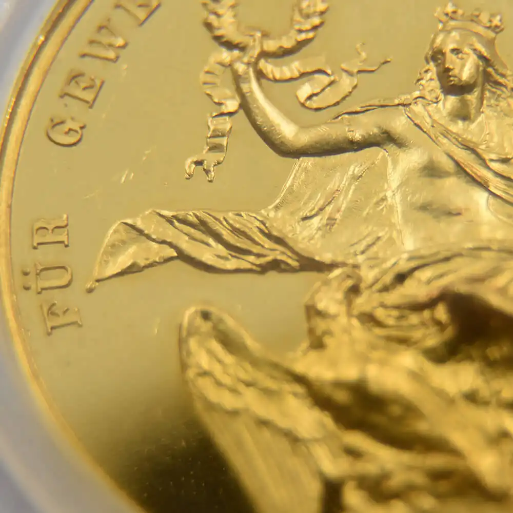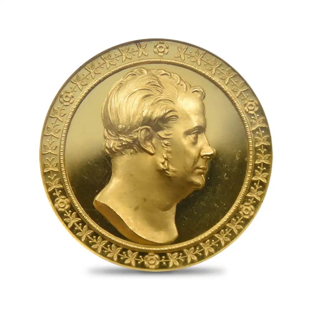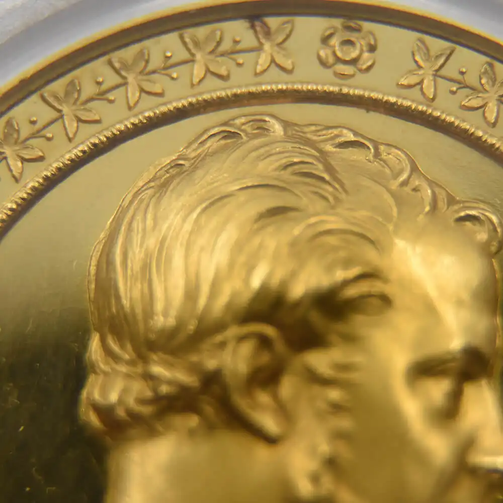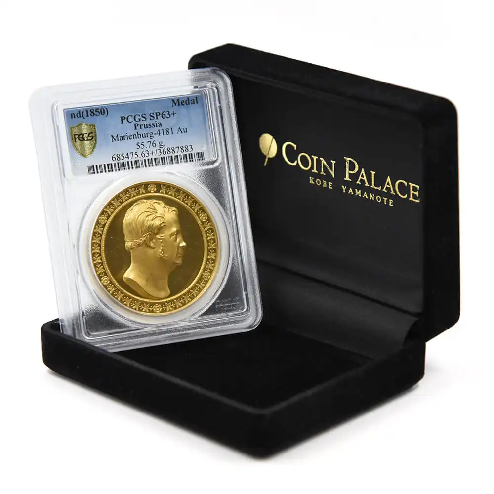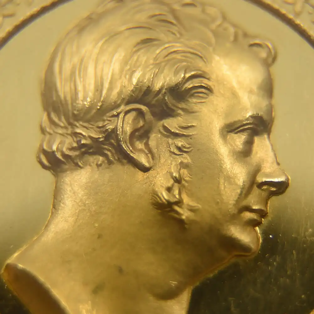 当金メダルは即位10周年を迎えたプロイセン国王フリードリヒ・ウィルヘルム4世の絶対的王権と至高の地位を表現する黄金色に輝く芸術品です。コインにはないメダルならではのダイナミズムを感じさせる造形美が見る者に深い感動を与えます。表面に描かれているのは壮年期のフリードリヒ・ヴィルヘルム4世の右向きの横顔です。非常に繊細かつ写実的なポートレートで、高い知性を誇る国王の表情を生々しく描いています。ガーランド模様が肖像の周りに円を描き、王の威厳と芸術性豊かな感性を効果的に引き立てています。試作メダルということもあり、表面の色艶は例えようもなく美しく、マテリアルとしてのゴールドの質感はその優れたデザインによって最大限活かされています。裏面に繰り広げられているのは天上の女神の物語で、頭上の冠と左手の王笏は崇高なるプロイセン王位を暗示しています。そして右手には月桂冠をかざし、勝利者=君主としての国王の絶大なる王権を祝福しています。プロイセン王国の安泰とフリードリヒ・ヴィルヘルム4世の栄光の在位10周年を寿ぐこの平和で幸福に満たされたゴールド・メダルは、国家の威厳と国王の権威を同時に表現する歴史的遺産としての価値を併せ持つ傑作です。