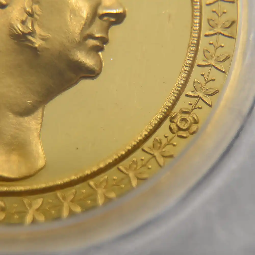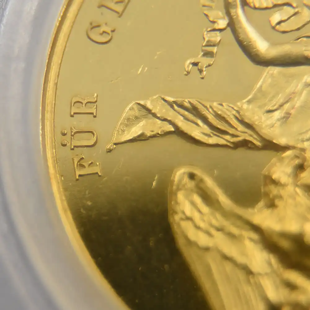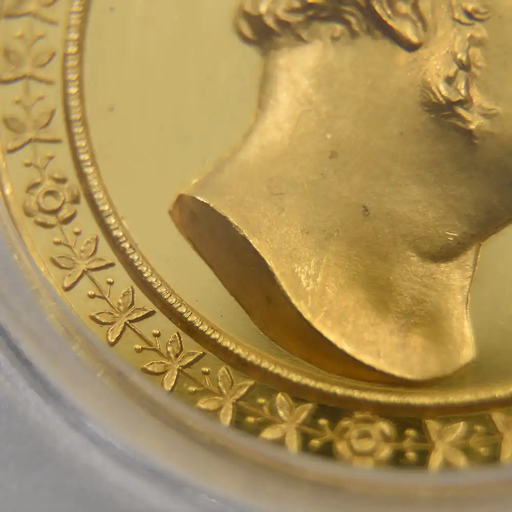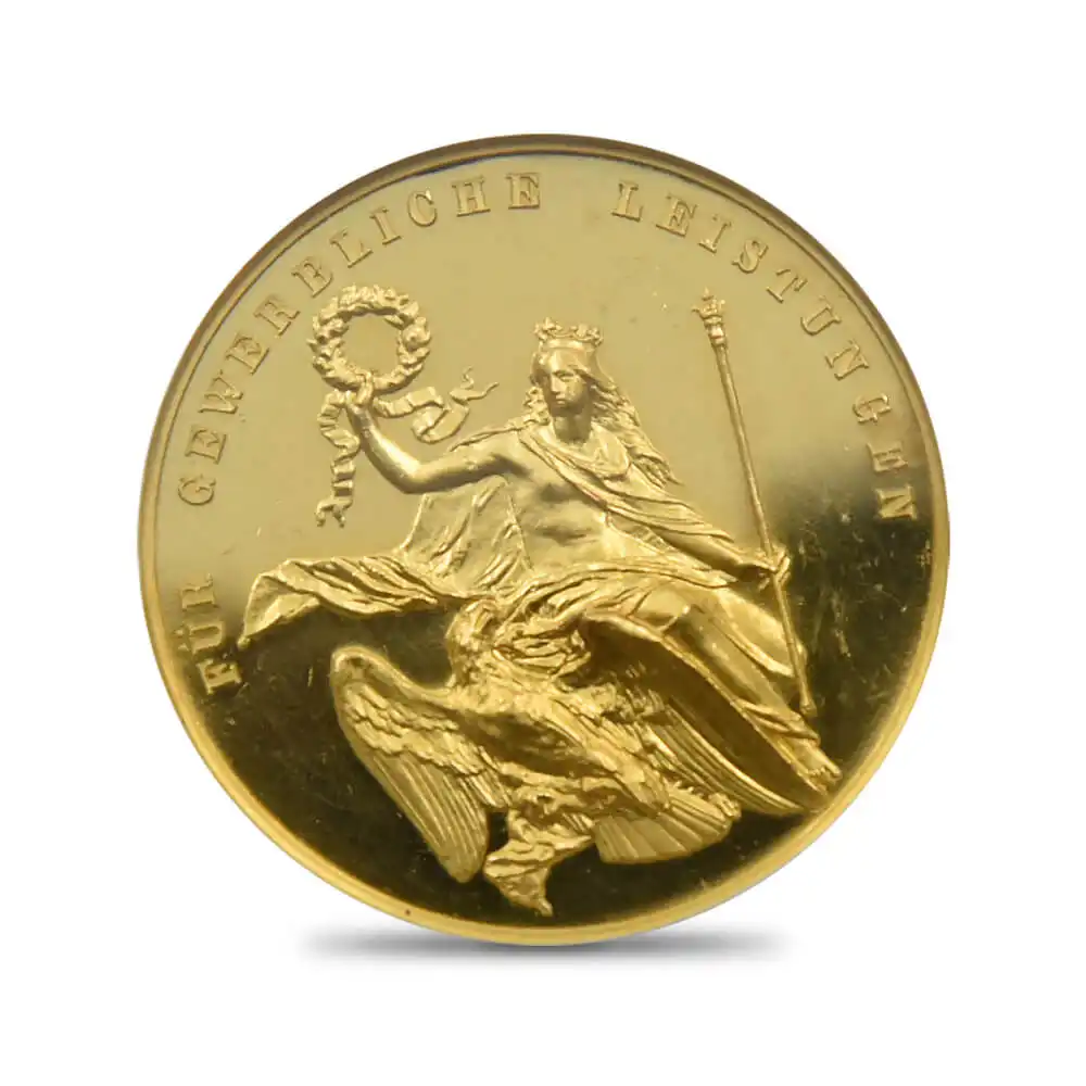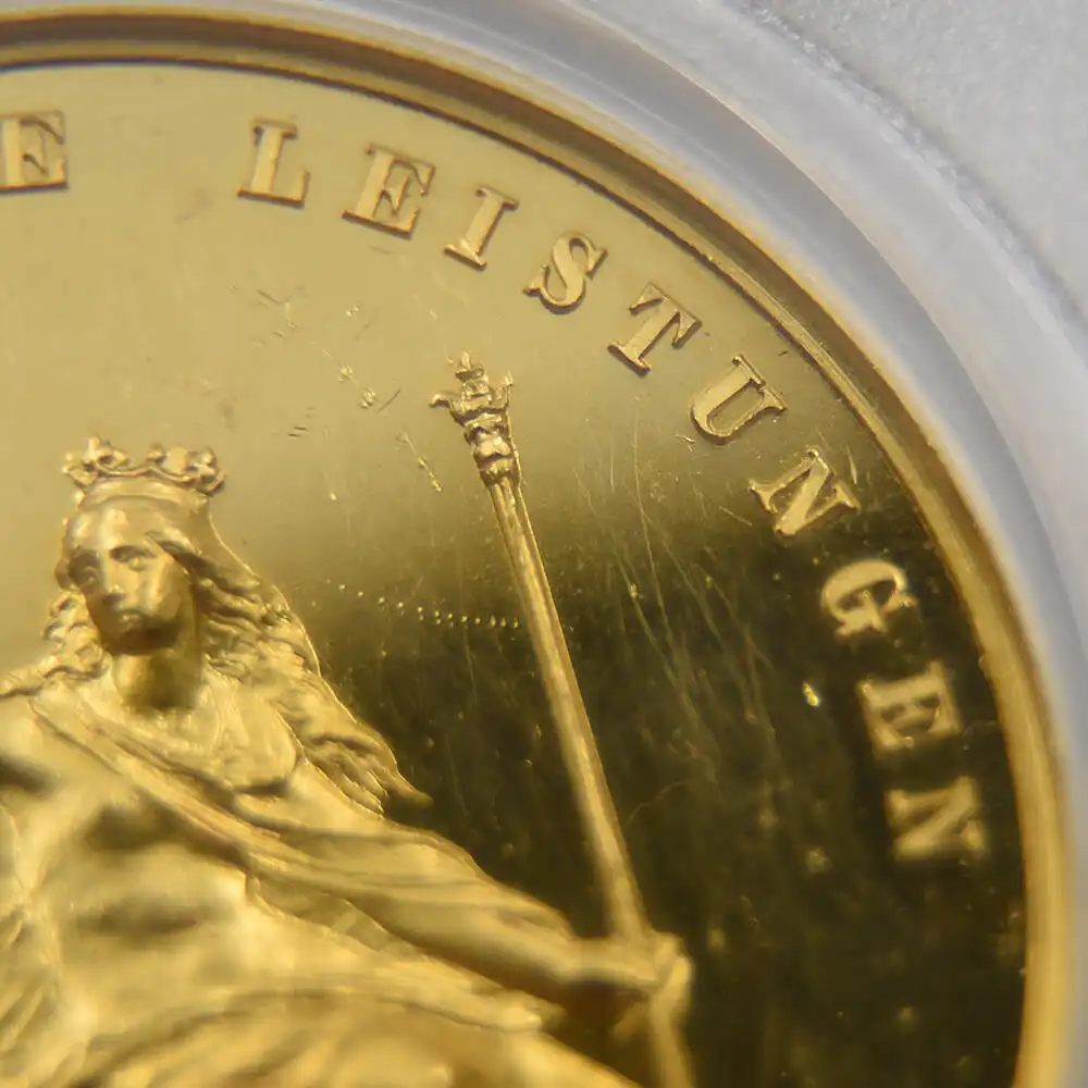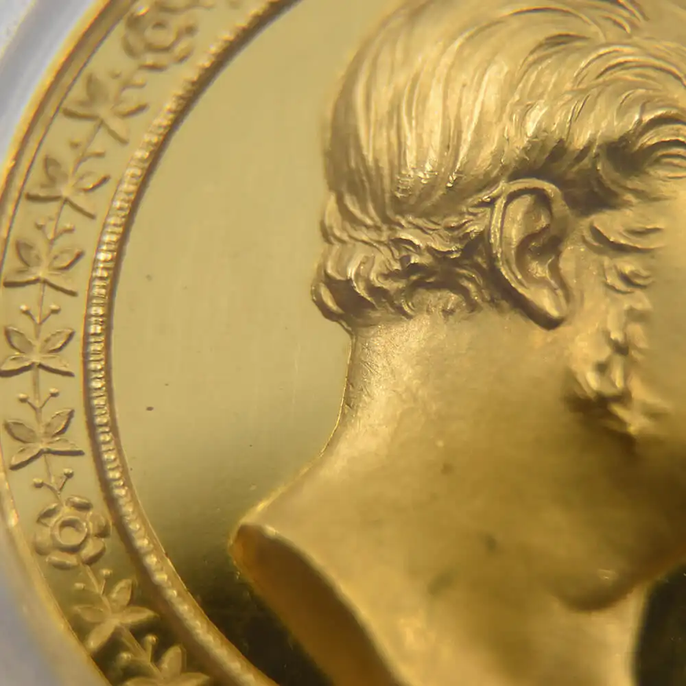 当金メダルは即位10周年を迎えたプロイセン国王フリードリヒ・ウィルヘルム4世の絶対的王権と至高の地位を表現する黄金色に輝く芸術品です。コインにはないメダルならではのダイナミズムを感じさせる造形美が見る者に深い感動を与えます。表面に描かれているのは壮年期のフリードリヒ・ヴィルヘルム4世の右向きの横顔です。非常に繊細かつ写実的なポートレートで、高い知性を誇る国王の表情を生々しく描いています。ガーランド模様が肖像の周りに円を描き、王の威厳と芸術性豊かな感性を効果的に引き立てています。試作メダルということもあり、表面の色艶は例えようもなく美しく、マテリアルとしてのゴールドの質感はその優れたデザインによって最大限活かされています。裏面に繰り広げられているのは天上の女神の物語で、頭上の冠と左手の王笏は崇高なるプロイセン王位を暗示しています。そして右手には月桂冠をかざし、勝利者=君主としての国王の絶大なる王権を祝福しています。プロイセン王国の安泰とフリードリヒ・ヴィルヘルム4世の栄光の在位10周年を寿ぐこの平和で幸福に満たされたゴールド・メダルは、国家の威厳と国王の権威を同時に表現する歴史的遺産としての価値を併せ持つ傑作です。