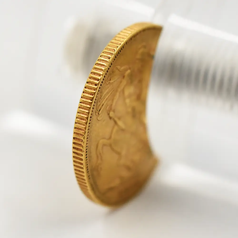 今回ご紹介させていただく作品は、当時、世界中に広がりを見せていた大英帝国を構成する主要な国家として繁栄を極めていたオーストラリアで発行された1ソブリン金貨です。英国が発行する法定貨幣と同じデザインのコインを発行する権限を持つ19世紀当時のオーストラリア造幣局では、ソブリン金貨を始めとするオーストラリア独自のコインが毎年大量に生産されていました。当ソブリン金貨表面には前述のヴィクトリア女王の「ヤングヘッド」が描かれており、法的金貨の最高位としてのソブリン金貨ならではの威厳を醸し出しています。女王がこの肖像の使用を承認したのは1838年2月であったと記録が残っていますが、前年に試作目的での貨幣が制作されていた形跡が残っています。左向きの女王の肖像からは、淡いゴールドの輝きと、経年劣化による心地よいマット感が感じられ、正真正銘のヴィクトリアン・アンティーク・コインならではの古色を愛でる楽しみを鑑賞者に与えます。コイン裏面には、「ヤングヘッド」の誕生に先駆けて、その約20年前にイタリア人コイン彫刻家べネデット・ピストゥルッチ(1783-855)が制作した「聖ジョージの竜退治」の優れた意匠が浮かび上がります。1817年の誕生以降、歴代英国王のソブリン貨の裏面を彩ってきたこの大作は、決して古びることなく、今日なおも時代を超越した現代的感覚を我々に披露しています。ヴィクトリア女王の在位50周年「ゴールデンジュビリー」を2年後に控えた時期に発行された当コインですが、史上最大の帝国へと変貌を遂げた1880年代の英国の植民地であったオーストラリアが生み出したアンティークコインの極め付きとしての当コインが、21世紀の現在なおも大英帝国最盛期の英国の権威を象徴している点に、コインコレクターで無くとも英国貨幣史の深奥として魅了されることでしょう。
