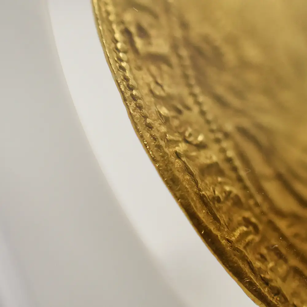 ノーブル金貨は英国貨幣史上最初に大量発行された法定金貨で、エドワード3世の治世下に初めて導入されました。それらの貨幣はほとんど流通することはなく、ノーブル、ハーフノーブル、そしてクオーターノーブルの3種が発行されていました。今回ご紹介させて頂くノーブル金貨とハーフノーブル金貨の表面には帆船の船上で剣と盾を掲げるエドワード3世が描かれており、在りし日の王の権力を絵画的に描いています。そしてこれら2種のコインの裏面には十字と王冠を組み合わせた複合的な文様が盾を形成し、中央に国王の名前エドワードのイニシャルEがきざまれています。裏面に関しては、これら2種には若干デザイン上の差異はあるものの、基本的には同じデザインを踏襲していることが窺えます。イングランドの優位を示す王冠やライオンの紋章が華麗にちりばめられ、高い装飾性と完成度を誇ります。しかし重量についてはこれら2種のコインには大きな隔たりが見られ、ノーブルが7.7g、そしてハーフノーブルが約3.7gとほぼ2対1となっています。最高度の希少価値を誇るハンマーコインの王者とも言えるノーブル金貨ですが、この時代特有の手工芸的な肌触りは、近世以降のコインには決して見られない独特の魅力と内容を備えており、観るものを圧倒します。ガーター勲章の創設によって英国史に深く名を刻むことになった稀代の帝王エドワード3世の華麗なる治世を投映する2種の金貨が、今、無限に広がる黄金の輝きと共に我々のもとに降誕しました。