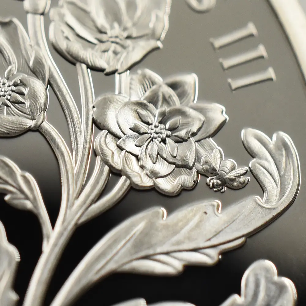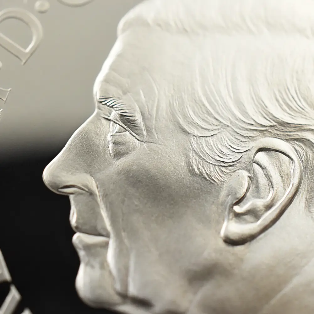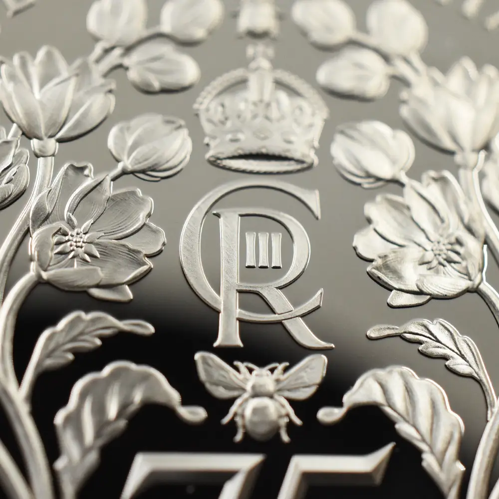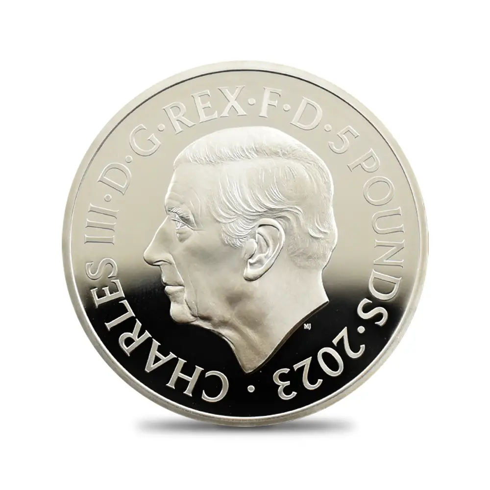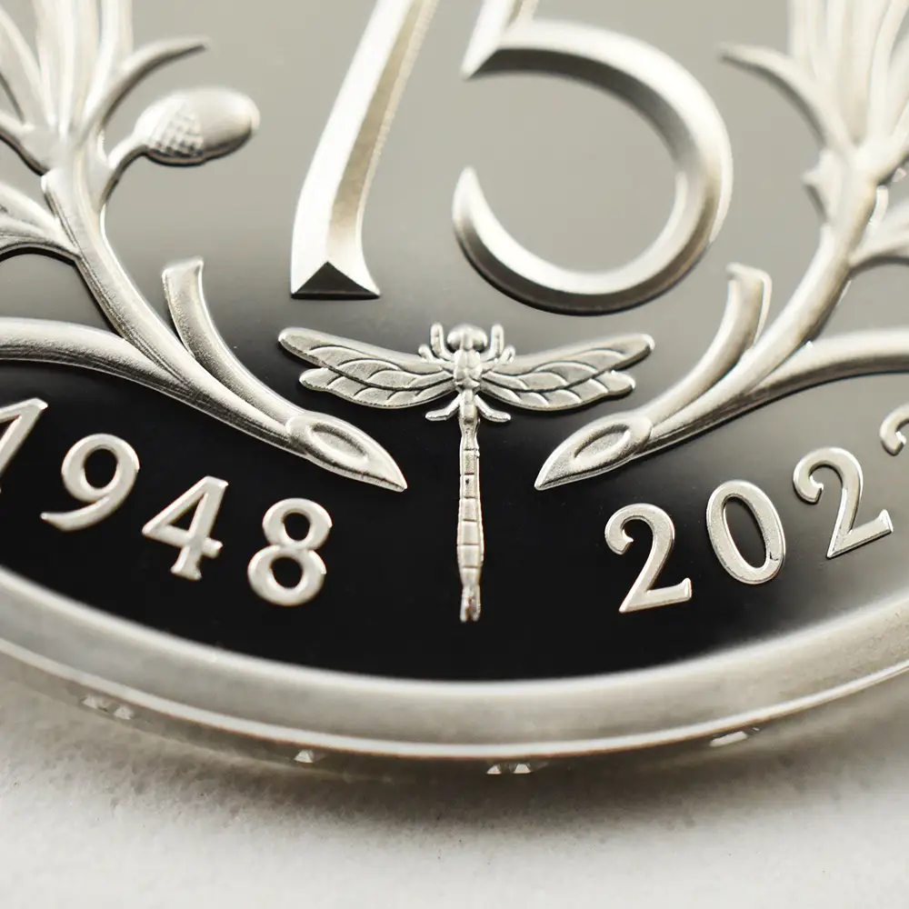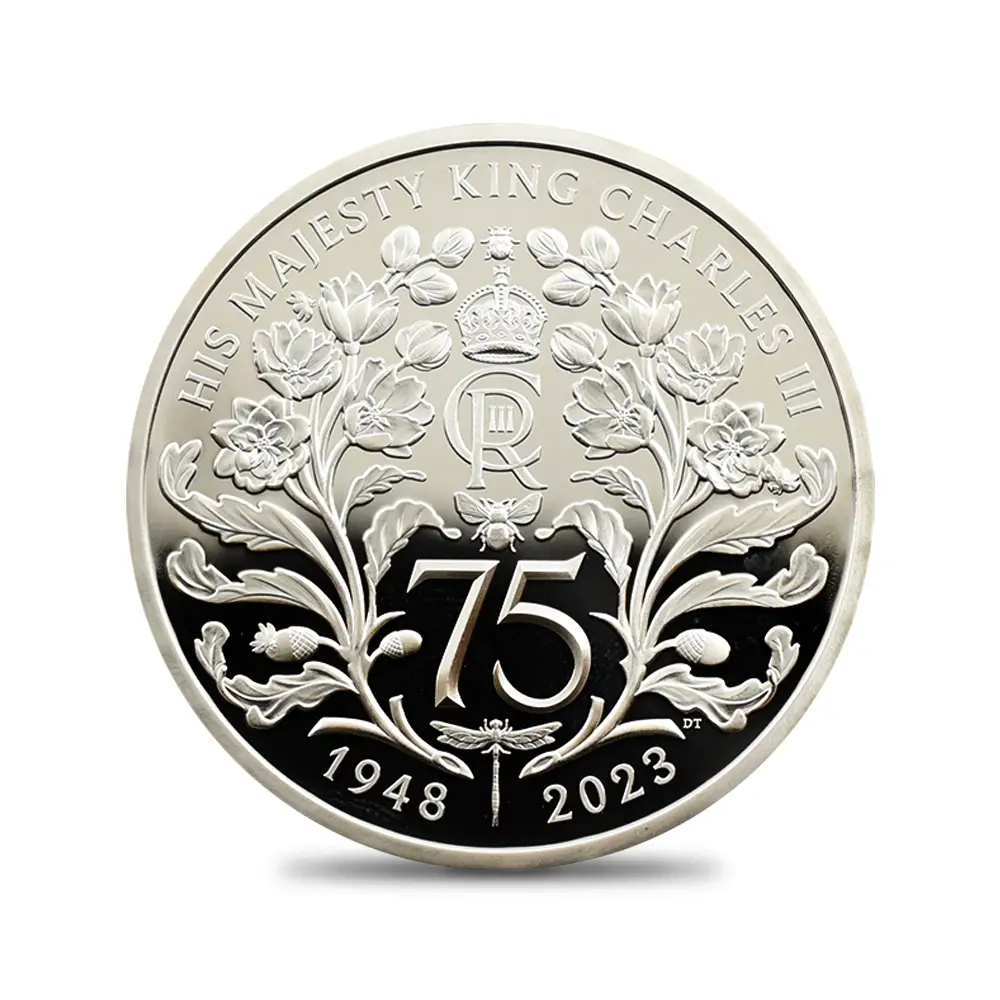 2023年11月14日に満75歳の誕生日を迎えられるチャールズ3世。英国ロイヤルミントは新国王の戴冠式後初の誕生日を祝してここに一枚の美しいコインを創造しました。まず表面には昨年の代替わり以降、ほぼすべての英国コインの表面を飾ることになった「チャールズ3世の第1肖像」が描かれています。写実性と立体感を最大の特徴とするこの現代コインポートレート屈指の傑作は、ロイヤルミントの名デザイナー、マーティン・ジェニングスの才気漲る感性の賜物であることは間違いないでしょう。肖像からは国王の人間的な温かみと魅力がそこはかとなく伝わってきます。肖像の周囲には英国貨幣の伝統を象徴する定型のラテン語碑文が刻まれていますが、唯一の例外は王名の「チャールズ」の部分です。通常ラテン語で表記されるはずの王名ですが、今回は何故かこの部分のみラテン語でチャールズを意味する「CAROLUS」ではなく通常の英語名で表記されており、現代的な配慮が感じられます。そして裏面中央にはチャールズ3世のために新たに制作されたロイヤルサイファ(国王の王名を紋章化したシンボル)、75歳の誕生日を示す「75」の数字、そして歴史的に王室の象徴として受け継がれてきた蜂の紋章が掲げられています。またオークの葉とデルフィニウムがその周囲を飾り、国王の誕生75周年に対する祝意を表しています。若き日より自然尊重の重要性を唱えてきたチャールズ国王は、王太子時代には当時所有していたハイグローブの荘園にてオーガニック植物の栽培に専心されていたことでもよく知られています。動植物をテーマとする新たなコインデザインの傑作の誕生は、環境問題、特に絶滅の危機に瀕している動植物の保護にも熱心なチャールズ3世に相応しいテーマとして、今後、脚光を浴びることは間違いありません。