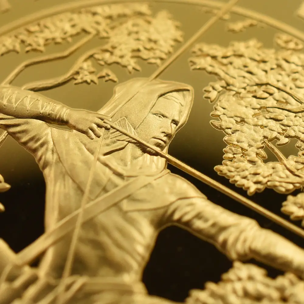 英国の真の伝説として今日まで受け継がれているアーサー王の物語をコイン上にてデザイン化し、瞬く間に傑作モダンコインの仲間入りを果たしたロイヤルミントによる「神話と伝説シリーズ」第1・2・3弾。そしてこの度、その待望の第4弾を迎えることになった英国貨幣界は、英国にとってのもう一つの偉大なる伝説であるロビン・フッドのロマンティックな物語を世に送ります。数えきれないほど多くのエピソードに枝分かれして語り継がれているこの伝説の主軸を成すのは、不世出の英雄ロビン・フッドの変転極まりないエピソードであり、悪しきを懲らしめて弱者を救済するいわゆる勧善懲悪的な内容を最大の特色としています。ロビン・フッドが歴史上に実在したかどうかについての議論は中世以来ずっと続いており、「1241年没」という伝承もありますが、残念ながら実在を裏付ける確かな証拠は残されていません。しかし、当時のイングランドにそれらしき数人の人物が存在したことも確かであり、それらの複合体として最終的にロビン・フッドが生み出されたことは大いに考えられます。イングランドの伝説では、ノルマン・コンクエスト後にノルマン人に抵抗するアングロサクソン人農民の姿で描写されることの多かったロビン・フッド。また、英国の古い文献上に挿入されていた、時にアウトローを代表する盗賊として、また時には「大股のロビン」とあだ名されて万人に親しまれていたロビン・フッドを描く伝説は、14世紀のウィリアム・ラングランドの長編詩「農夫ピアーズの夢」の作中において初めてまとまった物語として発表されました。「大柄な弓矢の達人」として描写されるようになったのは比較的最近の19世紀以降のことであり、いつの間にかイングランドのノッティンガムのシャーウッドの森に住むアウトロー集団のリーダーにして盗賊という役柄を与えられていたことは興味深いことです。今日、緑色の服をまとう森の英雄として描かれることの多いロビン・フッドの基本的なイメージは、20世紀以降のアメリカ映画や子供向けの童話集の影響によるところのものであることは間違いないでしょう。とりわけ1991年に公開されたケヴィン・コスナー主演のハリウッド映画が世界に及ぼしたインパクトは大きく、現在我々が抱くロビン・フッド像の原型として長く愛されており。英国が生んだこの不世出の英雄の伝説を恒久化することに著しい貢献を果たしました。