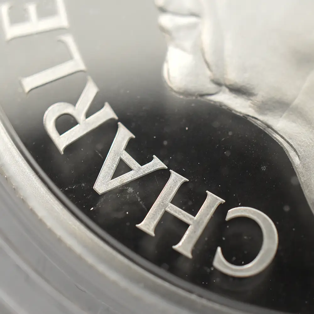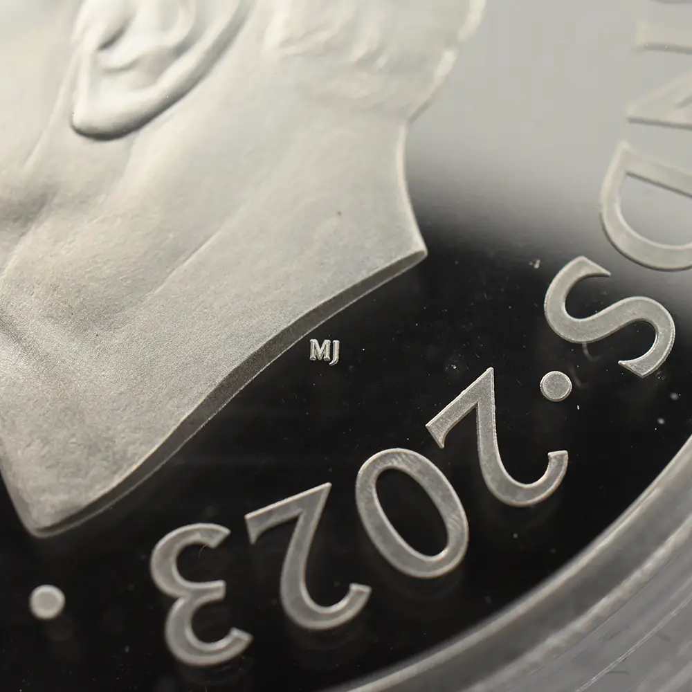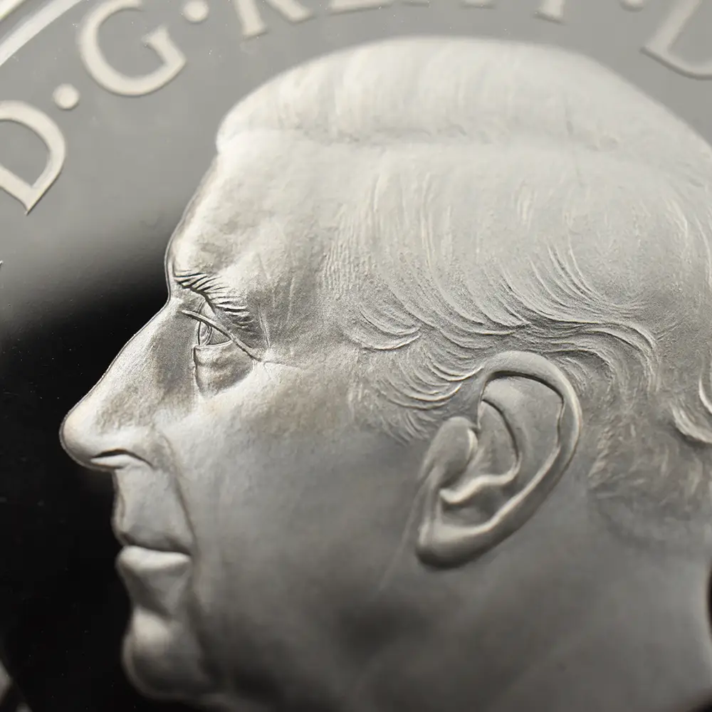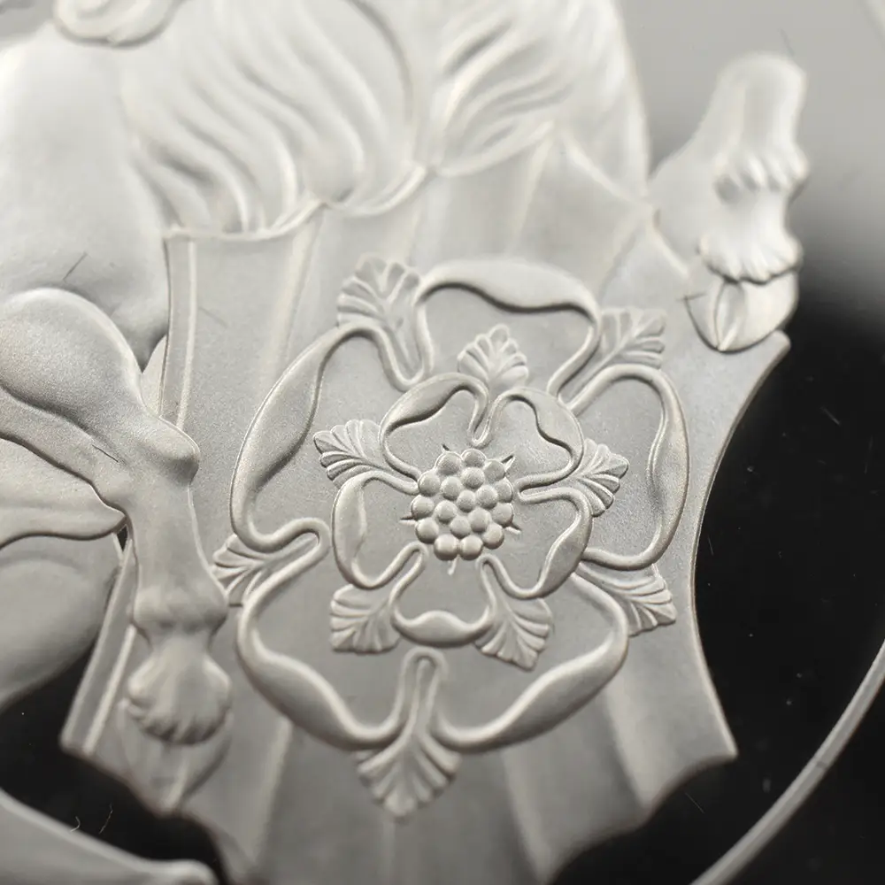 有史以来、人類と生活を共にし、農耕に欠かすことのできない動物であった牛は、全知全能の動物として数多くの文献にも登場し、こと英国人にとっては馬や犬と並んで最も親しみのある動物であることは確かです。15世紀の英国を統一したテューダー家がこの動物の紋章を採用したのはヘンリー7世の時代であり、宿敵ヨーク家出身の国王エドワード4世の娘として生を受けたエリザベス・オブ・ヨークと国王の婚姻関係によってテューダー家にもたらされたことから、その後、英国王室の所有するところのものとなりました。今回ご紹介させていただくコインの裏面には、「クイーンズ・ビースト・コレクション」のデザインとはまた異なった角度からこの動物を捉えたデビッド・ローレンスによる躍動感溢れる現代的な解釈が見られます。牛の胸元には「テューダー・ローズ」の名称で知られる紅白の薔薇から成る古風な紋章が刻まれています。ヘンリー7世によって開かれたテューダー朝の紋章として誕生したこの由緒あるシンボルは、ランカスター家の赤い薔薇とヨーク家の白い薔薇を重ね合わせてデザイン化したものであり、中世英国にて栄華を誇ったこれら二大名家の統合を象徴しています。2022年9月のエリザベス2世の崩御に伴い、新国王として即位したチャールズ3世の治世に受け継がれることになったこの「ロイヤル・テューダー・ビースト・コレクション」ですが、ヘンリー8世ゆかりのこの黒い牛のシンボルが、王の子孫である現国王の治世の始まりを記念するロイヤル・ビーストとしてコイン上にて取り挙げられることは誠に喜ばしいことです。コイン表面にはロイヤルミントの実力派デザイナー、マーティン・ジェニングスによるチャールズ3世の写実性を最大の特徴とする気高い肖像が描かれています。王冠も月桂冠も着用していない国王の自然体の横顔からは、英国王室のあるべき未来像が感じられ好感が持てます。全10種のシンボルによって完結する予定の「ロイヤル・テューダー・ビースト・コレクション」ですが、英国王室600年史を物語る「クラレンスの牛」のリリースによってコレクション全体により歴史的な重厚感が加わり、深い感動を生み出しています。