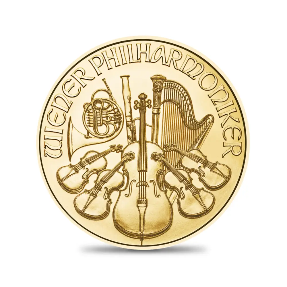 地金型コインのベストセラーとして、1989年以降毎年発行され好評を博している「ウィーンフィル地金型コイン」。オーストリア造幣局がその威信を賭けて世界に贈るこの美しい傑作は、コインマニアのみならず、世界中のクラシック音楽ファンにも贈られるべき究極の記念品です。純度99.99%の純金を用いて制作される当コインは、この種の地金型作品の最高傑作としての地位を確立しています。初発行以来、ウィーンフィルの音楽性を具象化した魅惑的なデザインを踏襲してきた同地金型コインですが、この度、待望の2024年度版が満を持しての解禁となります。コイン表面には、毎年元旦恒例の「ウィーンフィル・ニューイヤーコンサート」の会場として知られるウィーン市内の「楽友協会大ホール・黄金の間」の舞台側の巨大なパイプオルガンが描かれています。冬のウィーンの風物詩となっている元日に開催されるニューイヤーコンサートは、衛星同時生中継によって全世界に配信され、世界中に根強いファンを持つイベントであり、オーストリア共和国にとっては国家的な祝祭でもあります。2020年のみ世界的なコロナ・パンデミックの影響により無観客開催が実施されましたが、その後、再び通常開催となりました。現在、ドイツの名指揮者クリスティアン・ティーレマンが出演する予定の2024年元旦の開催が待ち望まれています。裏面には、オーケストラを構成する管弦楽器やハープがバランスよく配置されており、上部には楽団の正式名称がドイツ語にて格調高く刻まれています。「ウィーンフィル・サウンド」と称される同楽団ならではの明るく伸びやかな音色と音楽の内奥を探る驚異的な表現力はCDやレコードを始めとする各種音楽媒体によって既に実証済みですが、当コインはその極上の音色の魅力をコイン上にて視覚的に再現する最大の成果として注目に値します。そしてコインデザインそのものを愛でる限りにおいて、無限の成功を収めているように思われます。 これからもこの世界で最も「音楽的」な地金型コインが継続的に発行され続けることを願わんばかりです。