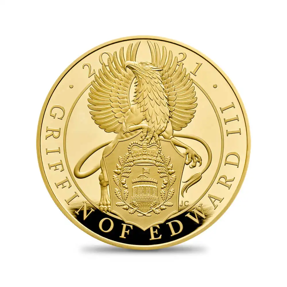 現代英国の文化遺産と言っても過言ではない「クイーンズ・ビースト・シリーズ」は、英国王室ゆかりの紋章学上の動物をコインとして紹介する画期的な企画です。 それらの動物は数百年に渡って英国王室のシンボルとして尊重され、国王の権威をあらゆる角度から強調する目的で選択された王室にとって必要不可欠なものです。 今回取り上げられたグリフィン(グリフォンとも呼ばれています)は中世イングランドに栄えたプランタジネット朝の王、エドワード三世(1312-1377)の治世下に王室の紋章として採用された大変由緒ある表象です。 架空の動物であるグリフィンは、至高の存在である英国王の万能を示す優れた動物と目され続け、エドワード三世による愛顧を経た後、各王朝時代の栄光のシンボルとして歴代国王の紋章を彩って来ました。
