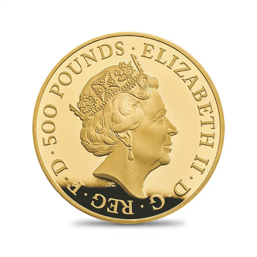 古来数々の伝承に登場するグリフィンですが、伝説の動物としての歴史は非常に古く、ヘロドトスの「歴史」にも登場します。イラン神話においては「Shirdal」という名で登場し、 その後も古代イラン芸術、古代ギリシャ芸術そして中世ヨーロッパの紋章として取り上げられ、広範囲に渡る分野でモチーフとして取り上げられて来ました。紋章学の分野において、 グリフィンは黄金を発見し守護するとの言い伝えから叡智の象徴とされ、鳥の王と百獣の王ライオンが合体しているため「王家の象徴」として珍重され続けています。女王陛下の守護を司るグリフィンは、 当コイン上に描かれることによってさらに力の象徴としての威力を増し、所有者の人生にインスピレーションと安定をもたらす超自然的な存在です。
