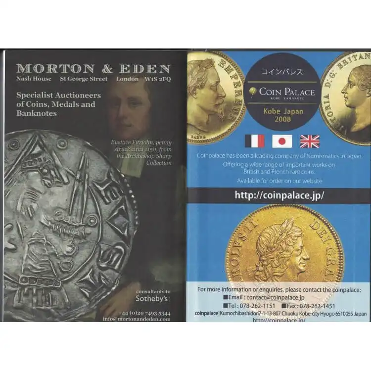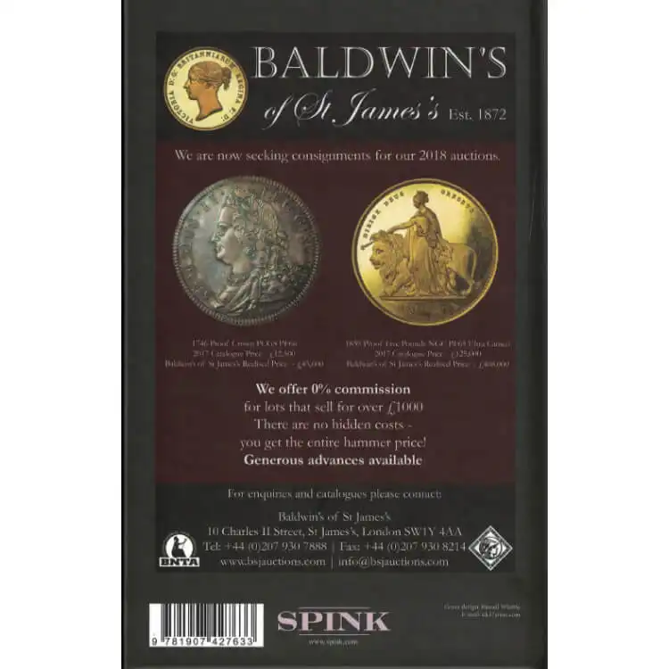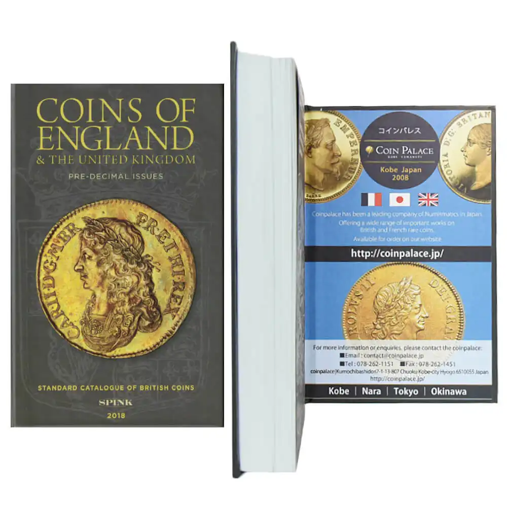 英国の首都ロンドン・ブルームズベリー地区を本拠として4カ国に支店を持つオークションハウス「スピンク」は、コインとメダルの競売と鑑定に特化する世界有数の企業として広く知られています。その創業は時の国王チャールズ2世が共和政を打倒し、王政復古を成就してから6年目の年に当たる1666年のことでした。以来、3世紀以上にわたり、英国をはじめとする世界中のコレクターのニーズを満たす希少価値の高いあらゆるジャンルの芸術品を取り扱い続けました。また19世紀以降には世界初の郵便切手「ペニーブラック」が発行されたことによって急速な発展を遂げた記念切手の取り扱いを開始し、この分野における社の名声を支えます。ヴィクトリア期の1850年代には陶磁器を始めとする東洋古美術の販売を開始し、英国におけるこの分野の草分けとしての地位を確立します。さらに1880年代には、当時存在していたロンドンのソーホー造幣局を傘下に収めたことから小規模ながらも独自のメダルの発行と新規のデザインの創造が可能となり、中世以来脈々と受け継がれていた英国貨幣の伝統を刷新するに至ります。1892年にはコインとメダルを扱う英国最古の機関紙「ニュミスマティック・サーキュラー」の刊行を開始しますが、これは2012年まで120年間継続され、定期的に発行されるコインとメダルのカタログとして高く評価されていました。コインとメダルに関する英国随一の権威として常に王室と密接に関わり続けてきたスピンク社ですが、1897年にはヴィクトリア女王のダイアモンドジュビリー(在位60周年記念)の一環として14種類もの特注メダルを発行し、女王の個人的な愛顧を受けるとともに王室との関係を一層深めます。これらの功績が考慮された結果、ヴィクトリア女王の治世後期の1900年に初めて英国王室御用達商人として認可され、現在もなお希少なメダルの取引を通じて現英国君主エリザベス2世の用命を拝しています。さらに近年においては王室所有の切手の管理を一任され、改めて王室御用達認証状を付与されました。王室との長きにわたる関連性は同社の運営を円滑にするのみならず、英国貨幣界全体における王室の権威を補佐する上でも必要不可欠であったと言えます。上記の実務的な運営とは別に、コインとメダルのための書籍の発行によって、これまでの同社の英国貨幣界における優位が確約されて来たことは言うまでもありません。とりわけ英国コインのための最もスタンダードなカタログとして世界的に知られているスピンク社の「Coins of England」と題する書籍は、コインとメダルのカタログとしての基本的機能のみならず、先史時代から現代に至る英国貨幣の変遷を網羅する参考資料としても重要であり、コレクションを形成する上で欠かせない収集家にとっての座右の書として珍重されているものです。ケルト時代からローマ帝国の支配下に発行された希少な古代コインに始まり、1971年に新貨幣法が施行される直前、1968年までの英国貨幣の精華を豊富な写真と共に610ページにわたって紹介する本書は、英国貨幣に関する第一級の資料として、また将来に向けて優れたコレクションの形成を目指す新しいコインコレクターにとっての指南書としての役割を果たすことでしょう。