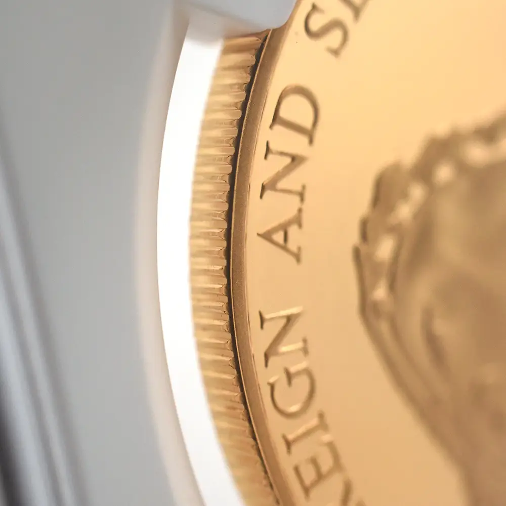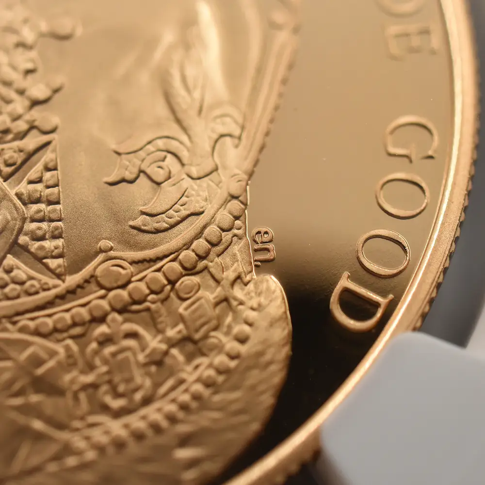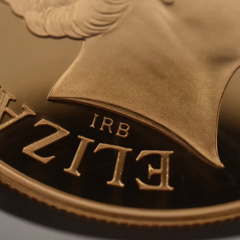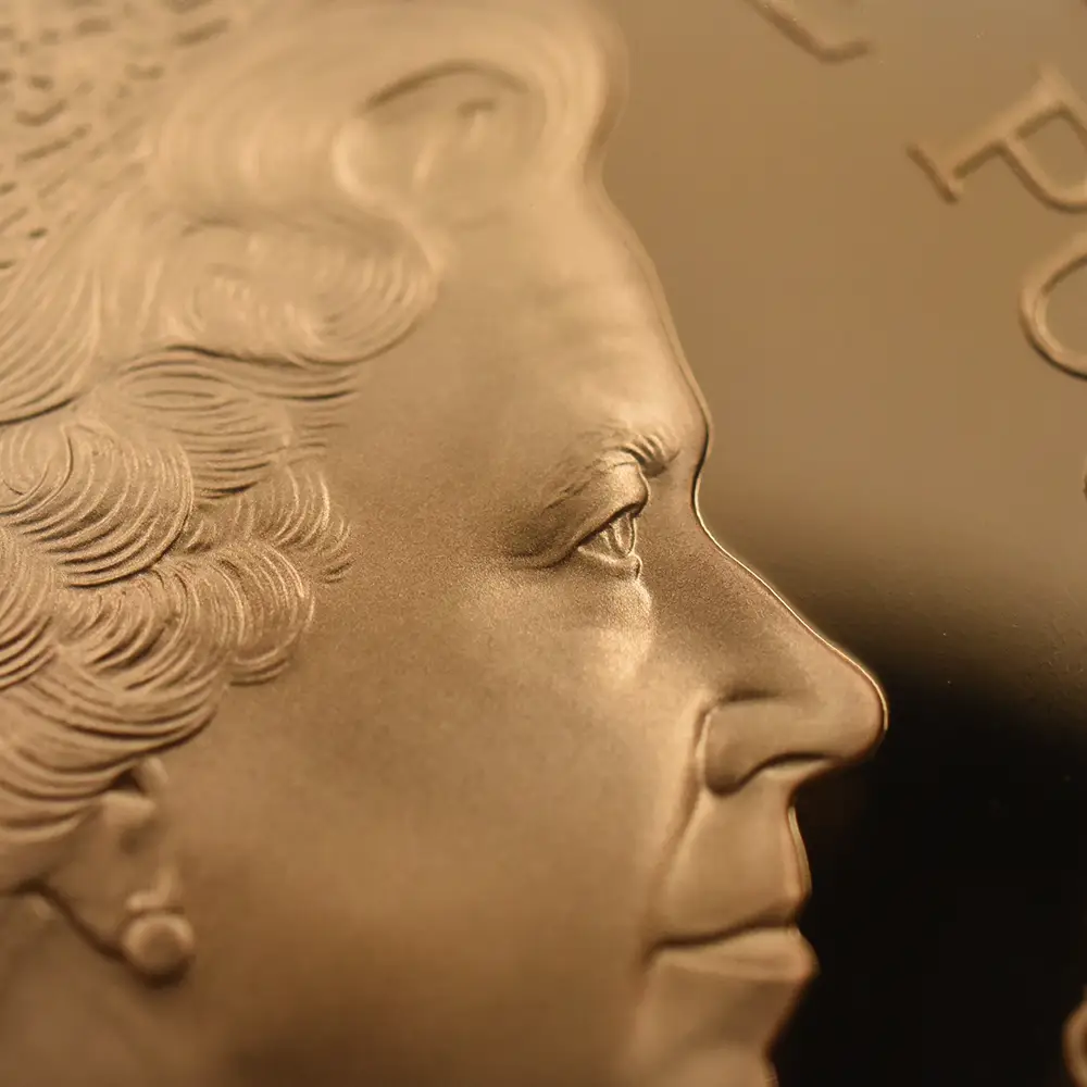 このコインの発行時である2013年には、ヴィクトリア女王の戴冠60周年の記録に続いて史上2人目の英国君主となったエリザベス2世ですが、この歴史的な瞬間をコインのデザインによって表現するのは容易いことではありません。しかし英国ロイヤルミントはこの難題を克服すべく、このコインの裏面に英国王室の権威を象徴する意匠を創造し、60周年という節目に色彩感を与えることに成功しました。女王と共に戴冠式の主役を務めた英国王室所有の秘宝「大英帝国王冠」を画面全体にクローズアップするこの5ポンド金貨の裏面は60年前の生々しい感動を蘇らせると同時に、新しい世代にこの荘厳を極めた儀式の偉容を伝える重要な役目を果たすものです。この歴史的な遺産には数多くの貴重な宝石が使用されており、それらには2868個のダイヤモンド、273個のルビー、17個のサファイア、11個のエメラルド、そして5個の貴重なルビーが含まれています。その中でも特に重要な宝石は「聖エドワードのサファイア」と呼ばれているもので、これは11世紀のイングランドに実在したウェセックス朝の国王、エドワード懺悔王がかつて所有していた指輪から採られたものであると伝えられています。そして「カリナン2世」と呼ばれているダイアモンドですが、これはエドワード7世の治世下の1905年にアフリカのカリナン鉱山で発掘された3106カラットの史上最大のダイヤモンド原石から採られたもので、エドワード7世の生誕66周年の記念品として王室に贈呈されたものです。英国王室の象徴とも言えるこの世紀の至宝を刻む裏面には、それに相応しい厳かな碑文が刻まれています。「君臨し仕えるために立てられた誓い」を意味するこの英語の碑文は、英国女王エリザベス2世の高徳を讃えるばかりか、女王が実際に行動で表現したこの60年間の英国に対する善意を見事に象徴しているように感じさせます。英国に人生を捧げると国家に誓った若き日の女王の戴冠60周年を記念する当コインは、歴史上に名を刻む一人の偉大なる女性の人生を集約する記念碑としての性格を併せ持つものでもあります。