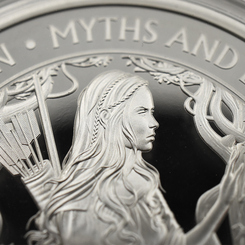 英国にとっての永遠の英雄であるアーサー王を中心として、英国史を代表する綺羅星のごとく伝説上の存在をクローズアップしてこれまでに大きな成功を収めてきた「神話と伝説シリーズ」。英国ロイヤルミントならではの美意識と物語性をコイン上に表出するそれらの秀逸なデザインは、英国人には常になじみの深いそれらの人物像をコイン上にて恒久化する初の機会であったことからも、その芸術性は計り知れません。そして今回はコレクションの最新作として、英国の民間伝承として受け継がれてきたロビンフッドの伝説に恋人として登場する乙女マリアンを始めて取り挙げます。彼女はロビンフッドの初期の伝説、特に中世期のそれにおいては言及されていませんでしたが、少なくともエリザベス朝後期までには2つの戯曲に登場して存在感を発揮していました。いかなる経緯でロビンフッドの物語に登場するようになったかその詳細は不明ですが、その後、しばしば彼の恋人として描写され、高い知性と独立性を兼ね備えた美しい女性として描写されていたため、今日なおも初期の英国文学髄一の強靭な女性とみなされている感があります。このため、特に20世紀後半以降は世のフェミニスト・コメンテーターたちのアイコン的存在として注目を集めるキャラクターでもあります。乙女マリアン(または単にマリアン)は、ロビンフッド物語の現存する最初期のバラードのいずれにおいても描写されていませんでしたが、彼の取り巻き連中の中ではミューズのような存在として描かれるようになりました。1976年に公開されたアメリカ映画「ロビンとマリアン」は、ロビンフッドと恋人マリアンの伝説の後日譚を描いた実写映画として知られています。ハリウッド黄金時代を代表する名女優オードリー・ヘップバーンと、映画007シリーズの初代ジェームズ・ボンド役として一世を風靡したショーン・コネリーが主要2役を演じたことで国際的な注目を集めました。とりわけ当時引退中であったヘップバーンの演技は、マリアン像の典型として高く評価されましたが、彼女自身もまたこの原作に対して早い時期から興味を示していたそうで、実際にはこの役の依頼が来ることを約2年間待ち続けていたという心温まるエピソードが残っています。そして彼女はこの映画での復帰を機に、再び銀幕の世界に帰り咲きました。