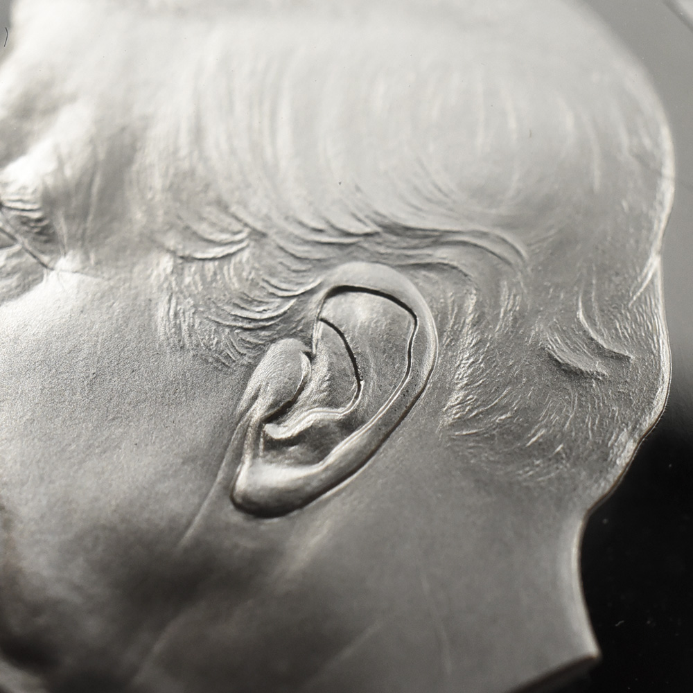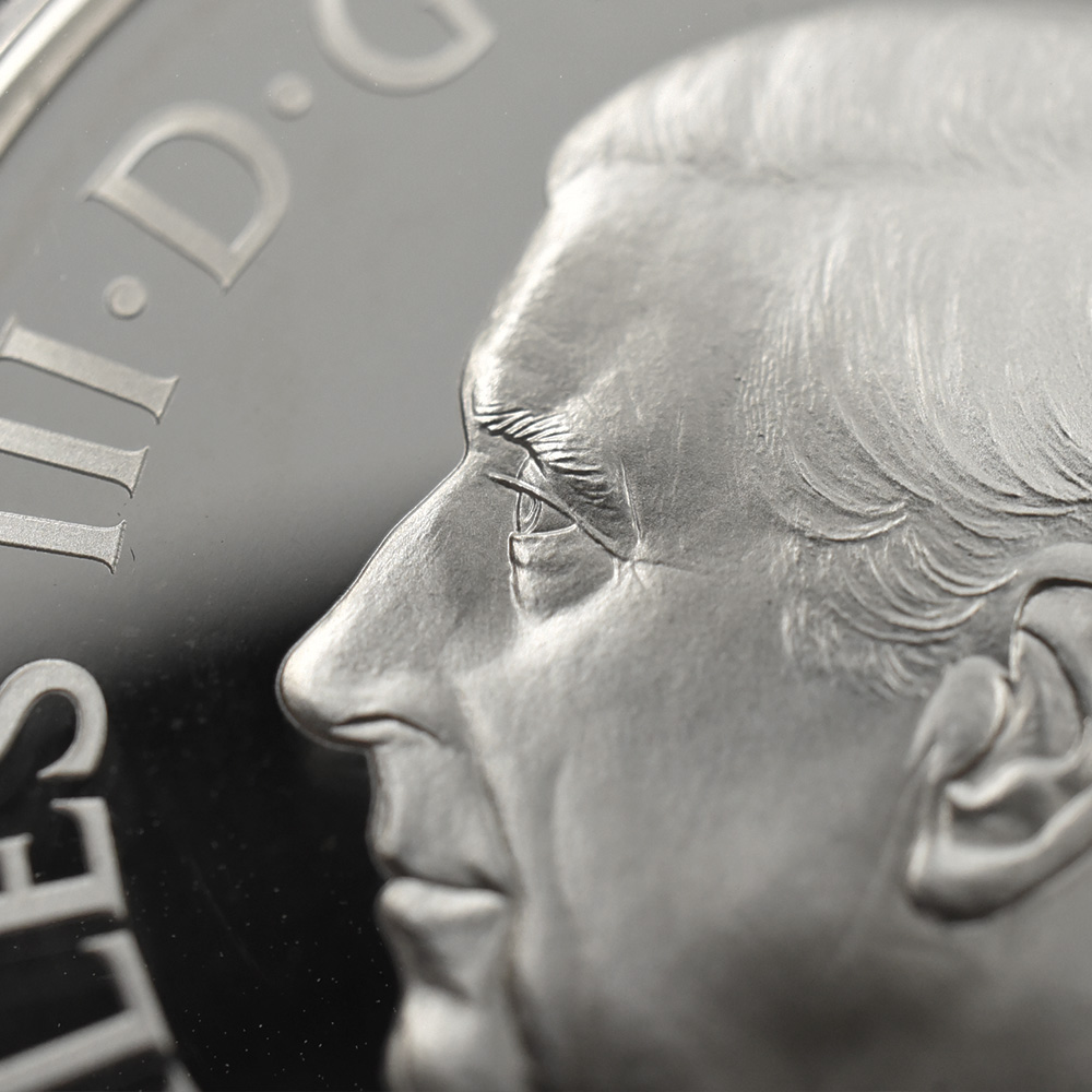数多くの伝承によってロビンフッドとともに英国の真の神話となった乙女マリアン。今回ご紹介させていただくコインは、野性味あふれるマリアンの存在感をクローズアップした美しくも大胆なモダンコインの力作です。裏面に描かれているジャングルのような森の中に一人でたたずむマリアンの姿は堂々としており、女性としての魅力はもちろんのこと、高い知性に裏付けられた圧倒的なたたずまいを堪能させる秀逸なデザインとなっています。コイン表面に描かれているのは、2022年の代替わりに際して英国王位を継承した新国王チャールズ3世の「公式第1コイン肖像」。英国モダンコインの傑作ポートレートとして生み出されたこの名作は、ロイヤルミント屈指の名匠にして現代英国彫刻界を代表する彫刻家の一人と目されるマーティン・ジェニングス氏の想像力豊かな才能の産物です。この公式コイン肖像の採用を巡っては、数多くの作品が応募されたとのことですが、国王自身の推挙を得て見事にその栄冠を勝ち取ったのがこの作品でした。昨年2023年5月6日にはロンドンのウェストミンスター寺院にて戴冠式を挙行された国王陛下でしたが、特別発行された2種の公式肖像を含む記念品としてのコインセットが発表されました。1100年の長大な年月を誇る英国貨幣史上においても写実性にかけては右に出るもののないこのチャールズ3世のコインポートレートは、国王の生きた時代を映し出す鏡のような存在です。73歳と高齢にて即位された国王の治世の繁栄を願わずにはいられないほど美しくも張り詰めた孤高の表情が見事です。すべての英国コインの表面を飾ることになった当ポートレートですが、この度の「神話と伝説シリーズ」の最新作は、表面に刻まれた国王のポートレートが表出する威厳に対して引けを取らない優れた出来栄えを誇示するものです。英国史上稀代の英雄ロビンフッドを魅了した乙女マリアンの美しさにただただうっとりと眺めいるばかりです。