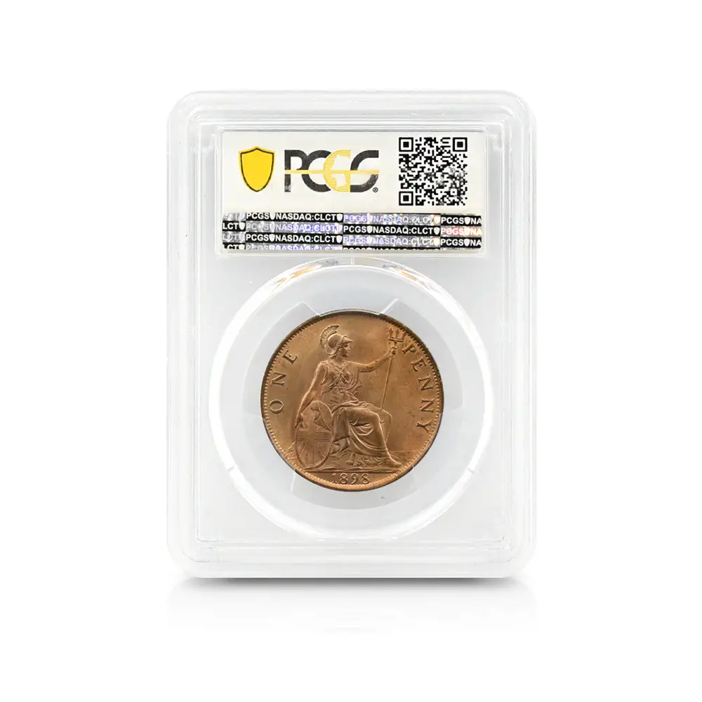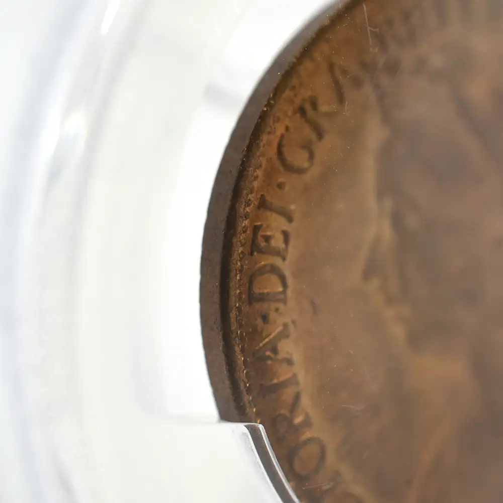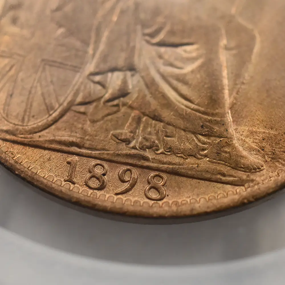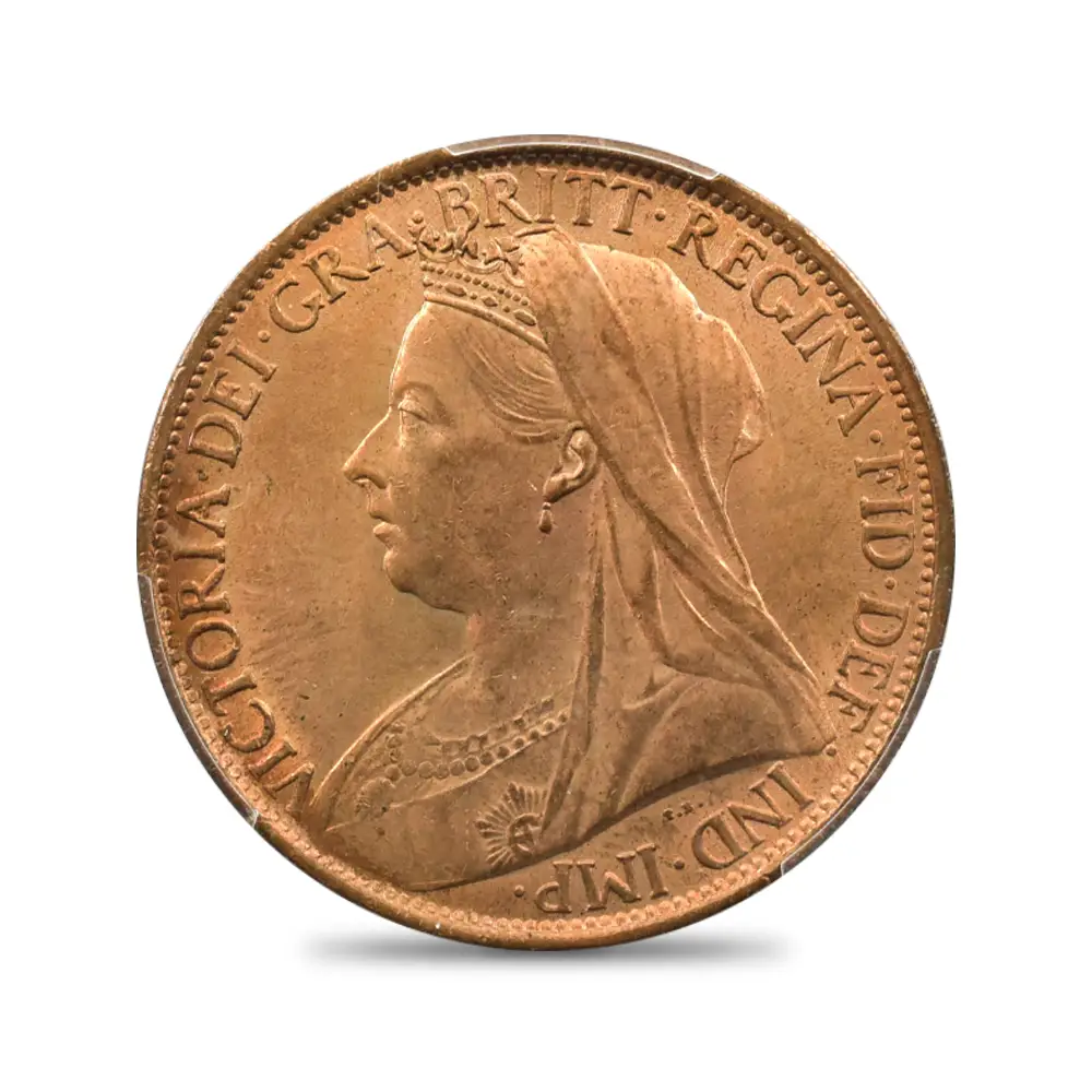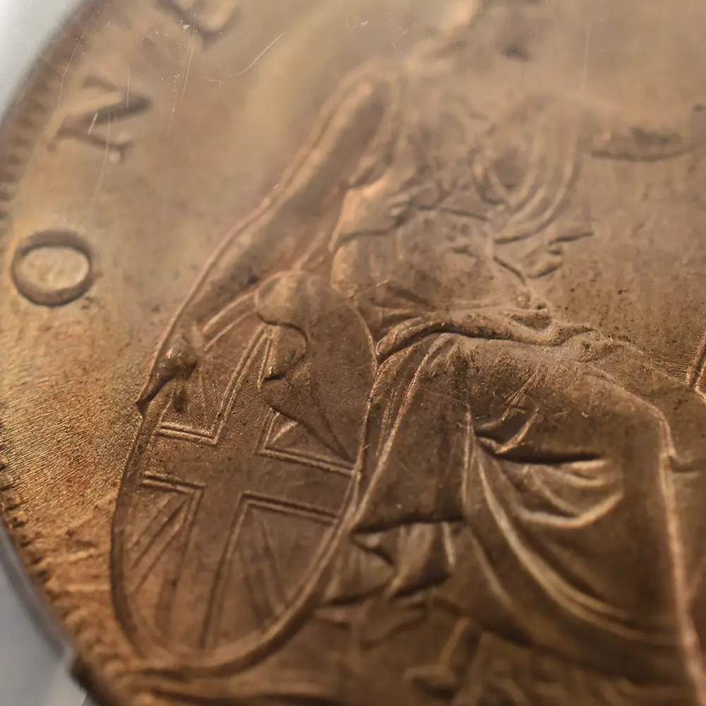 歴史的にも英国史の最盛期と見なされることの多い19世紀ヴィクトリア女王の時代。英国貨幣の世界も例外ではなく、数多くの名作コインが輩出されました。1837年から始まったヴィクトリア女王の治世ですが、その63年7か月の長い在位期間に発表された公式コイン肖像は全部で3種類を数えます。第1公式肖像は「ヤングヘッド」の愛称で親しまれている即位当時の女王の若々しい横顔を描く「公式第1コイン肖像」です。その若々しさを甚く気に入っていた女王の意向によって長期間にわたって使用されていた第1肖像ですが、1887年の在位50周年の年には「ジュビリーヘッド」の愛称を持つ新しいポートレートが「公式第2コイン肖像」として発表されました。長命を誇った女王は、その10年後に在位60周年を迎えますが、それを待たずして前作発表の僅か6年後の1893年に発表されたのが、高い完成度を特徴とする「オールドヘッド」の別名によって知られる「公式第3コイン肖像」でした。今回は、この有名な「オールドヘッド」と同じデザインの肖像を表面に描く1ペニー銅貨をご紹介させていただきます。最晩年のヴィクトリア女王の威厳と知性が伝わってくるこの優れたデザインは、ヴィクトリア期の最後期に発行された当銅貨の歴史的存在感を高めることに貢献しています。コイン裏面には、グレートブリテン島が未だローマ帝国の属領であった時代以降、約2000年間にわたって島を守護してきた伝説の女神ブリタニアが描かれています。ブリタニアが英国貨幣の世界において本格的に取り挙げられるようになるのは王政復古を成就したチャールズ2世治世下の1672年のことで、当時のファージング銅貨上に描かれていました。当コイン上においても戦闘の女神ブリタニアを特徴づける英国旗や三又の槍トライデントが挿入されており、イギリスの守護神としての性格を露にしています。ヴィクトリア女王の治世最後期を象徴するこの「オールドヘッド」ですが、大英帝国の最盛期を象徴する女王のポートレートとグレートブリテン島の歴史を雄弁に物語る女神ブリタニアの肖像を描く当コインは、英国史の輝かしい過去を表現する実物資産として、今後一層の歴史的真価を発揮することでしょう。