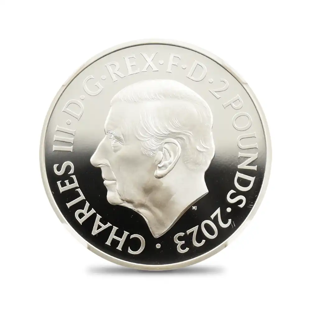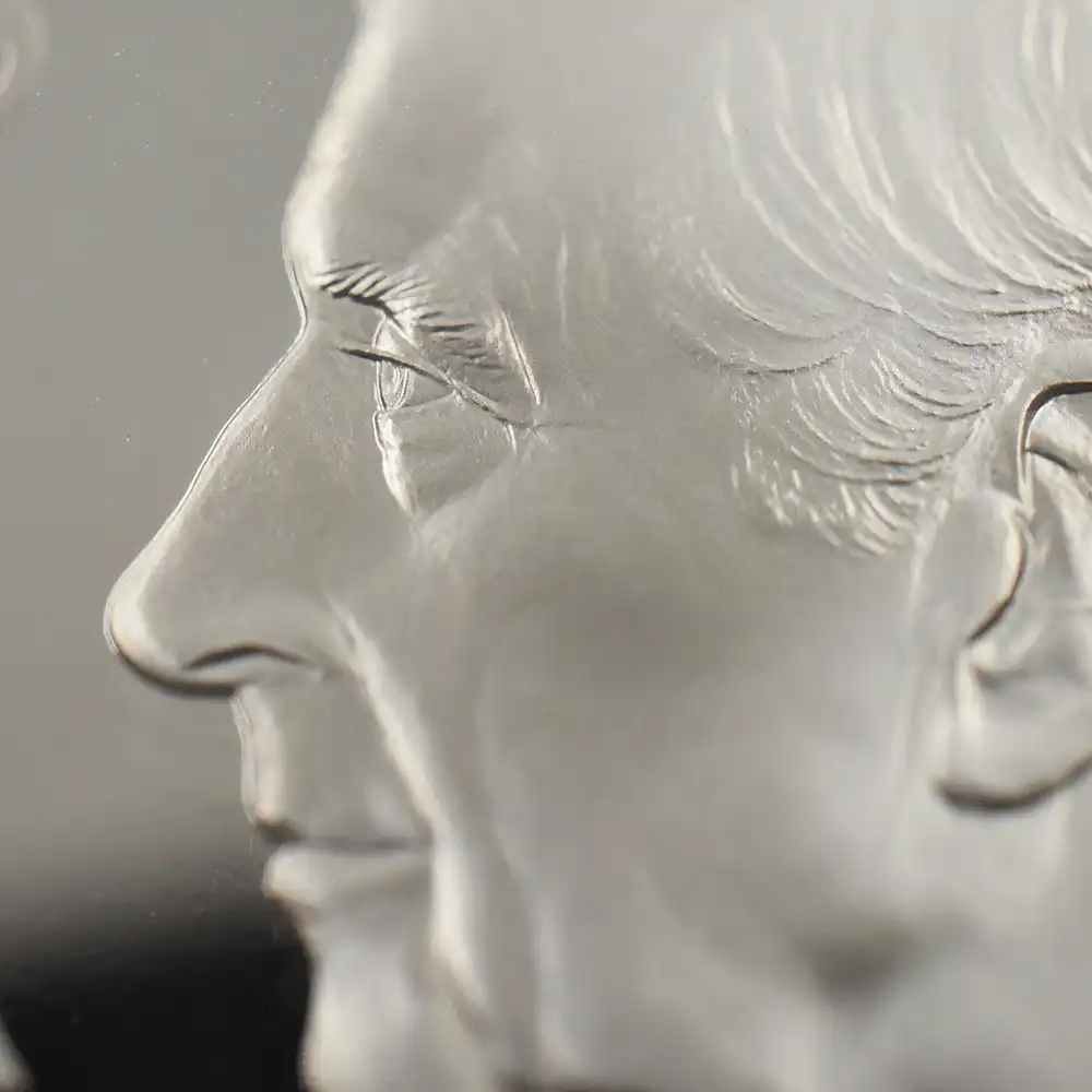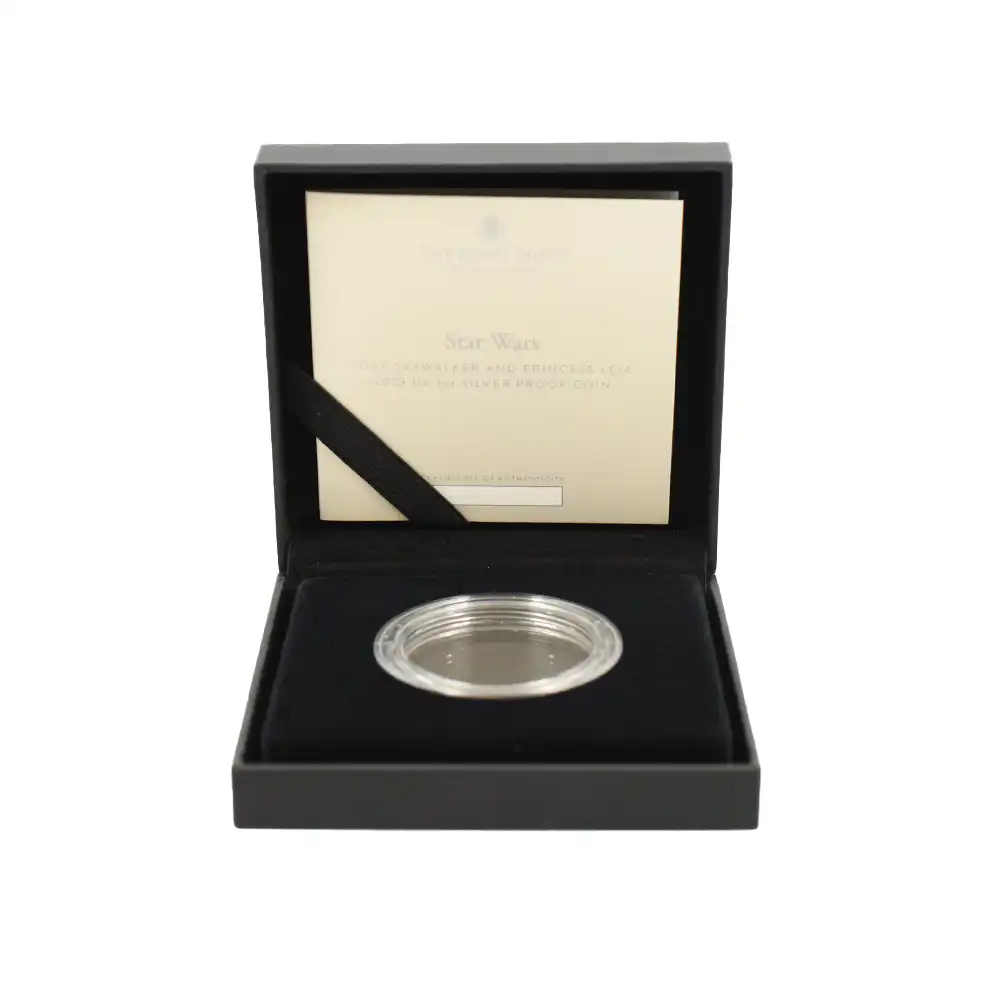 1977年の初公開以降、宇宙を舞台として展開する「スター・ウォーズ」の独特の世界観は人類の近未来を暗示させる諸要素によって広く観衆の心を掴んできました。今回ご紹介させていただくコインは、英国ロイヤルミントが同シリーズの歴史的な成功を記念して全世界に贈るモダンコインの絶対の自信作です。全ての登場人物の中でも、暗黒のシスに立ち向かう善のシンボルとして登場するルーク・スカイウォーカーとレイア姫は、栄誉、威厳、特性を象徴する存在であり、第一作から主要な登場人物としてその存在感を発揮していました。また、これら二者は、この種のサイエンスフィクションもの映画ならではの英雄的役割を確立したことから、その後の同種の映画製作に多大なる影響を及ぼしたことも特筆に値します。コイン裏面は、意匠化された同映画の見事なタイトルを背景として、ルーク・スカイウォーカーとレイア姫の勇壮な姿を浮かび上がらせています。ジェダイの象徴である彼らの威厳のある姿がモダンコインのデザインとして蘇ったことは、世界を代表するサイエンスフィクション物の大作である「スター・ウォーズ・シリーズ」の新時代を暗示する重要なイベントでもあります。コイン表面には、2022年の代替わりに従って英国王位を継承した新国王チャールズ3世の「第1肖像」が掲げられています。現代英国ロイヤルミントの名匠マーティン・ジェニングスによるこの精妙極まりない大作は、英国内においては久しぶりに誕生したコイン・ポートレートの大作として、英国王室の明るい未来を予見させるものです。コイン表面のチャールズ国王が柔和な眼差しで世界を見届ける当コインは、人類の恒久的な平和を約束する近未来志向の大作「スター・ウォーズ・シリーズ」の長期的な成功に祝意を捧げるものであり、ロイヤルミントによるモダンコイン界会心の異色作でもあります。