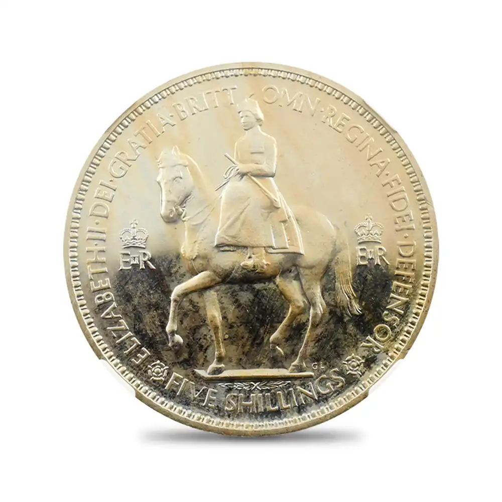 ©トゥルーピング・ザ・カラー式典でのエリザベス2世 1951 pinterest 1953年、エリザベス2世の世紀の戴冠式の年に発行された当5シリング貨は、若き日の女王の気品と今は無き戴冠式当時の古き良き英国の面影をノスタルジックに表現する最も古い時代に属するモダンコインの佳作です。