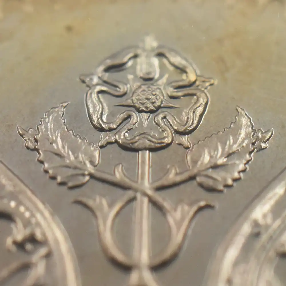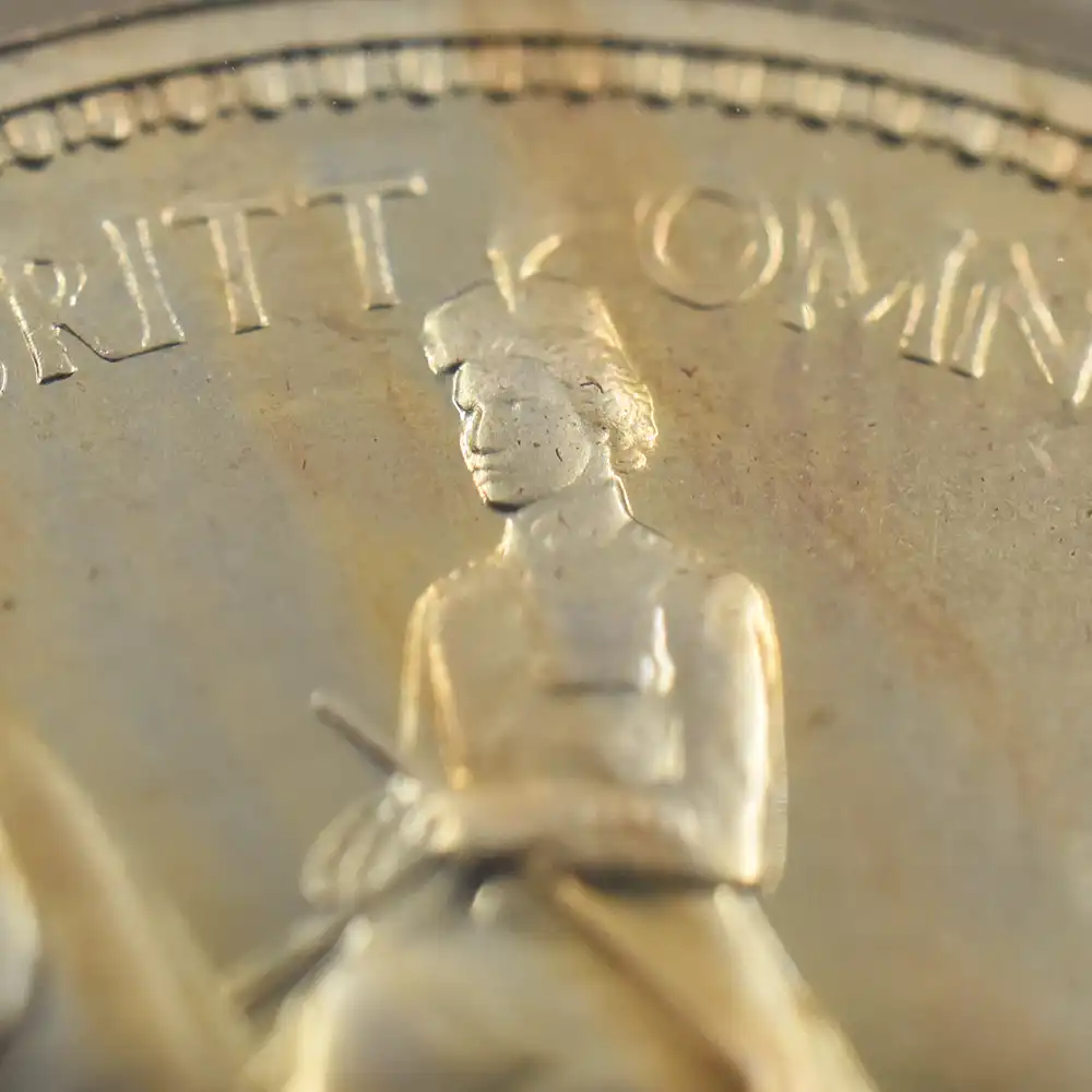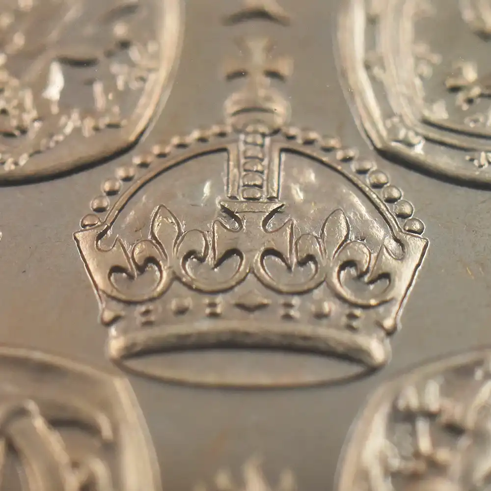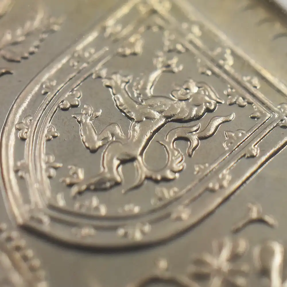 そしてコイン裏面にはイギリス連邦に属する4カ国の国章と共に、それぞれの国家を象徴する花が描かれ、中央に英国王位を示す王冠、さらにコイン下部には戴冠式の年を示す1953の数字が刻まれています。新女王の戴冠式を寿ぐ祝祭感で満たされた当5シリング貨は、その後半世紀以上にわたって英国民を導き、齢を重ねて存在感を増す英国女王の若き日の栄光の軌跡を永遠に刻むアニバーサリーコインの極致です。