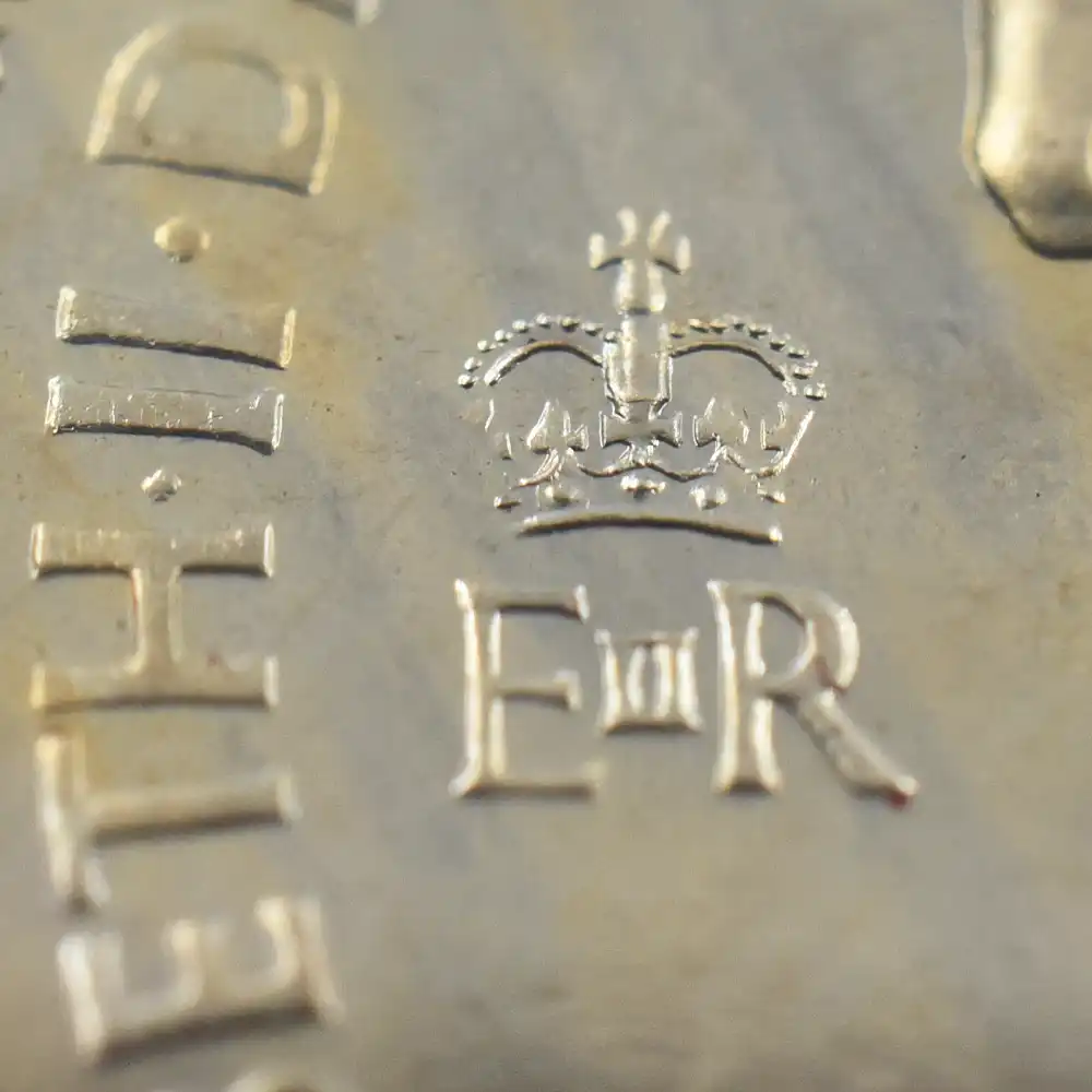 コイン表面には戴冠式当時若干27歳であった自身の愛馬ウィンストンに乗ずる制服姿のエリザベス2世が写実的に描かれています。英国屈指の馬主としても名高い女王陛下ですが、毎年6月中旬に開催される王室主催の競馬のイベント「ロイヤル・アスコット」の主催者として帽子の花が咲き乱れる場内に登場され、この夏の風物詩において一輪の薔薇の如く優美な存在感と共に自身の所有する馬に見入る姿をお見かけすることがあります。