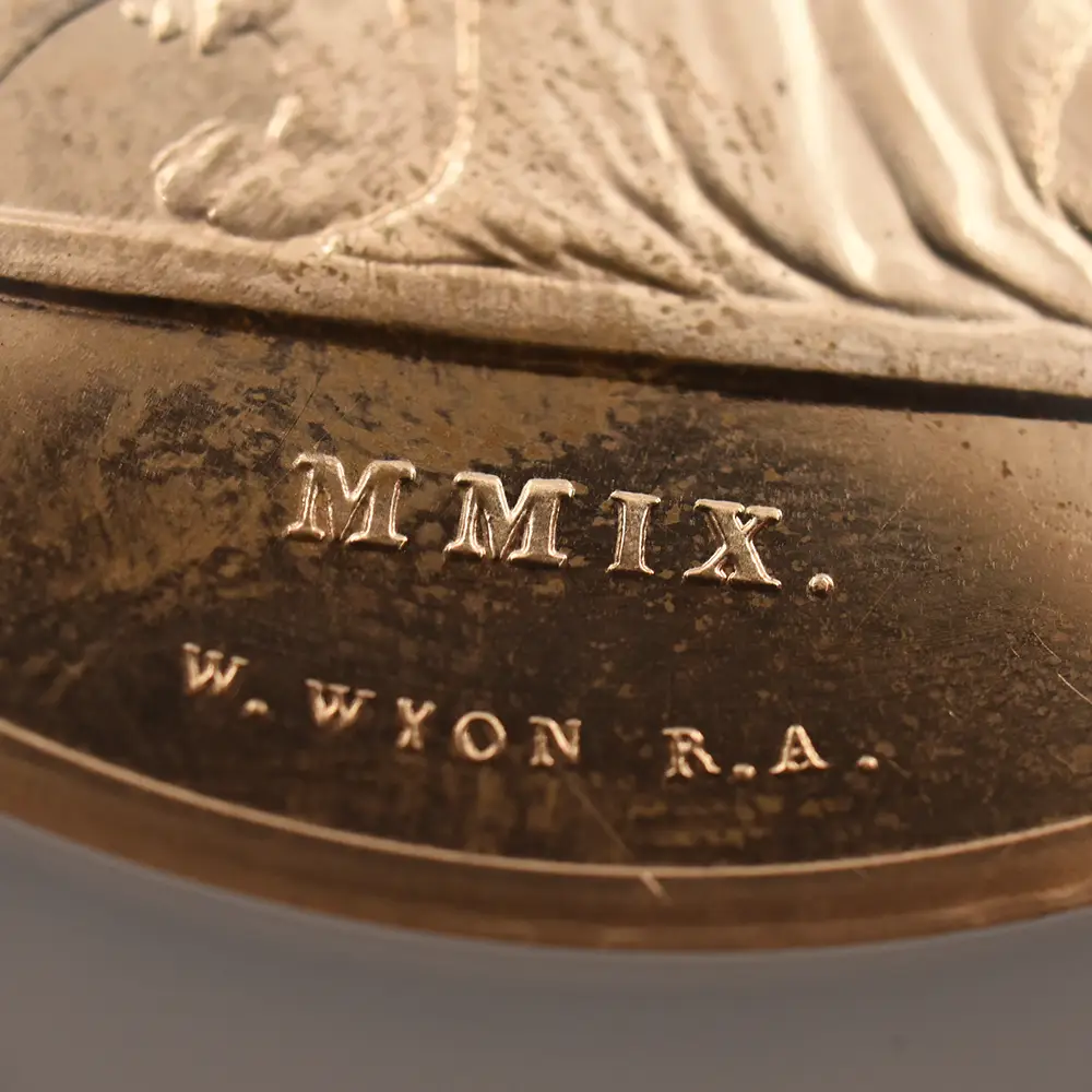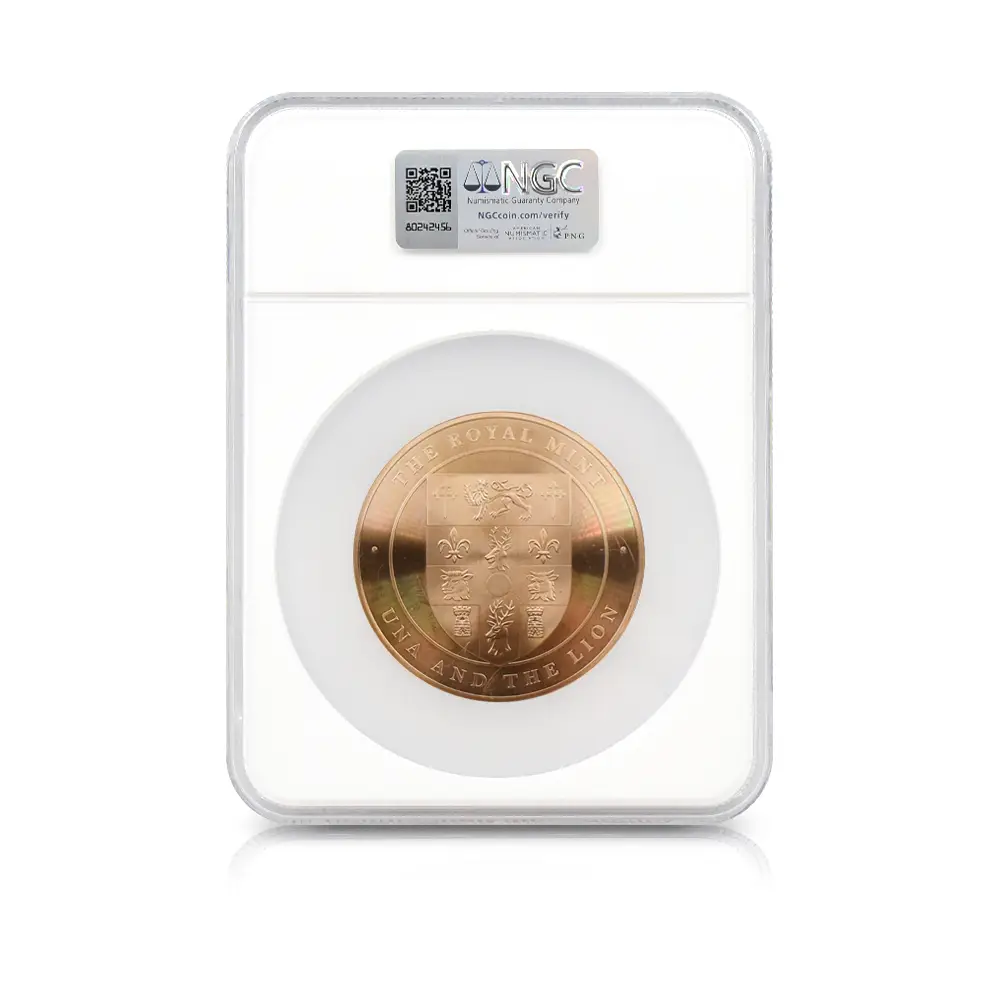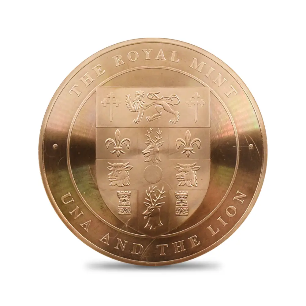 今回ご紹介させていただく作品は、2019年の「偉大なる彫刻家コレクション」第1弾「ウナとライオン」の公開に先駆けて、早くも2009年に制作されていた幻の5枚からなる試作銅メダルセットの内の貴重な一枚です。2019年度版は表面に故エリザベス2世の「公式第5コイン肖像」を、また裏面にヴィクトリア期の「ウナとライオン」のリマスターを描くものですが、当コイン表面の「ウナとライオン」のデザインは2019年度版とほぼ同じですが、最も大きな違いは裏面のデザインです。65㎜の直径の中にはロイヤルミントのオリジナル紋章が描かれており、イギリス連合王国と、中世以来の同盟国であるフランスそれぞれの国章が盾の中にバランスよく配置されています。その上部には「The Royal Mint」の文字が刻まれており、伝統と革新によって栄光を獲得した同造幣局の存在感に永遠の祝意を捧げています。また表面の「ウナとライオン」は、銅メダルならではの質感ゆえか、貴金属上に刻まれた同作品とは若干異なる深い趣を見せていることも確かで、それによって試作品としての精度の高さを強調しています。試作品ということもあり、もともと貴金属を用いて制作する必要はなかったものと思われますが、それが却って試作品としての希少性を生む結果に繋がっていることは興味深い事実です。しかし、熱心なコインコレクターといえども、このような立派な試作品がこの世に存在していたとは思いもよらなかったことでしょう。この作品は、かつてロイヤルミントが主催する非公開のオークションに出品されていたものですが、ラベルに記されている通り5枚セットからの貴重な1枚ということもあり、モダンコインとしては異例の入手困難品となります。また、2019年度版のために試作目的で制作されたのは裏面の「ウナとライオン」のデザインのみで、表面に関しては試作品であるがゆえに元来国王のポートレートを刻む必要性がなかったため、暫定的にロイヤルミントの紋章が付されたのではないかと推測できます。そして我々の前に急に舞い降りてきたこの天国的な美しさを誇る試作銅メダルを観ていますと、やはり美しさのみではなく、類い稀なるものという意味での希少性を兼ね備えたコインこそが、時を経て永遠の傑作としての真価を発揮する可能性を秘めていることを我々に伝えているように思えてなりません。