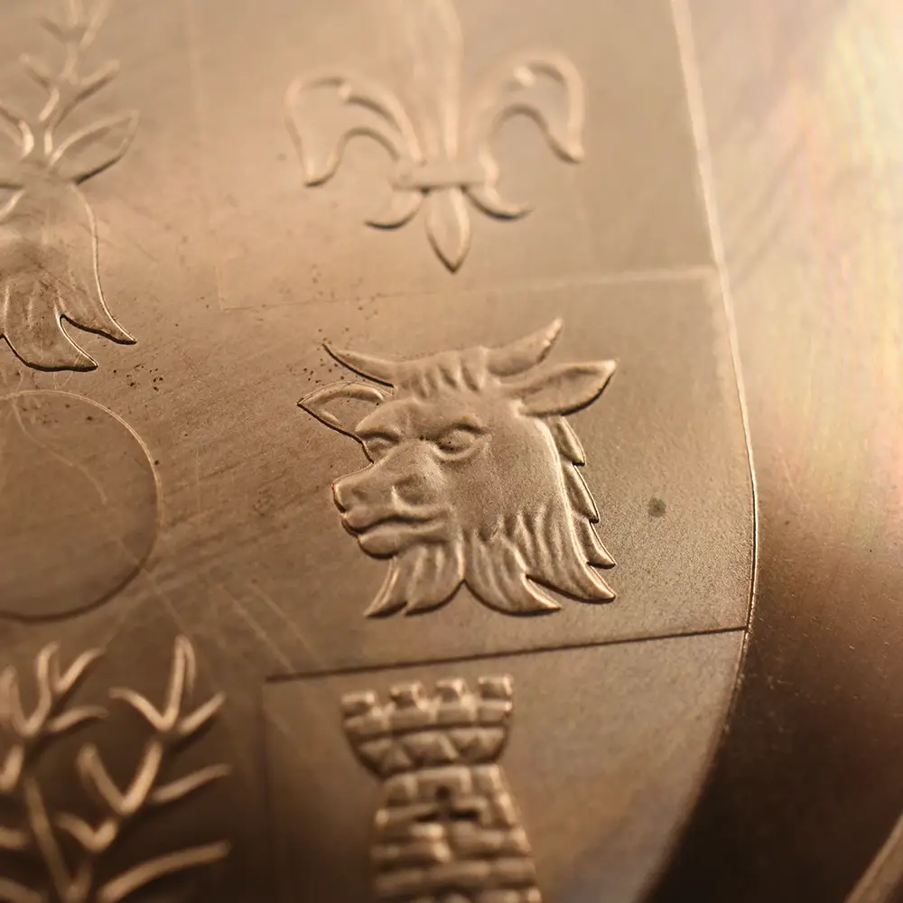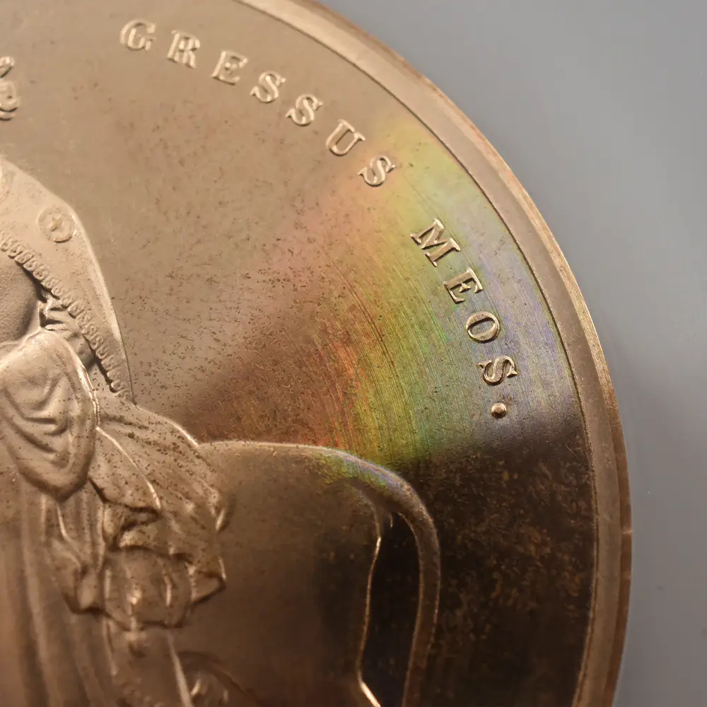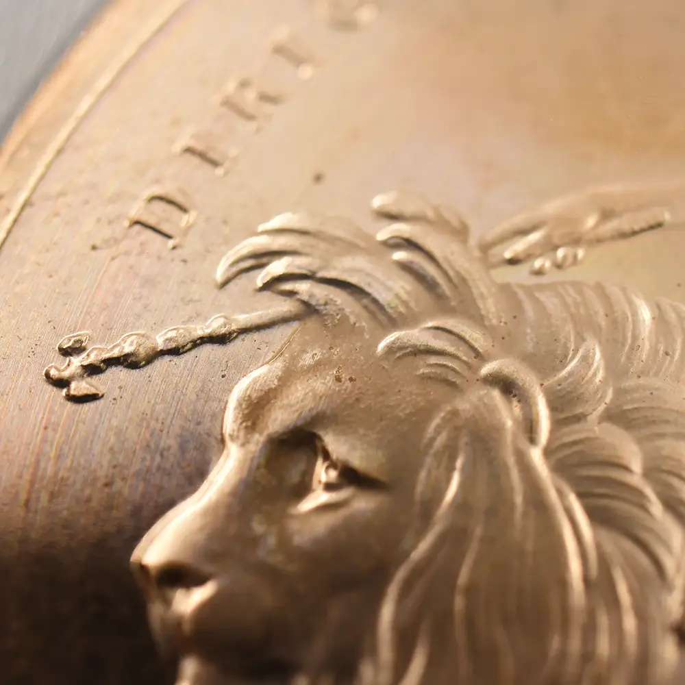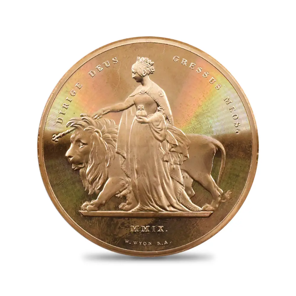 今回ご紹介させていただく作品は、2019年の「偉大なる彫刻家コレクション」第1弾「ウナとライオン」の公開に先駆けて、早くも2009年に制作されていた幻の5枚からなる試作銅メダルセットの内の貴重な一枚です。2019年度版は表面に故エリザベス2世の「公式第5コイン肖像」を、また裏面にヴィクトリア期の「ウナとライオン」のリマスターを描くものですが、当コイン表面の「ウナとライオン」のデザインは2019年度版とほぼ同じですが、最も大きな違いは裏面のデザインです。65㎜の直径の中にはロイヤルミントのオリジナル紋章が描かれており、イギリス連合王国と、中世以来の同盟国であるフランスそれぞれの国章が盾の中にバランスよく配置されています。その上部には「The Royal Mint」の文字が刻まれており、伝統と革新によって栄光を獲得した同造幣局の存在感に永遠の祝意を捧げています。また表面の「ウナとライオン」は、銅メダルならではの質感ゆえか、貴金属上に刻まれた同作品とは若干異なる深い趣を見せていることも確かで、それによって試作品としての精度の高さを強調しています。試作品ということもあり、もともと貴金属を用いて制作する必要はなかったものと思われますが、それが却って試作品としての希少性を生む結果に繋がっていることは興味深い事実です。しかし、熱心なコインコレクターといえども、このような立派な試作品がこの世に存在していたとは思いもよらなかったことでしょう。この作品は、かつてロイヤルミントが主催する非公開のオークションに出品されていたものですが、ラベルに記されている通り5枚セットからの貴重な1枚ということもあり、モダンコインとしては異例の入手困難品となります。また、2019年度版のために試作目的で制作されたのは裏面の「ウナとライオン」のデザインのみで、表面に関しては試作品であるがゆえに元来国王のポートレートを刻む必要性がなかったため、暫定的にロイヤルミントの紋章が付されたのではないかと推測できます。そして我々の前に急に舞い降りてきたこの天国的な美しさを誇る試作銅メダルを観ていますと、やはり美しさのみではなく、類い稀なるものという意味での希少性を兼ね備えたコインこそが、時を経て永遠の傑作としての真価を発揮する可能性を秘めていることを我々に伝えているように思えてなりません。