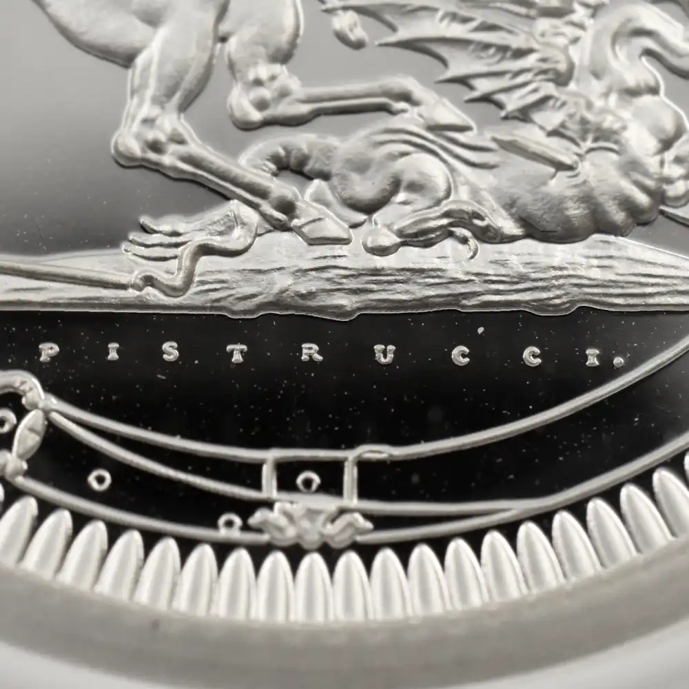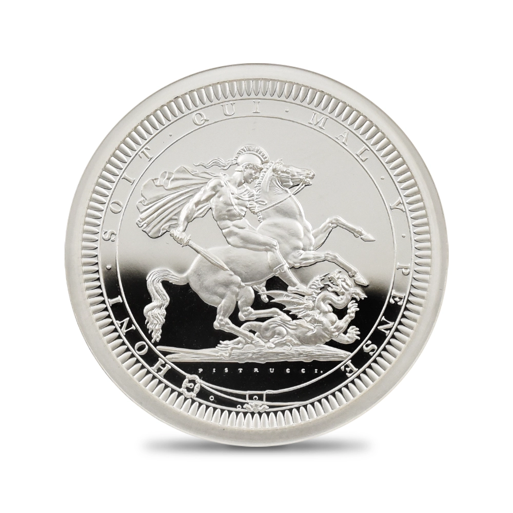 2022年9月8日のエリザベス2世の崩御に際して英国王位を継承した新国王チャールズ3世。「偉大なる彫刻家コレクション」の第4弾「ペティションクラウン」は、新国王を迎えたばかりの英国貨幣界が、モダンコイン屈指の人気コインシリーズの最新作として世に贈り、絶賛されました。それに続いてこの度解禁されることとなった第5弾は、ワイオンと並んで19世紀初頭の英国貨幣界を牽引した偉大なる彫刻家、ベネデット・ピストゥルッチ(1783-1855)の最高傑作「聖ジョージの竜退治」に捧げられます。ナポレオン戦争後の混乱の中、底知れぬ才能を秘めたこのイタリア人芸術家は、当時のロイヤルミント主任の招きに応じてイングランドに移り住み、そこを終生の地としました。ピストゥルッチの卓越した技量は当時のロンドンの上流階級の顧客層の愛顧を得て広まり、世に出たばかりのワイオンの職人技と双璧を成すほどに高く評価されていました。しかし二者の作風そのものは比較できない程に異なるものであり、また個性的でもありました。偉大なるコイン彫刻家一族の末裔として世に出たワイオンは生まれながらの職人肌の彫刻家であり、その仕事は非常に着実で安定していたと言われています。一方、ピストゥルッチはと言いますと、どちらかと言うと天才型の芸術家で、閃きに満ちた底光りするような強烈な作風を特徴としていました。ピストゥルッチが「聖ジョージの竜退治」の意匠を創造した頃の英国社会は、未だナポレオン戦争後の経済的荒廃から完全に脱却できていなかったものの、ロイヤルミントを中心とする英国貨幣界は金本位制を主軸とする新たな貨幣改革を推進する兆しを見せ始めていました。そのような社会背景の下に、一連の新たな貨幣の発行が急がれましたが、それらの新貨幣のデザインの一つとして採用されたのがこのピストゥルッチの「聖ジョージの竜退治」でした。古代ローマ時代の伝説の聖人ゲオルギウスの竜退治の場面を描くこの意匠は、古今東西の傑作コインの主題の中でも驚異的な人気を誇るものであり、同コレクションの第5弾として相応しいものであると言えます。また、ウィリアム・ワイオンとトマス・サイモンに続いて、ベネデット・ピストゥルッチの作品が選定されたことによって、歴史的コインコレクションとしての意義を強調しています。槍で悪の象徴であるドラゴンを退治する馬上の聖人の颯爽たる姿を、英国君主の仮の姿と見なすことも可能です。当復刻版の表面には、2023年5月6日に戴冠式を挙行したチャールズ3世の様式感溢れる「公式第1コイン肖像」が描かれています。コイン表裏に英国君主の威厳を掲げる当コインは、今日まで途切れることなく脈々と受け継がれてきた英国王室の未来永劫の安泰を象徴する新時代の傑作であると言えます。