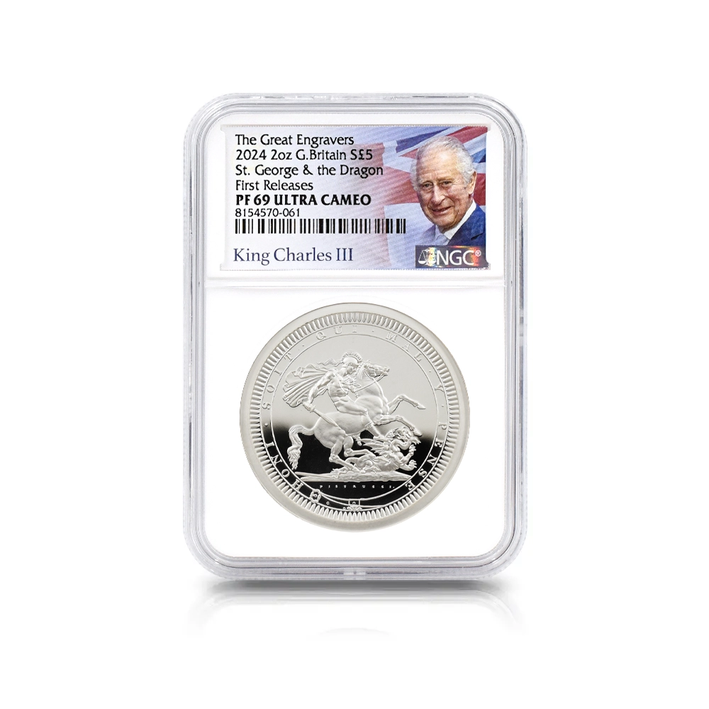 2024 チャールズ3世 ピストルッチ作聖ジョージ竜退治 5ポンド2オンスプルーフ銀貨 ファーストリリース NGC PF69UC チャールズ3世ラベル 箱付き