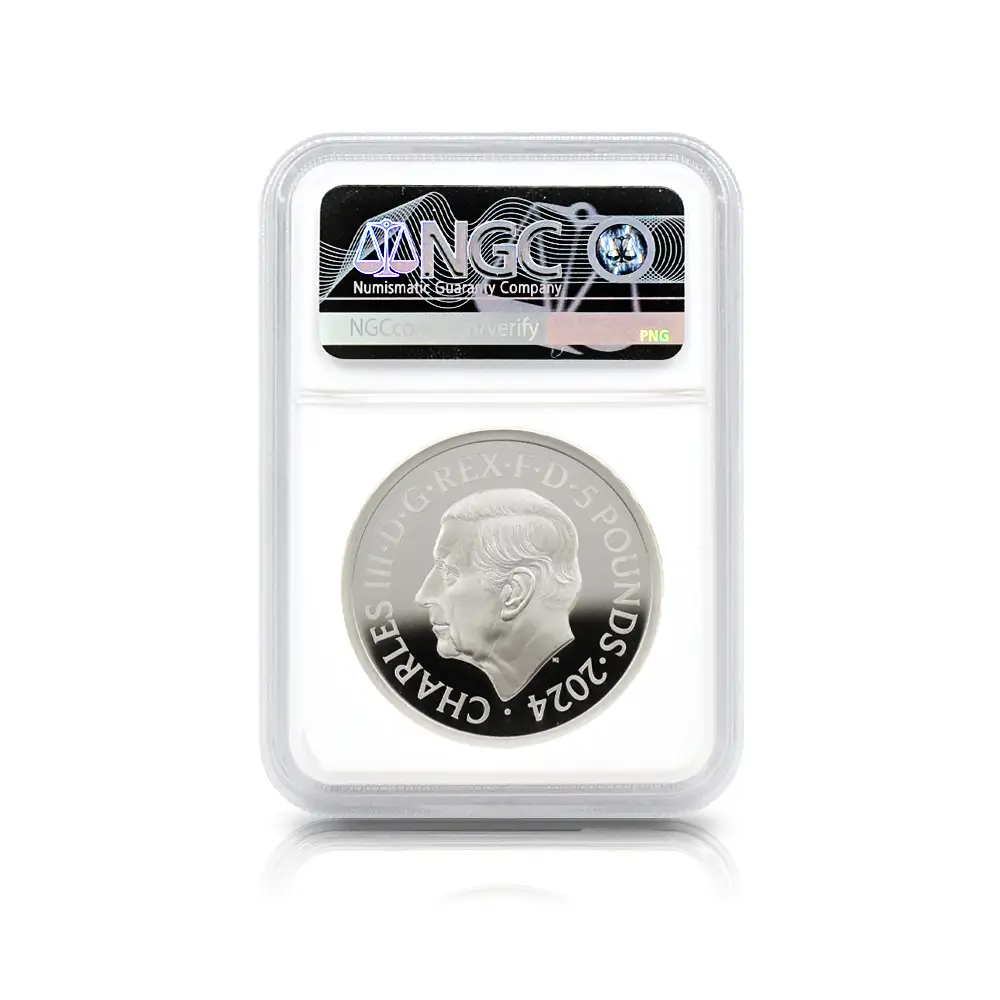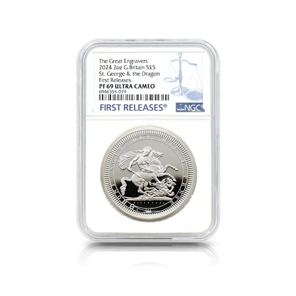 2024 チャールズ3世 ピストルッチ作聖ジョージ竜退治 5ポンド2オンスプルーフ銀貨 ファーストリリース NGC PF69UC 箱付き