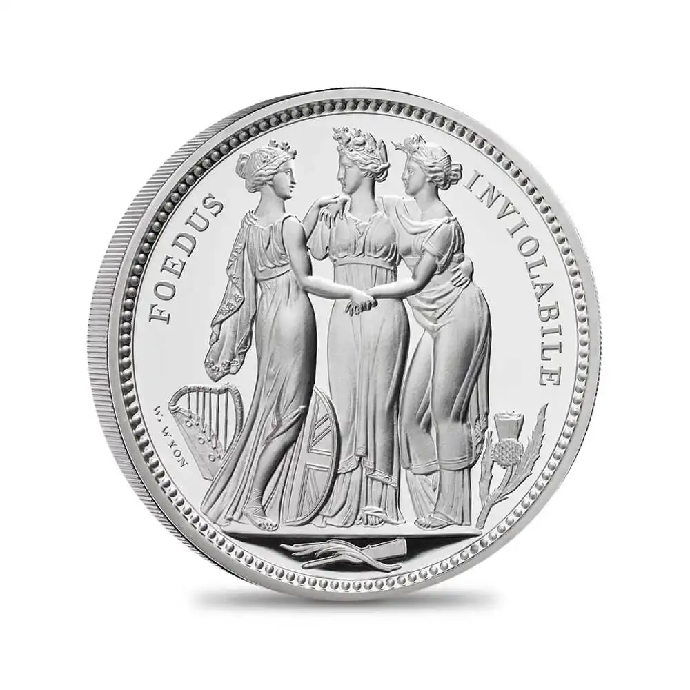 全世界的な脚光を浴び、貨幣史上空前の人気を誇ったロイヤルミントによる2019年「偉大なる芸術家シリーズ」の「ウナとライオン」に続く第2弾の満を持しての登場です。今回選定されたのは前回と同じく19世紀最高のコイン彫刻家ウィリアム・ワイオンによる最初期の傑作「スリーグレーセス」です。ワーテルローの戦いによって閉幕したナポレオン戦争後の英国社会の安定と平和を背景とする三人の女神たちの無言の対話を描くデザインによって称賛され続けています。ギリシャ神話に材を求めて描かれた三美神は、それぞれ若さ・歓喜・気品を象徴しており、崇高な空気を醸し出しています。19世紀初頭に頂点を極めた新古典様式を基調として描かれる三人の姿は、足元に見られるそれぞれの国家のシンボルと共に連合王国の確固たる統一を暗示しています。当銀貨最大のメッセージは三美神の繊細優雅な趣と、その背後に厳然として存在する英国の政治的宿願ではないでしょうか。