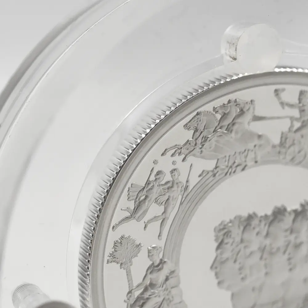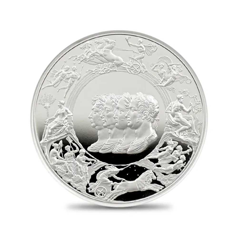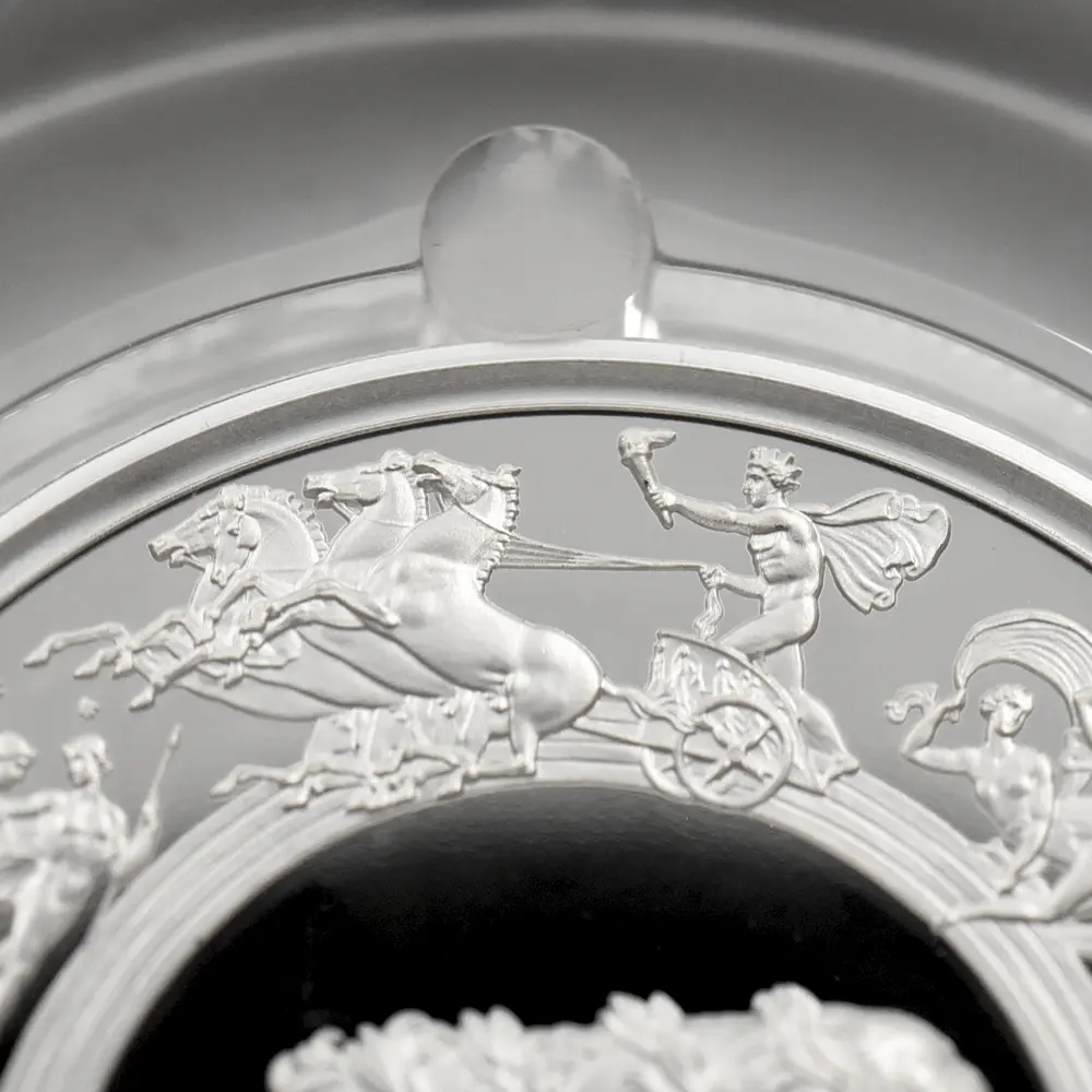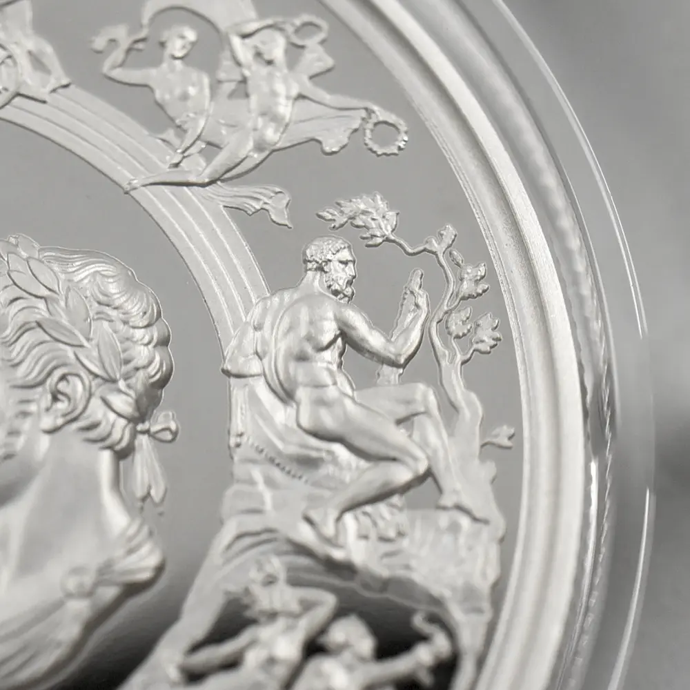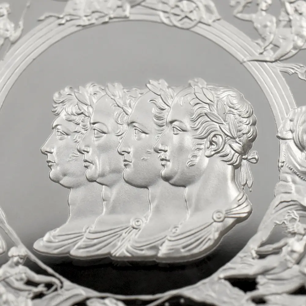 ©The Royal Mint コイン彫刻家の第一人者として名を馳せたピストゥルッチでしたが、イタリア人芸術家の独壇場でもあるカメオ細工の技法を活かしたメダルの制作は、それにもまして精巧を極めていました。過去の歴史的なコインとメダルの傑作を現代に紹介する重要な使命を掲げるロイヤルミントによる「 偉大なる彫刻家シリーズ」は、貨幣史上に刻まれる傑作を創造したいにしえの名彫刻家たちに捧げられる感動のオマージュです。中でも第1弾「ウナとライオン」は、現時点におけるモダンコインの最高傑作として空前の人気を博しました。今回ご紹介させていただく作品は「偉大なる彫刻家シリーズ」の第6弾に当たる作品で、ピストゥルッチが制作したメダルの最高峰「ワーテルロー・メダル」が取り挙げられます。世界史上での歴史的な快挙とされるワーテルローの戦いでの英国軍の勝利ですが、ナポレオン率いるフランス軍の敗退によって再びヨーロッパ全体に平和がもたらされました。オリジナルメダルの表面のみを裏面として復刻するこのリマスター版ですが、現代作品ならではの造形美を金属の輝きが際立たせています。