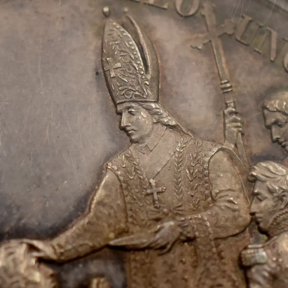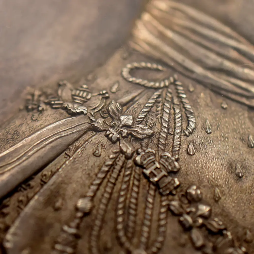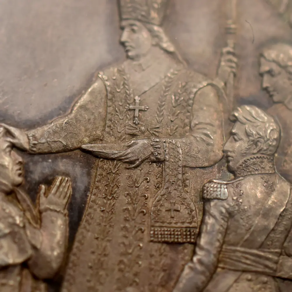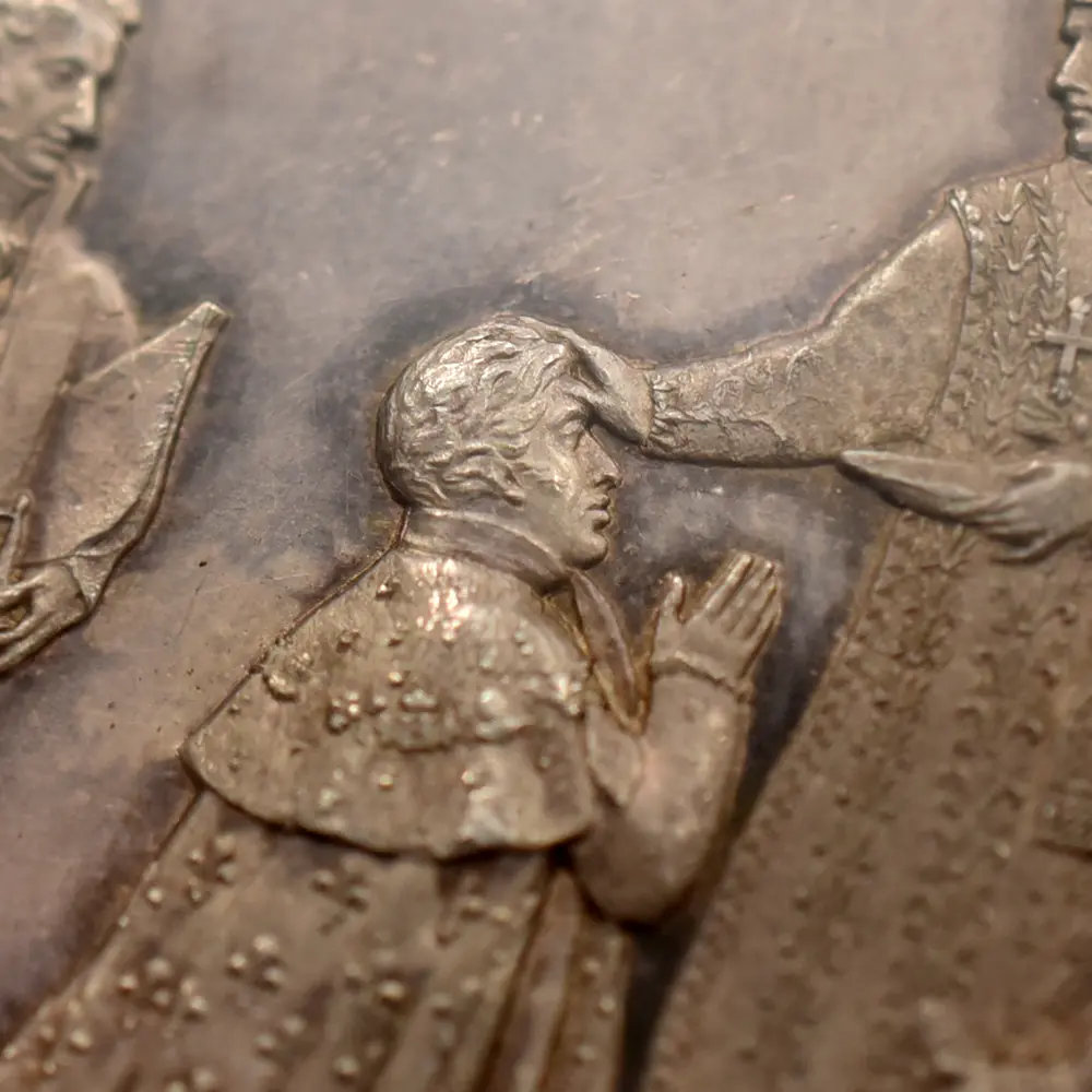 フランスの歴史団体は歴代フランス王の中で唯一フランス国内に埋葬されていないシャルル10世の遺骨をフランス国内に返還する運動を起こしていますが、終焉の地であるノヴァ・ゴリツィアの市長や住民は、すでに地元の歴史の一部になっている国王の遺骨の返還には消極的とのことです。今回ご紹介させていただく作品は、即位の翌年にランスで行われた戴冠式の記念に発行されたシャルル10世のための戴冠記念銀メダルです。メダル表面には、復古王政の象徴である大型の宝冠を頭上に戴くシャルル10世の右向き肖像が掲げられています。秀逸な写実性を見せる国王の横顔は圧巻であり、頭髪や衣装なども君主の威厳を際立たせることに貢献しているように見受けられます。そしてメダル裏面ですが聖職者からの祝福を受けて跪くシャルル10世が情感豊かに描かれています。床まで垂れる長いマントには正に王者の風格が感じられ、短い期間ではあったもののフランスを統治する運命を担って生まれた偉大なる人物の実在を感じさせます。表裏に国王シャルル10世の生き様を刻む当メダルは、19世紀初頭のフランスの激動の時代を生き抜いた偉大なる帝王の思い出に捧げられる歴史的な逸品です。