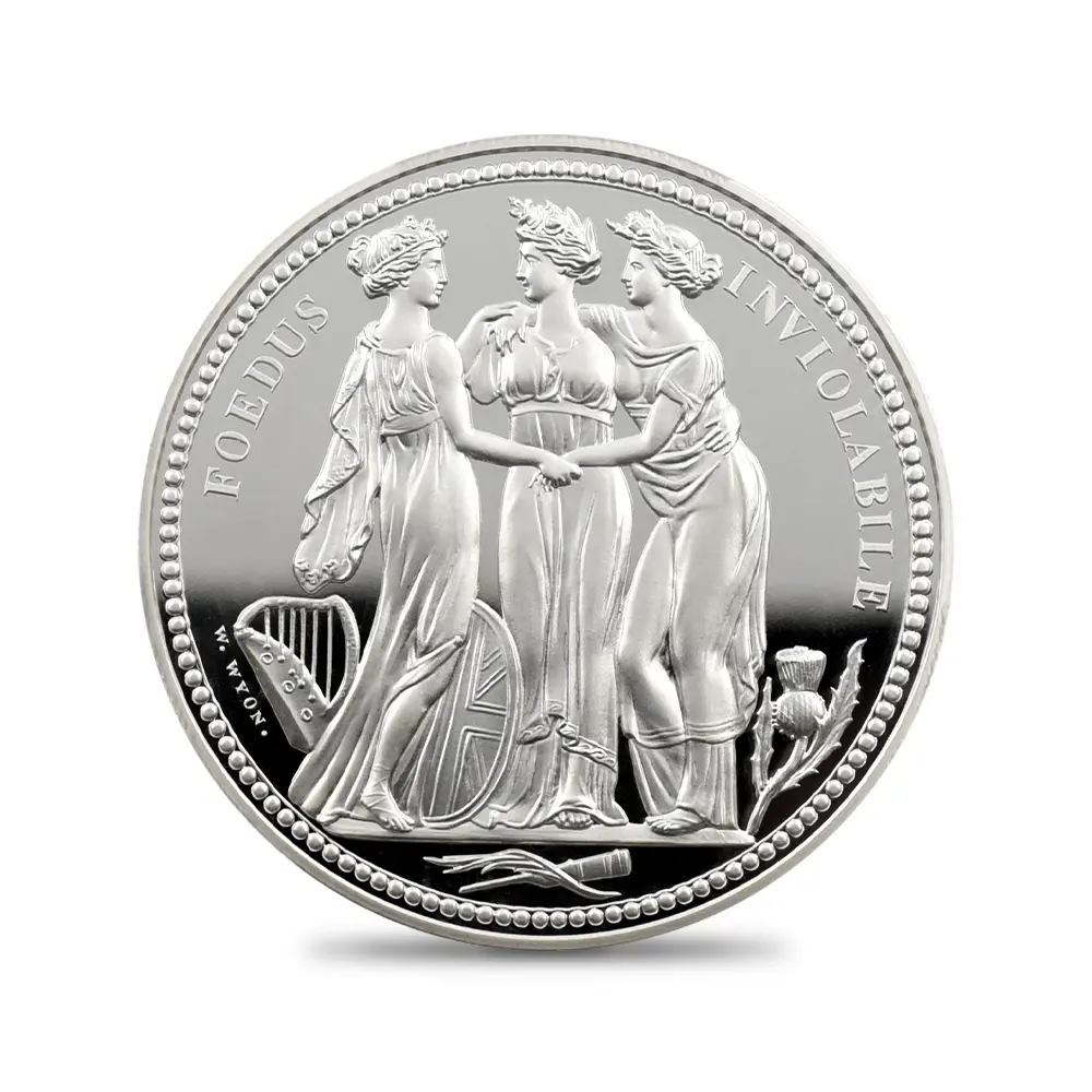 ナポレオン戦争後の英国と同盟各国との協調関係と恒久的な平和を絵画的に表現したその優れた意匠は、ジョージ王朝末期からヴィクトリア朝初期の英国において一世を風靡した芸術様式として知られる新古典様式のコイン上における一典型として、貨幣学史上において特筆されるべき内容を持つものです。同様式の粋を極めたワイオンならではの魅力あふれる作風は、英国コインの永遠の主題として、21世紀の今日まで脈々と受け継がれて来ました。
