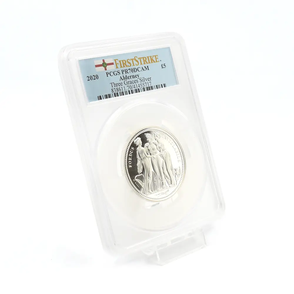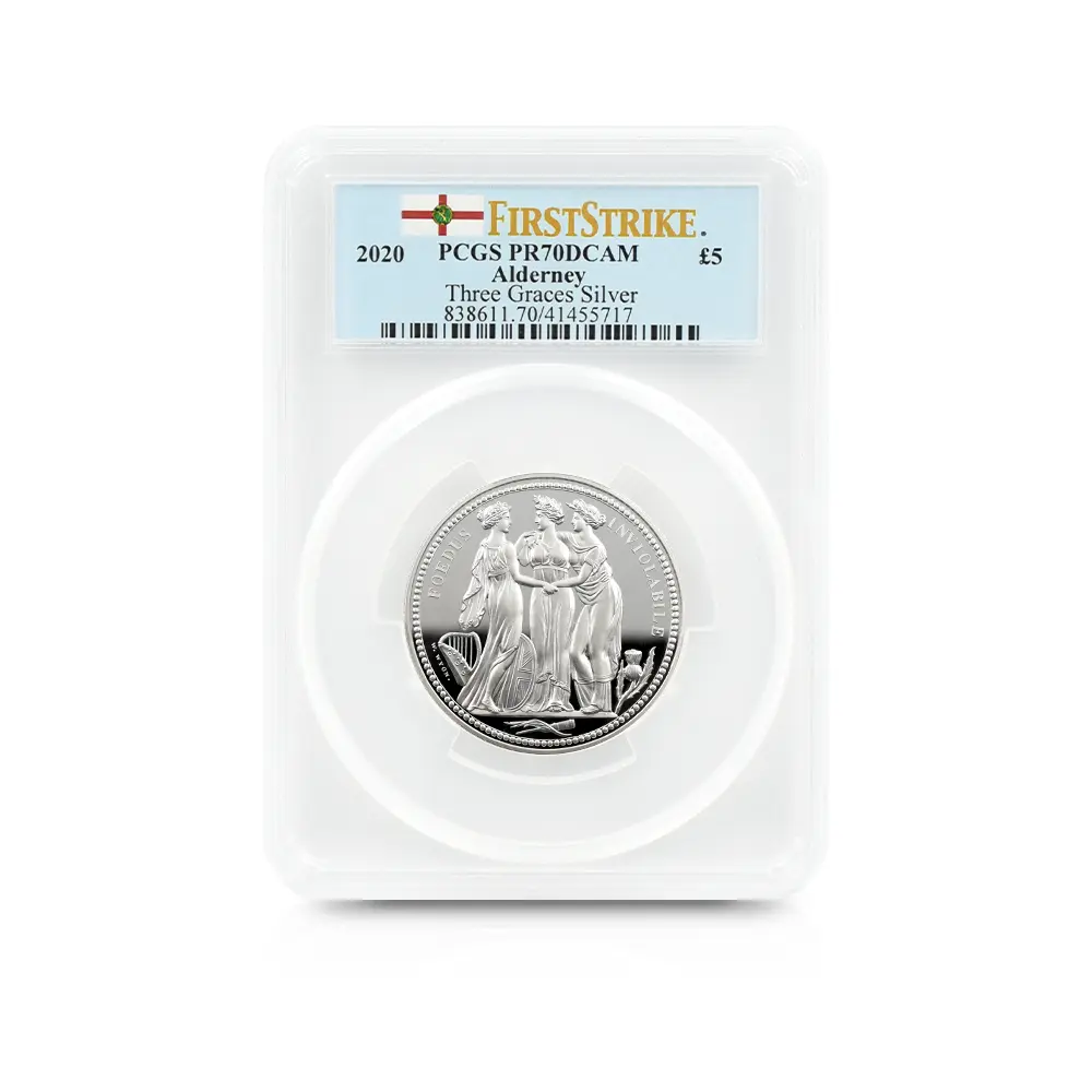 オルダニー島 2020 エリザベス2世 スリーグレーセス 5ポンド2オンス 銀貨 ファーストストライク PCGS PR70DC 箱付き
