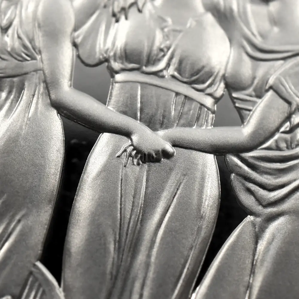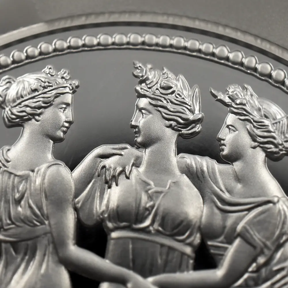 ギリシャ神話の最高神ゼウスを父とする3人の娘達を描くワイオン版「スリーグレーセス」は、19世紀前半に最盛期を迎えていたイタリアの大彫刻家アントニオ・カノーヴァの一連の彫刻群からインスピレーションを得て制作された貨幣芸術の精華です。立体性を表現手段とする彫刻から着想を得ているにもかかわらず、平面的なコイン上に対象を描き立体感を表出するワイオンならではの手法は、この作品上において遺憾なく発揮されていると言えます。