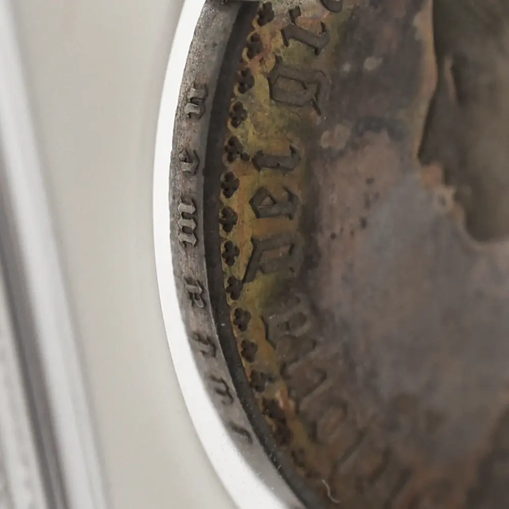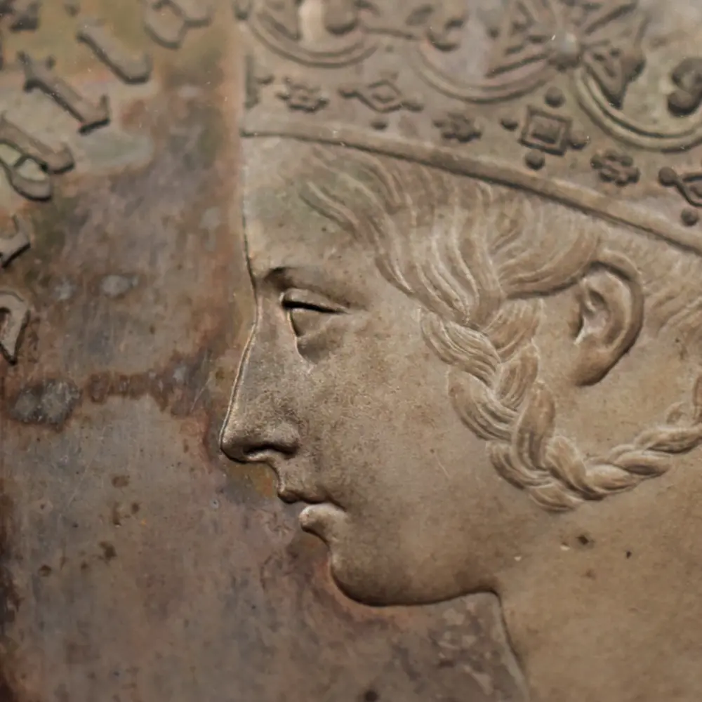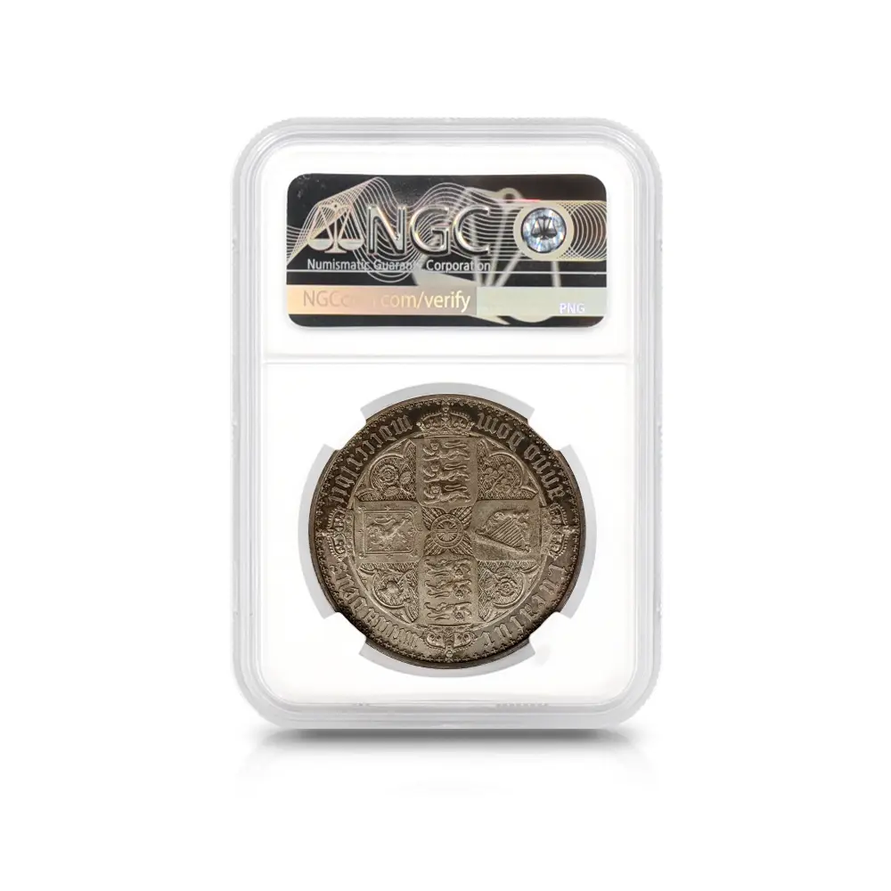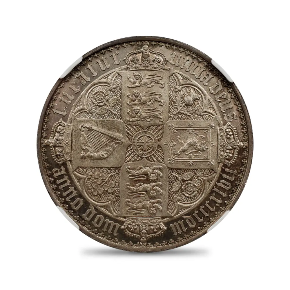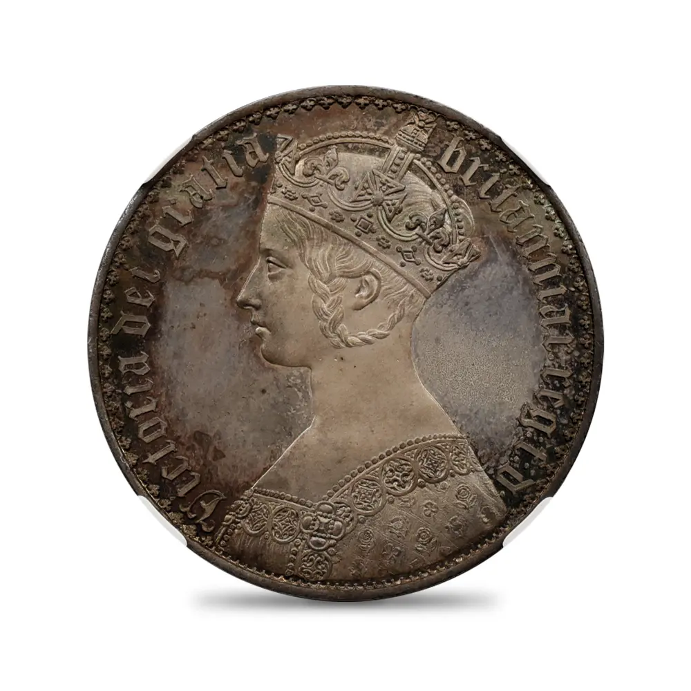 ヴィクトリア女王の即位10周年を記念して発行されたのが、この史上最も有名な銀貨である「ゴチッククラウン」の愛称で知られている5シリングと等価の銀貨です。発行初年度には8,000枚がリリースされますが、その人気の高さゆえに1853年には更に460枚が追加で鋳造されたことが記録に残っています。その人気の秘密はコイン表裏のデザインにあり、英国貨幣史上最高の彫刻師、ウィリアム・ワイオン晩年の最高傑作とされています。コイン表面に描かれているのは若き日のヴィクトリア女王の侵し難い気品を湛えたポートレートですが、頭上に輝く英国君主の象徴である聖エドワード王冠を始め、女王が身に纏う衣装と装飾品には、中世ヨーロッパに起源を持つ歴史的なゴチック様式の影響が見られ、碑文のゴチック体「ブラックレター」の採用と共に、作者ワイオンの意図する女王の品格の表出に貢献しています。裏面のバランスの良いデザインも圧巻で、表面と同様、ゴシック様式による英連合王国各国の国章が厳かに描かれています。ルーブル美術館所蔵の世紀の大作であるルネッサンスの才人レオナルド・ダ・ヴィンチの肖像画「モナ・リザ」は、その優れた人物描写によって世界史にその存在を刻み、絵画史上における一大傑作として地上に君臨していますが、この「ゴチッククラウン」は英国貨幣史上最高のコイン肖像画として、常に最高度の注目を集めて来ました。この1847年初発行バージョンと、それに続く1853年バージョンにおいて、コインのエッジ部分に碑文の無いプレーンエッジ・タイプが主流ですが、女王の即位10周年を意味する「Undecimo」の碑文を持つものも見受けられ、格別の人気を誇っています。なぜ10周年の記念に11番目を意味するUndecimoの語が用いられているかについては諸説ありですが、即位の初年を計上すると、1847年は11年目に当たるためにこの語が採用されたというのが正解の様です。英国貨幣界の「モナ・リザ」である「ゴチッククラウン」こそ、英国銀貨の最高峰として今後もヴィクトリア朝の栄華を物語り、英国アンティーク・コインを鑑賞する喜びを我々に与え続けてくれることでしょう。