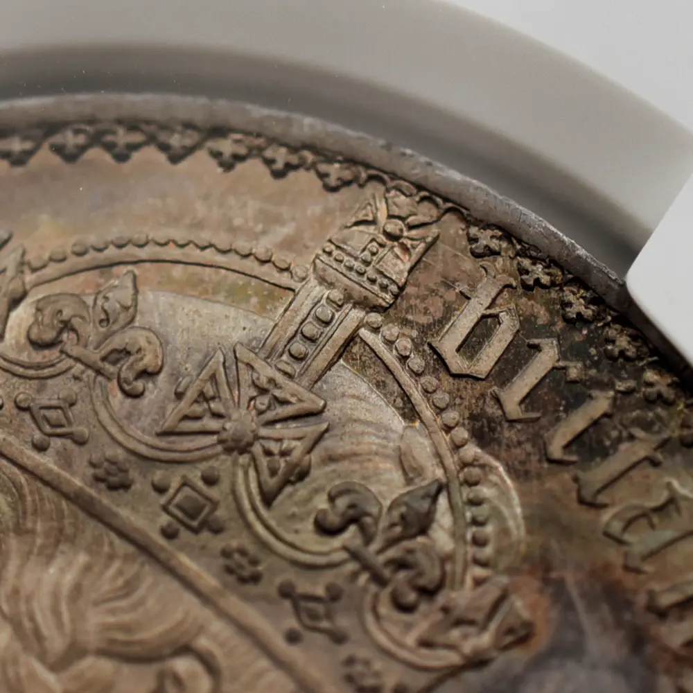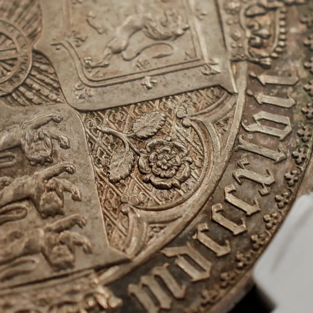 1837年のヴィクトリア女王の即位によって新時代を迎えた英国は、世界最大の覇権国家としての空前の大繁栄を前に国家としての地盤を固めつつありました。「女王の時代に国家は繁栄する」と言われて久しい英国ですが、18世紀のアン女王の崩御によるステュアート朝の断絶以来、123年振りの女王の誕生は、その後の大英帝国の隆盛期を予期させるに十分な威厳を英国にもたらしました。63年7か月に及んだ女王の治世はヴィクトリア朝と称され、英国史のクライマックスとして、また女王が統治した稀有の一時代として歴史上に深く刻まれています。夫アルバート公爵との出会いはヴィクトリア女王の人生を大きく変えました。信頼できる配偶者のサポートは女王の治世にとって不可欠で、懐妊中の女王に代わって公爵が執政を行うことも多かったようです。それゆえに公爵の急逝は女王の人生に影を落とし、公爵亡き後の女王は一定の服喪期間を超えて一生涯をそれに捧げたと言われている程です。しかし不幸の後には空前の繁栄が待ち構えていました。1887年に女王が在位50周年を迎えたころの英国は正に大英帝国の理想を成就させ、全世界に広がる一大帝国を築き上げ、英国は女王の崩御の瞬間までその圧倒的威光の下に独立独歩の道を悠然と突き進みます。この「ゴチッククラウン」銀貨は、若き日のヴィクトリア女王の年齢に似合わぬ泰然自若たる風貌を描くと共に、その後の帝国の命運を暗示する記念碑的文化遺産です。