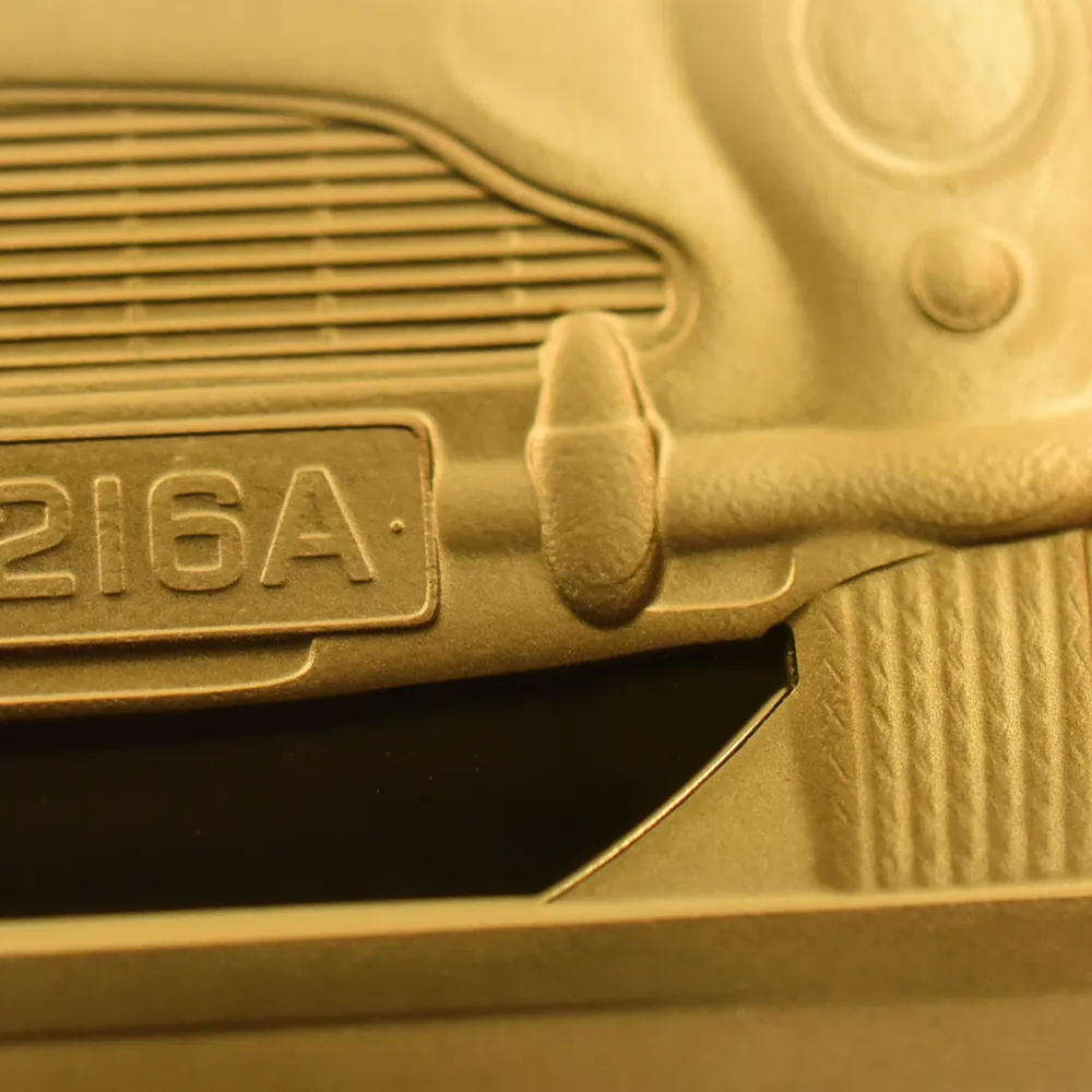 007映画オープニングの際にお馴染みの音楽とともに銃身(ガン・バレル=gun barrel)の中心に、ボンドが現れ、一撃で敵を倒すシーンを採用しており人気のボンドカー「アストンマーティンDB5」の車体前面をガンバレルの中央に描き、「BMT 216A」のナンバープレートもそのまま再現し、下方には「007」ロゴも添えられています。