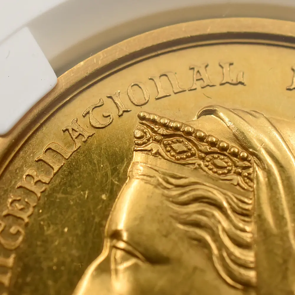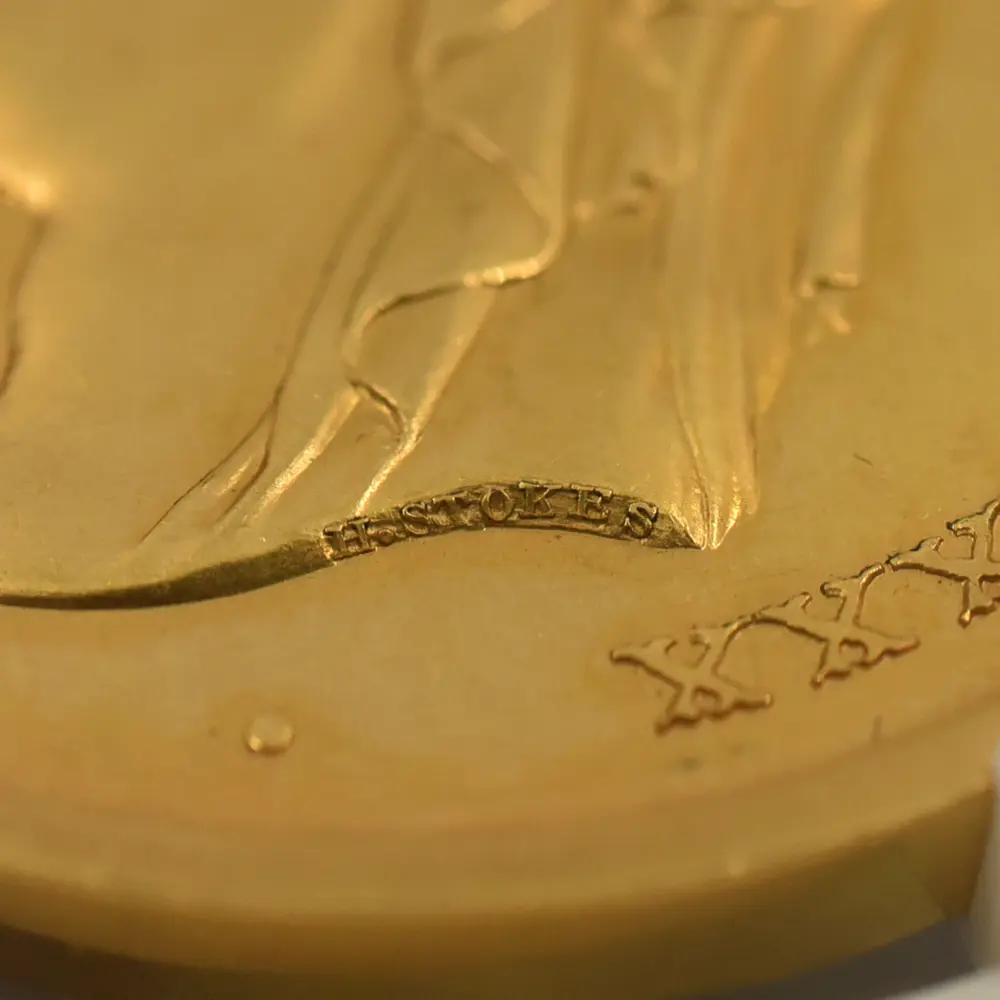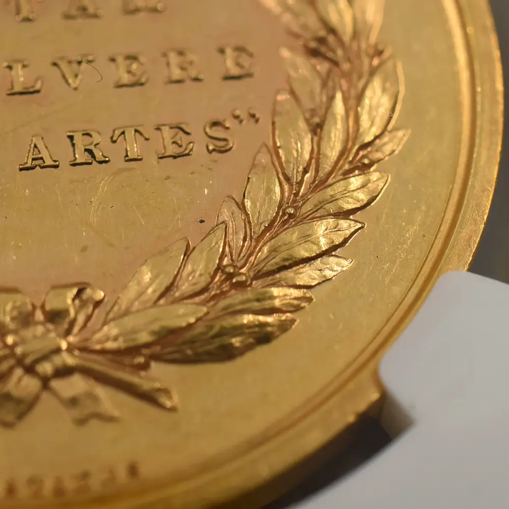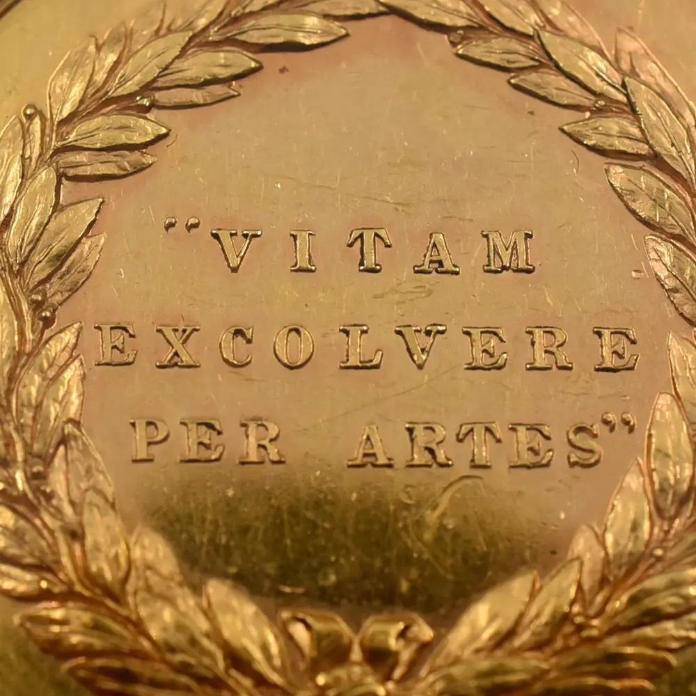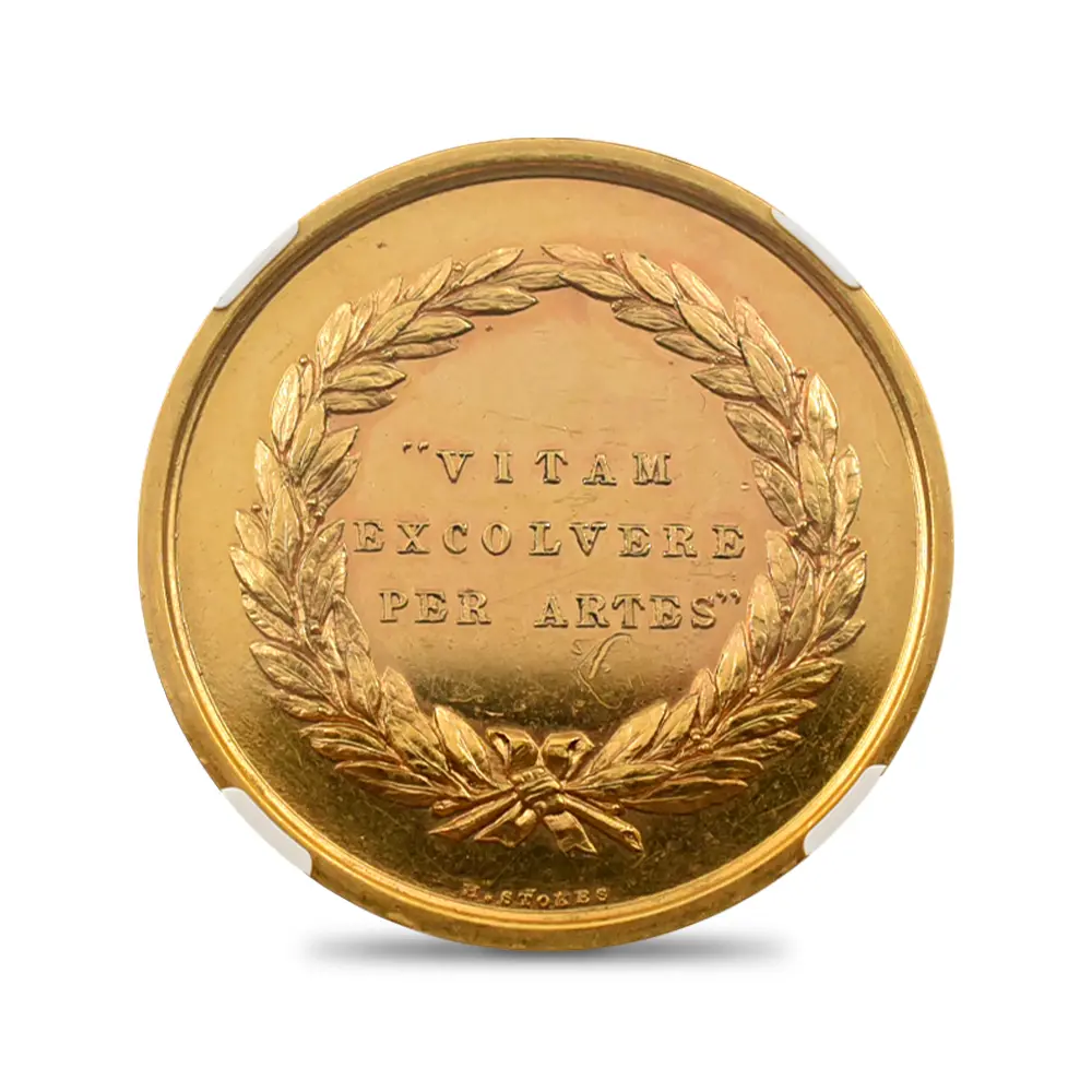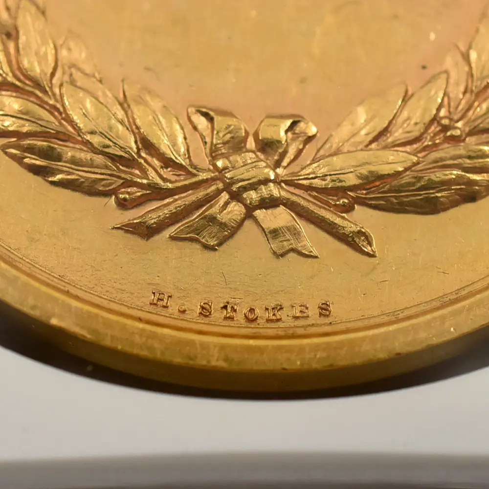 今回ご紹介させていただく作品は、ヴィクトリア朝後期の1880年にその当時の英領オーストラリアのメルボルンで開催された国際博覧会記念の金メダルです。表面には同博覧会の名称と共に晩年の貫禄漲るヴィクトリア女王の肖像が描かれています。装飾性豊かなティアラと共に注目を集めるのは女王の頭上のベールで、これはアルバート公爵を亡くした後、未亡人となった女王の服喪を暗示するものです。立体性が浮き彫りになっている女王の横顔は、ギリシャ彫刻のような厳格さを湛えています。インド女帝としての貫禄を身に着けた女王に相応しいそれ迄にはなかった新たな肖像が目を引きます。そして注目の裏面中央には、荘重なラテン語の碑文が付されています。「芸術に捧げられし生涯」という意味を持つこの格調高い碑文は、博覧会開催の意義を強調するものであり、表面の女王のポートレートとの絶妙な調和を見せています。碑文の周囲には厳かなリースが掲げられており、オーストラリア大陸での記念すべき博覧会の開催に対する祝意を添えているかのようです。当作品は貨幣価値を有することのないメダル仕様のものですが、それによってより芸術性が強調されているように思えます。貨幣にはない絶対的な境地に到達した究極のメダル作品の美と感動を心ゆくまでご堪能ください。