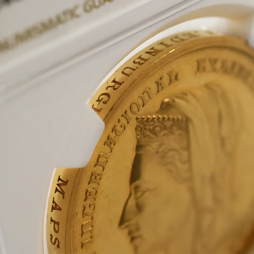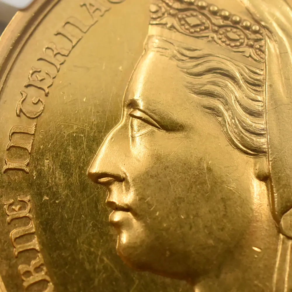 1837年、叔父ウィリアム4世の崩御に際して、若干18歳の若さでグレートブリテン連合王国の女王として即位したヴィクトリア女王。63年7か月続いた在位期間は「ヴィクトリア朝」と称され、有史以来最大の帝国として繁栄を極めた大英帝国の栄光の歴史そのものとされています。2015年に孫のエリザベス2世に長期在位記録を更新されたとはいえ、ヴィクトリア女王の時代は近世から現代にかけての橋渡し役を務めた稀有の時節として記憶されており、政治のみならず、広く各分野において急速な発展を遂げました。18世紀の中盤に興隆を見た産業革命が19世紀初頭の英国に及ぼした影響は計り知れず、王室の庇護の下に英国は飛躍的な発展を遂げます。ヴィクトリア女王の時代は立憲君主制の強化によって議会がより発言権を持った時代ではあったものの、依然として君主の王権が確約されていた時代でもあり、長期在位を誇ったヴィクトリア女王は、正に大英帝国の女主人公として重要な役割を果たしました。身長僅か145センチ程度の小柄な体躯の持ち主であった女王を陰で支えたのは、相思相愛の仲で知られていた夫のアルバート公爵でした。夫妻共に同年の1819年生まれでしたが、21歳の時に結婚した二人は、その後、議会の協力を得て立憲君主制を支え、英国王室にとっての黄金期を築きます。結婚の翌年以降、女王の懐妊が続いたため主に公爵が政務を担当し、女王の名の下に議会との良好な関係を構築します。1861年の公爵の急逝によって女王は未亡人となりますが、その後、自身の崩御の年1901年までおよそ40年間にわたって喪に服したと言われています。夫を亡くした女王の悲しみとは対照的に、英国は産業革命の恩恵を背景として隆盛を極め、大英帝国大成への道を突き進みます。1877年には首相ディズレーリの采配によって女王のインド皇帝位の兼任が決定し、女王は名実ともに大帝国の首長としての役を務めることになります、また1887年には在位50周年記念の祝賀「ゴールデンジュビリー」が挙行され、大英帝国の権威を内外に誇示します。さらにその10年後の1897年に女王は在位60周年「ダイアモンドジュビリー」に到達し、それまでの英国史上の最長在位記録保持者であった18世紀のジョージ3世の記録を更新することになります。流通貨・記念貨を問わず数多くの名品を輩出した女王の治世下の貨幣界でしたが、それらのコインは今日なおも英国貨幣1100年史の総決算として高値で取引されており、芸術性と実物資産として価値の両面において極めて珍重されています。