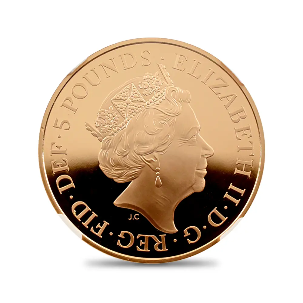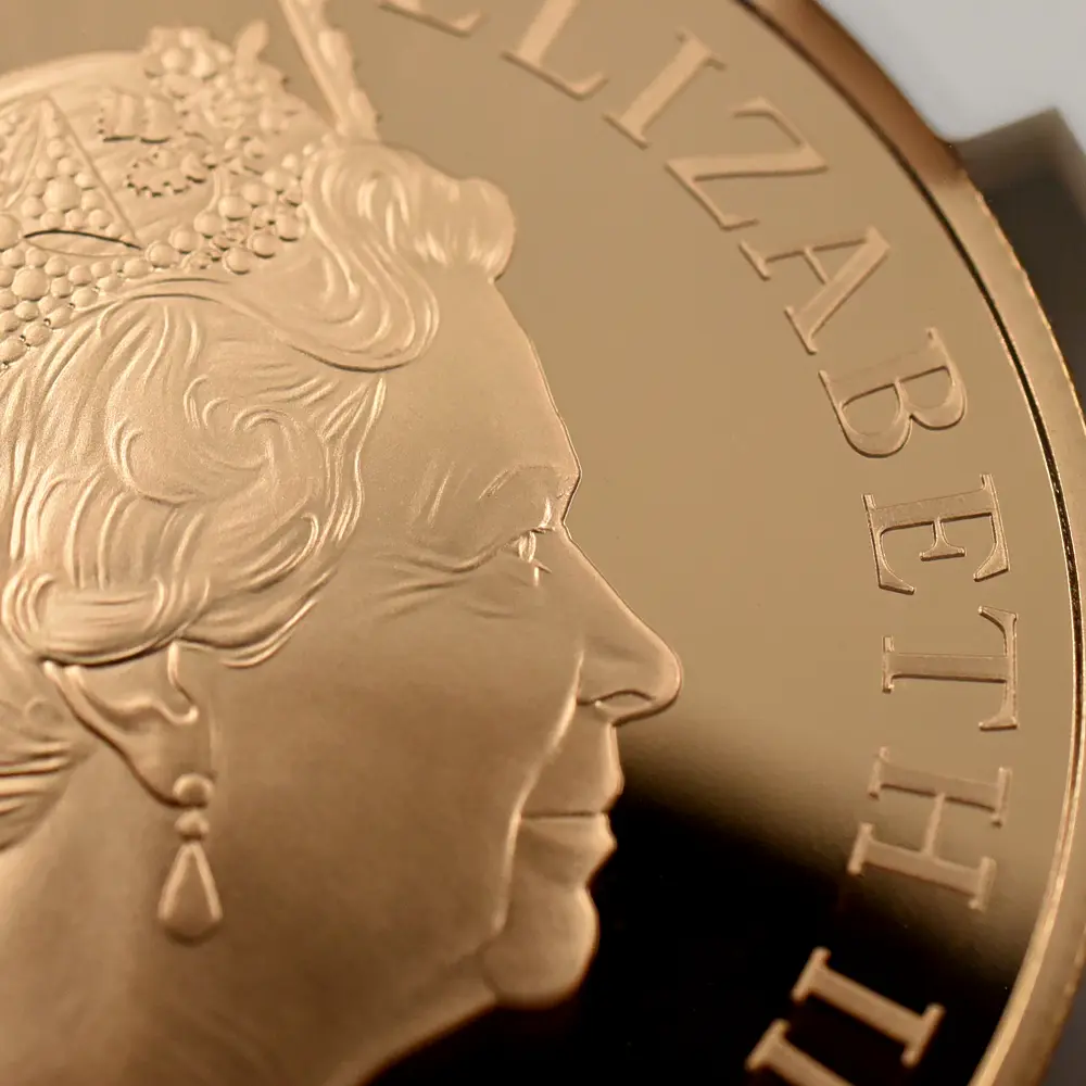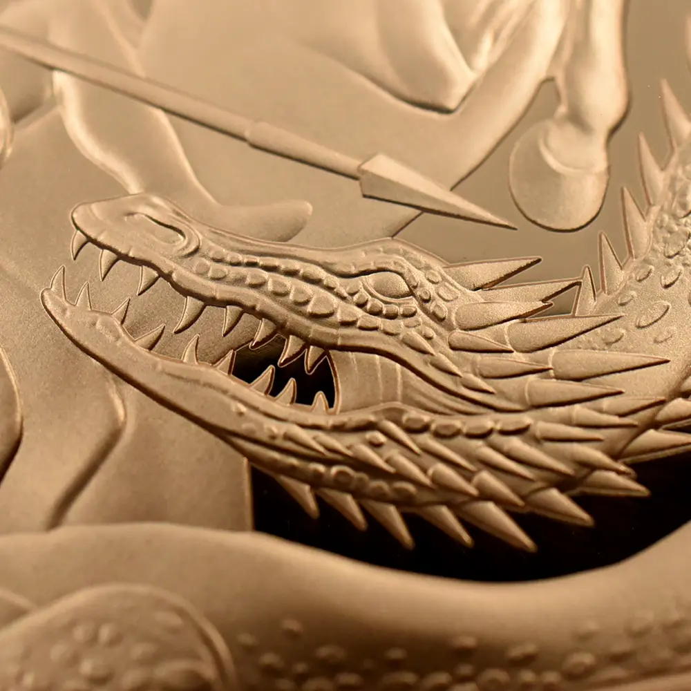 ロイヤルミントは、ケンブリッジ公爵家の長男ジョージ王子の誕生5周年を記念して、モダンコインのための新しい「聖ジョージの竜退治」のデザインを2018年に発表しました。1817年オリジナルの「聖ジョージの竜退治」とは全く異なる斬新なアプローチによって今後一層の注目を集めることと思われるこの意匠は、現代ロイヤルミントならではの想像力と独創性が活かされたモダンコイン界渾身の力作であると言えます。裏面下部には、大きなうねりを見せる獰猛なドラゴンが横たわっており、上部に描かれた馬上の聖ジョージとの見事な対比を見せています。裏面全体に広がるように描かれたこの竜退治の場面は、遠近法の妙技を堪能することのできるコインデザインによる第一級の芸術作品と言っても過言ではありません。コイン表面には前国王エリザベス2世最晩年の孤高の境地を示す「公式第5肖像」が描かれています。女王が89歳に差し掛かった時に制作されたこの現代屈指の名コインポートレートは、2015年の登場以降、英国コインの顔としてあまねく認知されています。数多くの出品作の中から、当時若干35歳のデザイナー、ジョディ・クラークのこの作品が選出され、女王自身のお気に入りの作品として流通貨を含めたすべての英国コインの表面を飾ることになりました。ポートレートの頭上には、1821年に挙行されたジョージ4世の戴冠式のために制作された「ステート・ダイアモンド・ダイアデム」が煌めいていますが、これは長年にわたって女王のトレードマークとして使用されていた宝飾品として知られています。世代の離れた二人の王族、エリザベス2世とジョージ王子の家族の絆を示す当コインは、英国王室の未来永劫の安泰を象徴する新時代のモダンコインとして、今後、一層注目を集めることでしょう。