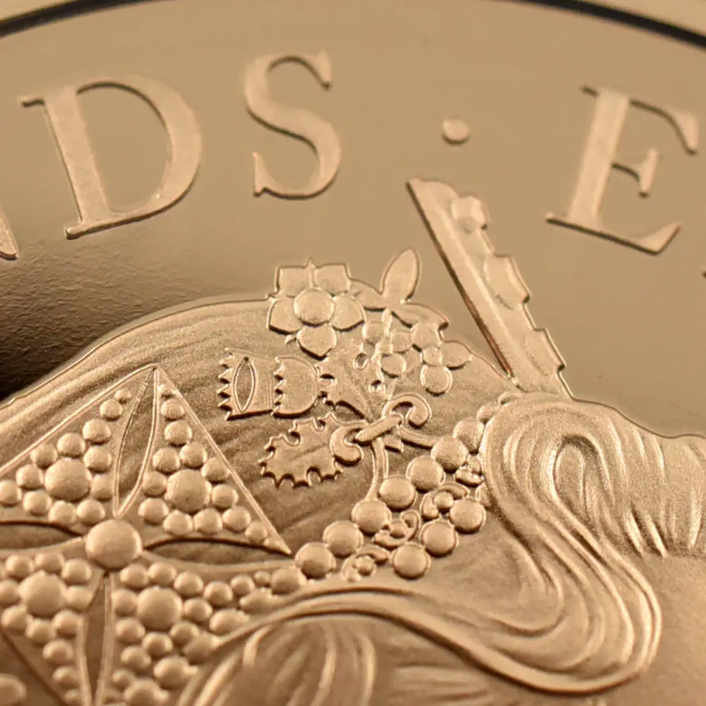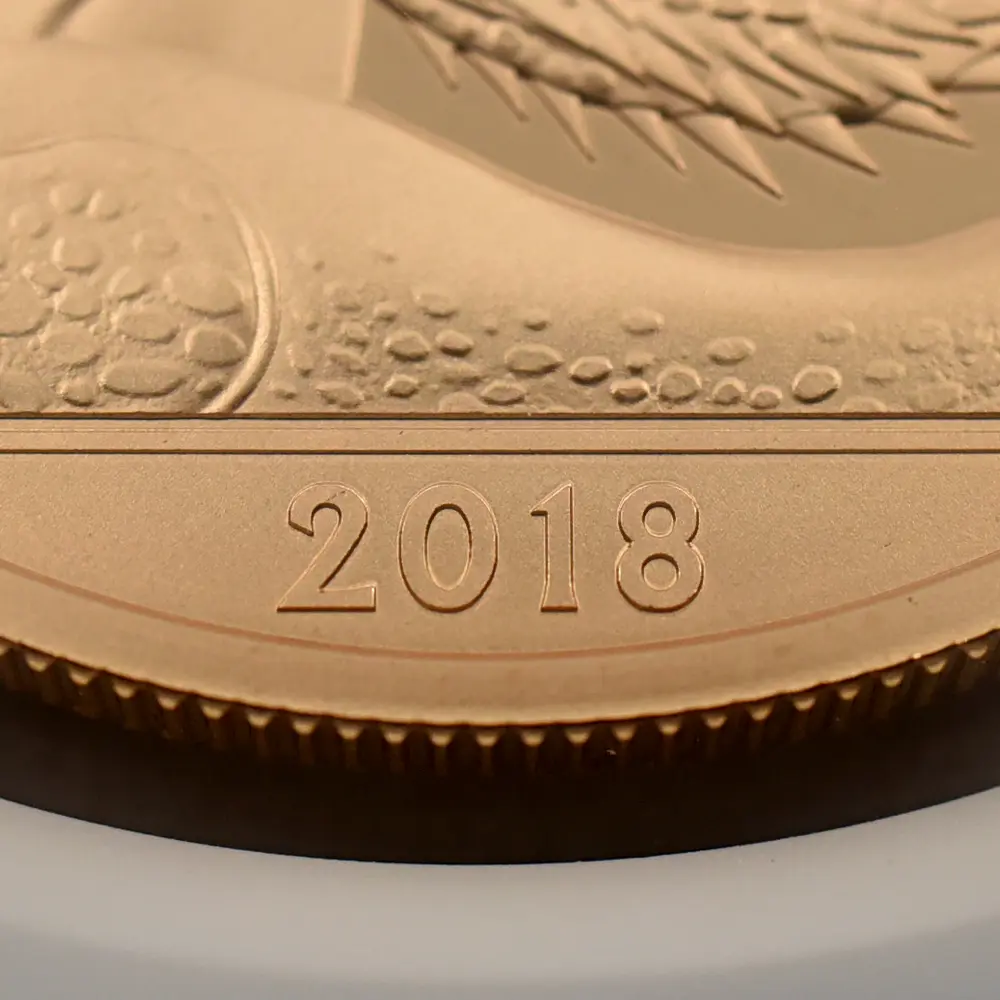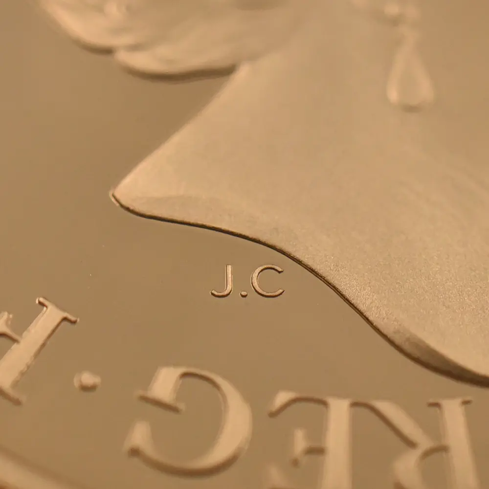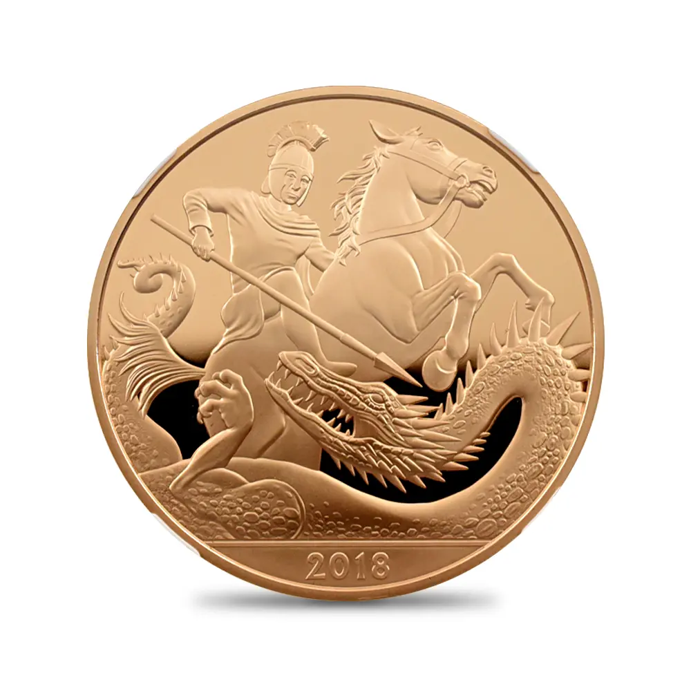 ロイヤルミントは、ケンブリッジ公爵家の長男ジョージ王子の誕生5周年を記念して、モダンコインのための新しい「聖ジョージの竜退治」のデザインを2018年に発表しました。1817年オリジナルの「聖ジョージの竜退治」とは全く異なる斬新なアプローチによって今後一層の注目を集めることと思われるこの意匠は、現代ロイヤルミントならではの想像力と独創性が活かされたモダンコイン界渾身の力作であると言えます。裏面下部には、大きなうねりを見せる獰猛なドラゴンが横たわっており、上部に描かれた馬上の聖ジョージとの見事な対比を見せています。裏面全体に広がるように描かれたこの竜退治の場面は、遠近法の妙技を堪能することのできるコインデザインによる第一級の芸術作品と言っても過言ではありません。コイン表面には前国王エリザベス2世最晩年の孤高の境地を示す「公式第5肖像」が描かれています。女王が89歳に差し掛かった時に制作されたこの現代屈指の名コインポートレートは、2015年の登場以降、英国コインの顔としてあまねく認知されています。数多くの出品作の中から、当時若干35歳のデザイナー、ジョディ・クラークのこの作品が選出され、女王自身のお気に入りの作品として流通貨を含めたすべての英国コインの表面を飾ることになりました。ポートレートの頭上には、1821年に挙行されたジョージ4世の戴冠式のために制作された「ステート・ダイアモンド・ダイアデム」が煌めいていますが、これは長年にわたって女王のトレードマークとして使用されていた宝飾品として知られています。世代の離れた二人の王族、エリザベス2世とジョージ王子の家族の絆を示す当コインは、英国王室の未来永劫の安泰を象徴する新時代のモダンコインとして、今後、一層注目を集めることでしょう。