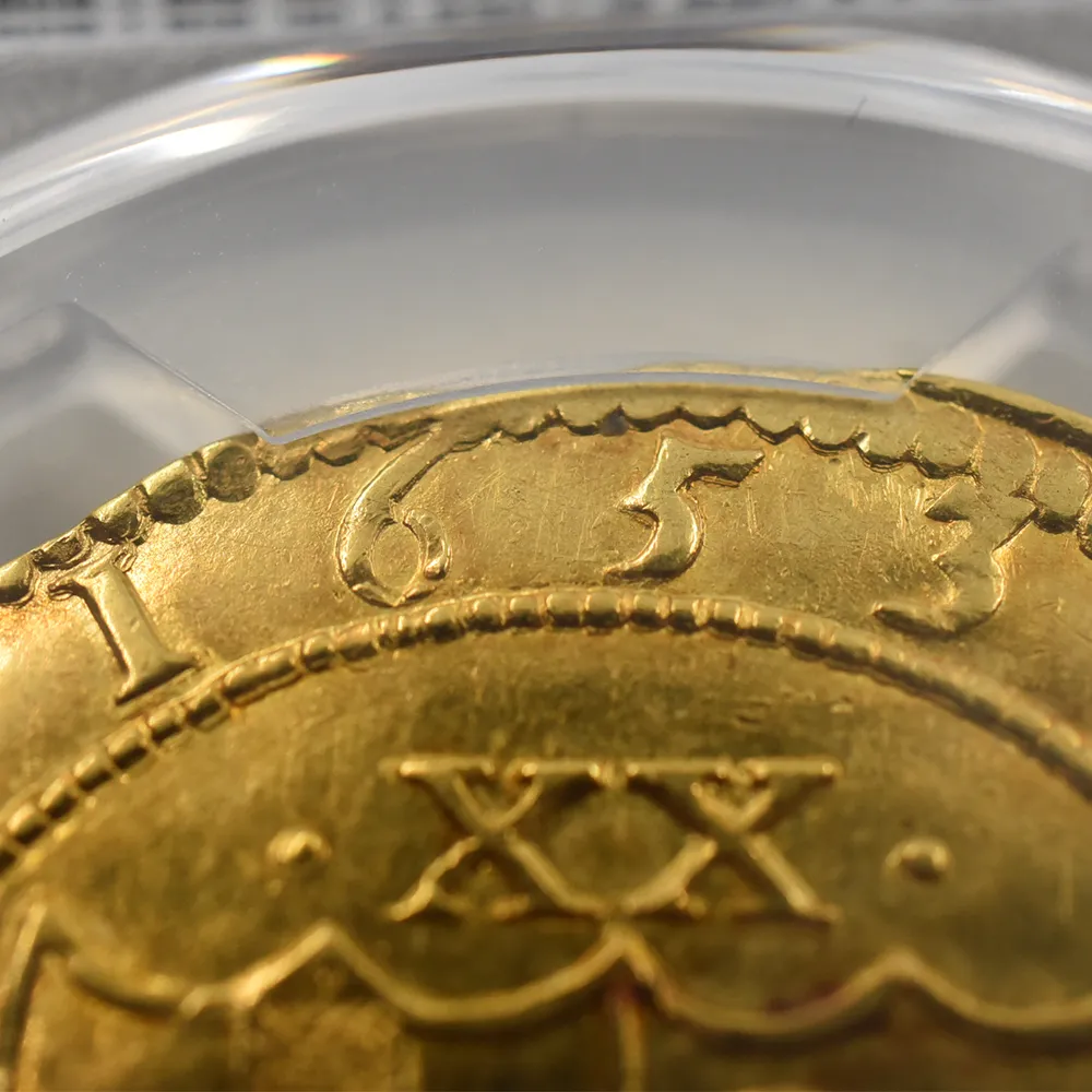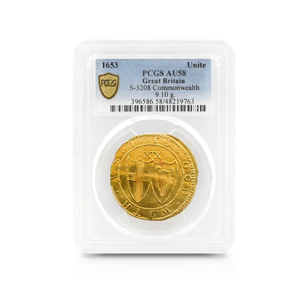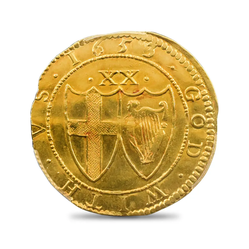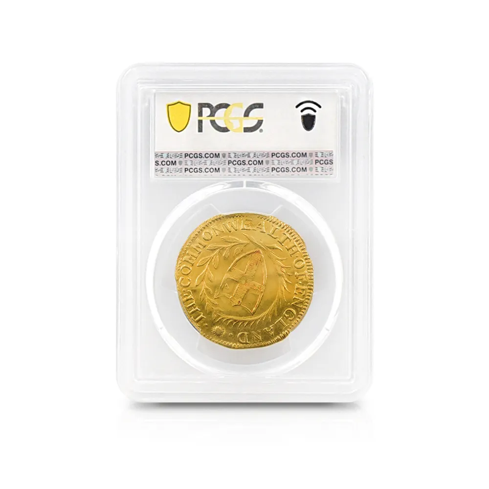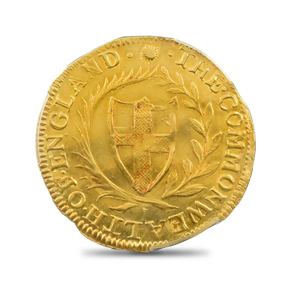 英国史上唯一の共和制を永遠に刻印する当金貨は、激動のコモンウェルス時代を象徴する歴史的遺産に他なりません。そして何よりも忘れてはならないことは、この体制の崩壊が、21世紀の現代にまで存続することになる英国王室のその後の安泰を確立したという事実です。当コインにはその矛盾に満ちた英国史上の不思議な一時代の名残が見られると共に、護国卿クロムウェルを中心に政権を樹立した議会派の活動初年度に発行されたという点が強調される貴重な作品です。表面中央にはイングランド共和国の盾とそれを取り囲む月桂樹と棕櫚のリースが描かれ、その上には太陽の形を模した独特のミントマークが掲げられています。ラテン語で刻まれることの多い17世紀当時発行のアンティーク・コインですが、表面の碑文は「イングランド共和国」と英語で表記されています。さらに裏面には共和国と同盟国アイルランドの盾の紋章が掲げられており、「神は我々と共に」とピューリタン的な心情をこれもまた英語で表現しています。この時代の全ての金貨は22金で制作されており、この金貨も例外ではありません。また銘文を英語のシンプルな文体で表記した最初期のコインでもあります。真に歴史的な事象である清教徒革命の果てに樹立したイングランド共和国の栄光と落日を同時にシンボライズする当コインは、英国貨幣史上最も歴史の一時代を象徴する名貨として、今後更に希少価値の高揚を実現することでしょう。