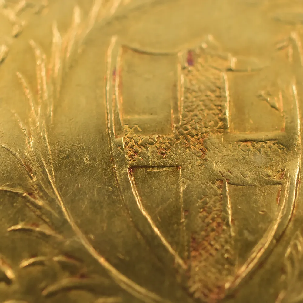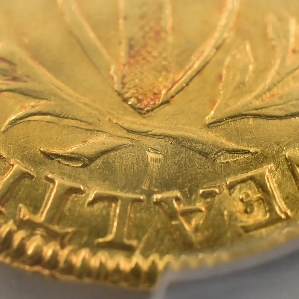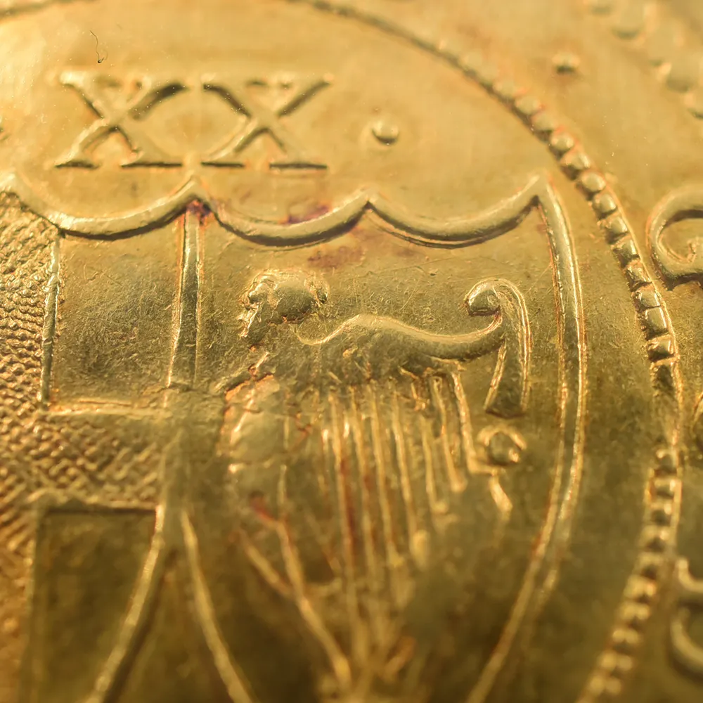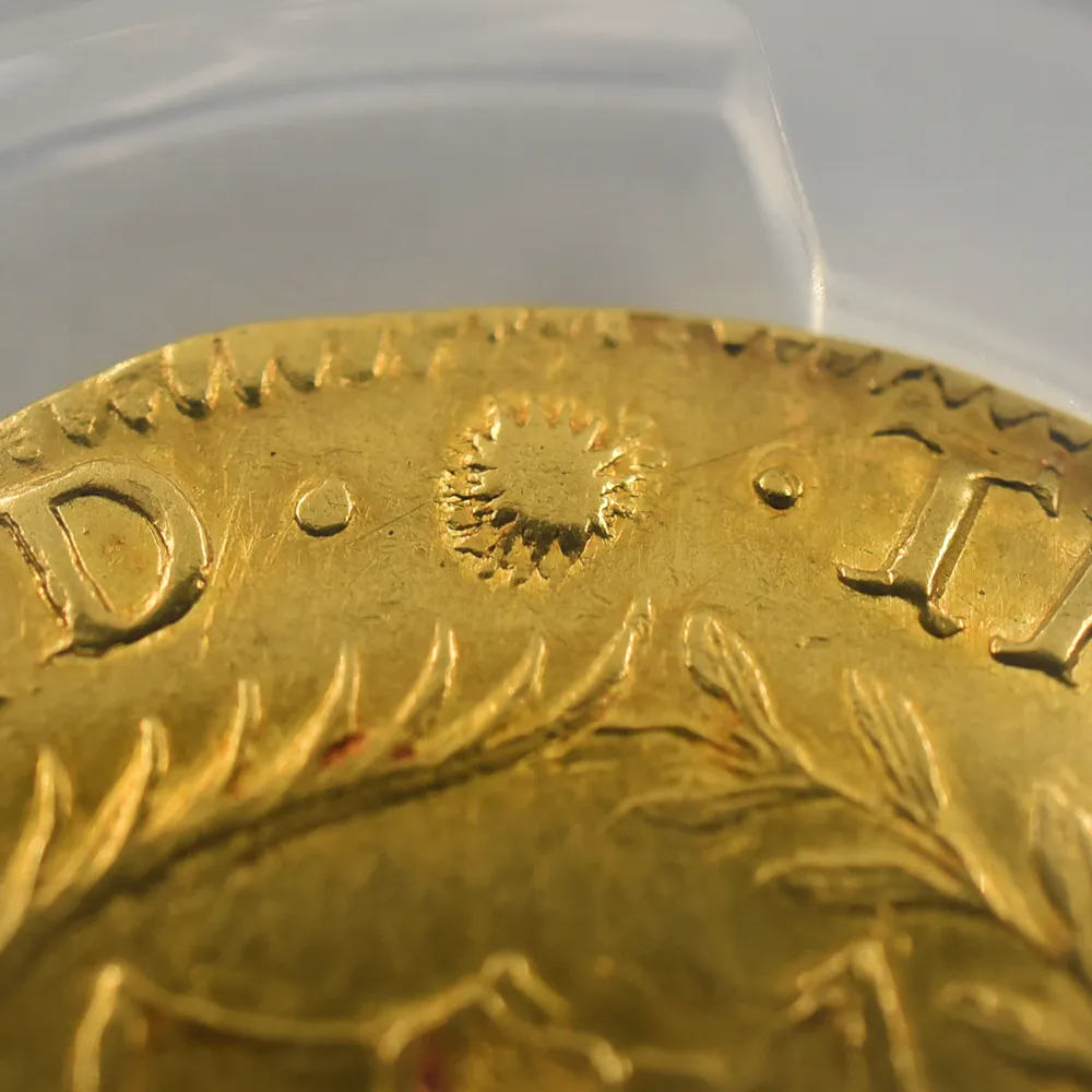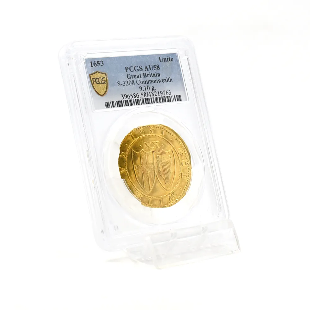 英国史上唯一の共和制を永遠に刻印する当金貨は、激動のコモンウェルス時代を象徴する歴史的遺産に他なりません。そして何よりも忘れてはならないことは、この体制の崩壊が、21世紀の現代にまで存続することになる英国王室のその後の安泰を確立したという事実です。当コインにはその矛盾に満ちた英国史上の不思議な一時代の名残が見られると共に、護国卿クロムウェルを中心に政権を樹立した議会派の活動初年度に発行されたという点が強調される貴重な作品です。表面中央にはイングランド共和国の盾とそれを取り囲む月桂樹と棕櫚のリースが描かれ、その上には太陽の形を模した独特のミントマークが掲げられています。ラテン語で刻まれることの多い17世紀当時発行のアンティーク・コインですが、表面の碑文は「イングランド共和国」と英語で表記されています。さらに裏面には共和国と同盟国アイルランドの盾の紋章が掲げられており、「神は我々と共に」とピューリタン的な心情をこれもまた英語で表現しています。この時代の全ての金貨は22金で制作されており、この金貨も例外ではありません。また銘文を英語のシンプルな文体で表記した最初期のコインでもあります。真に歴史的な事象である清教徒革命の果てに樹立したイングランド共和国の栄光と落日を同時にシンボライズする当コインは、英国貨幣史上最も歴史の一時代を象徴する名貨として、今後更に希少価値の高揚を実現することでしょう。
