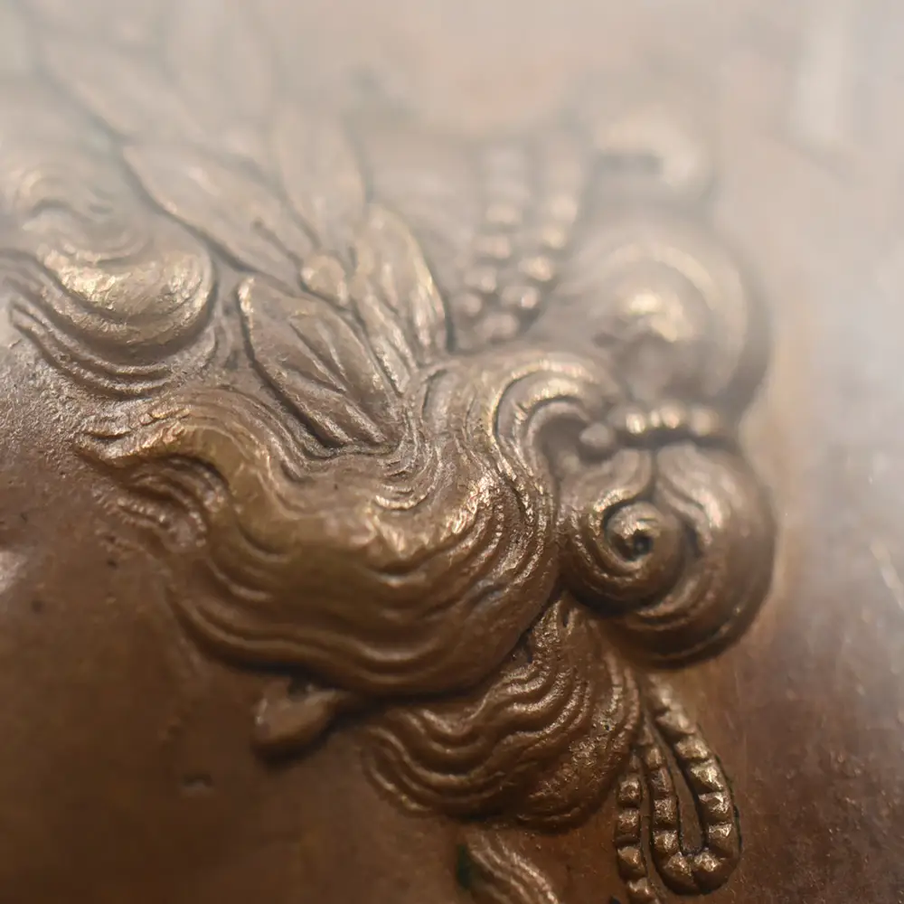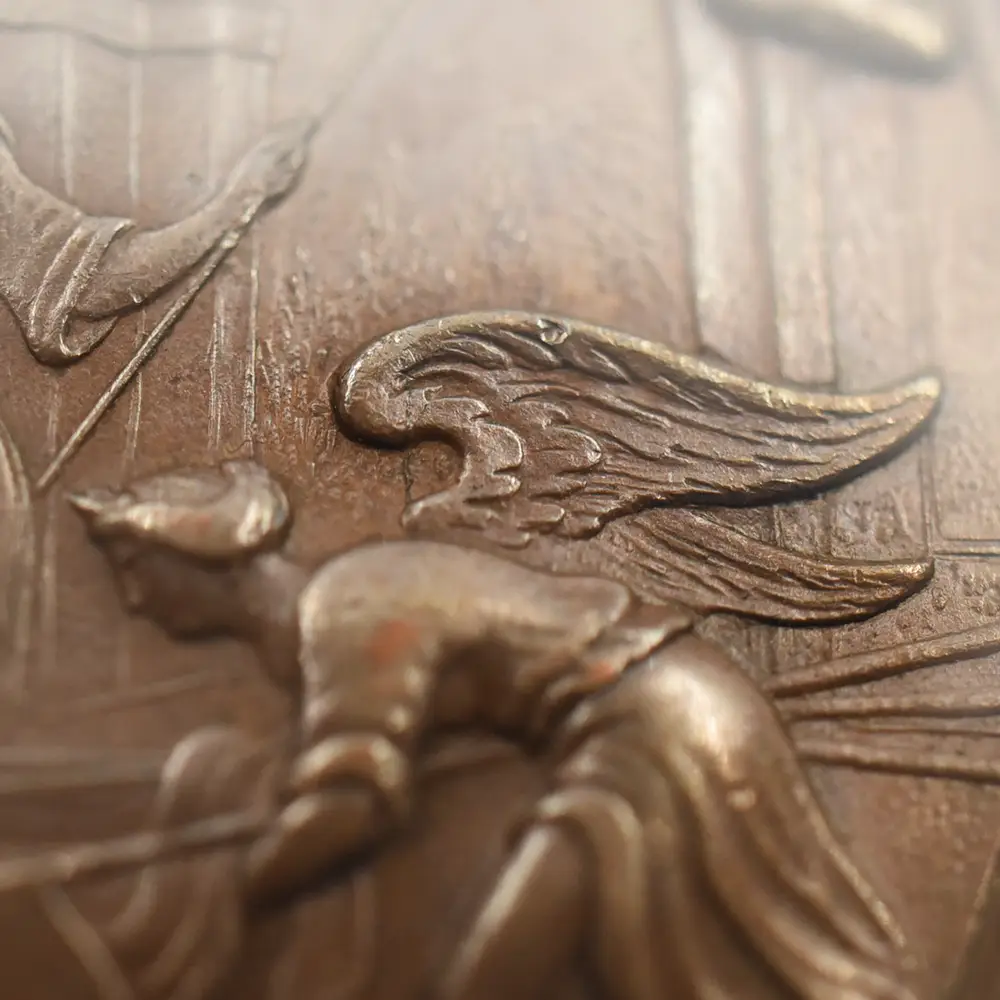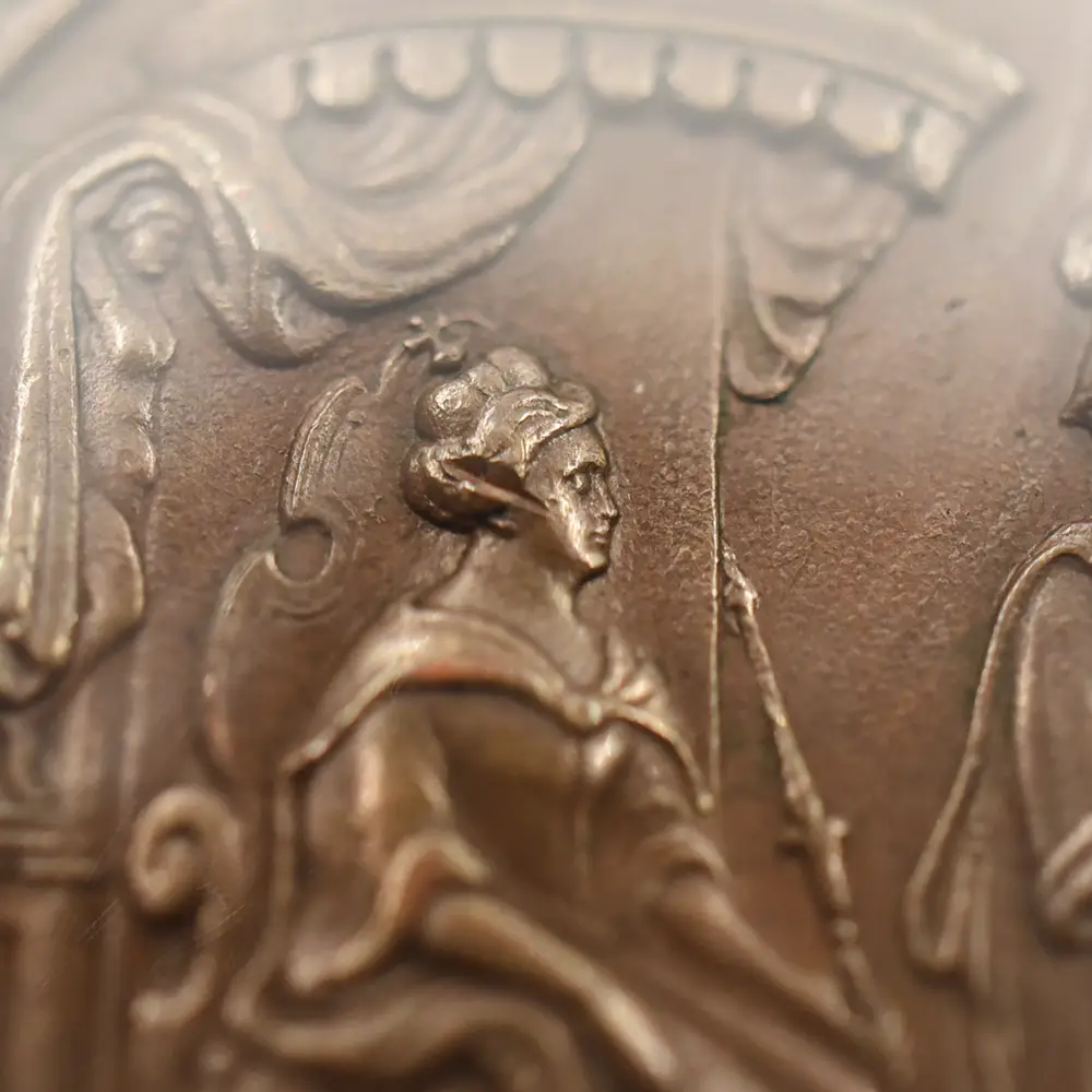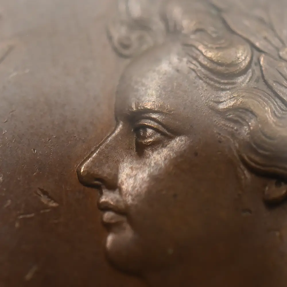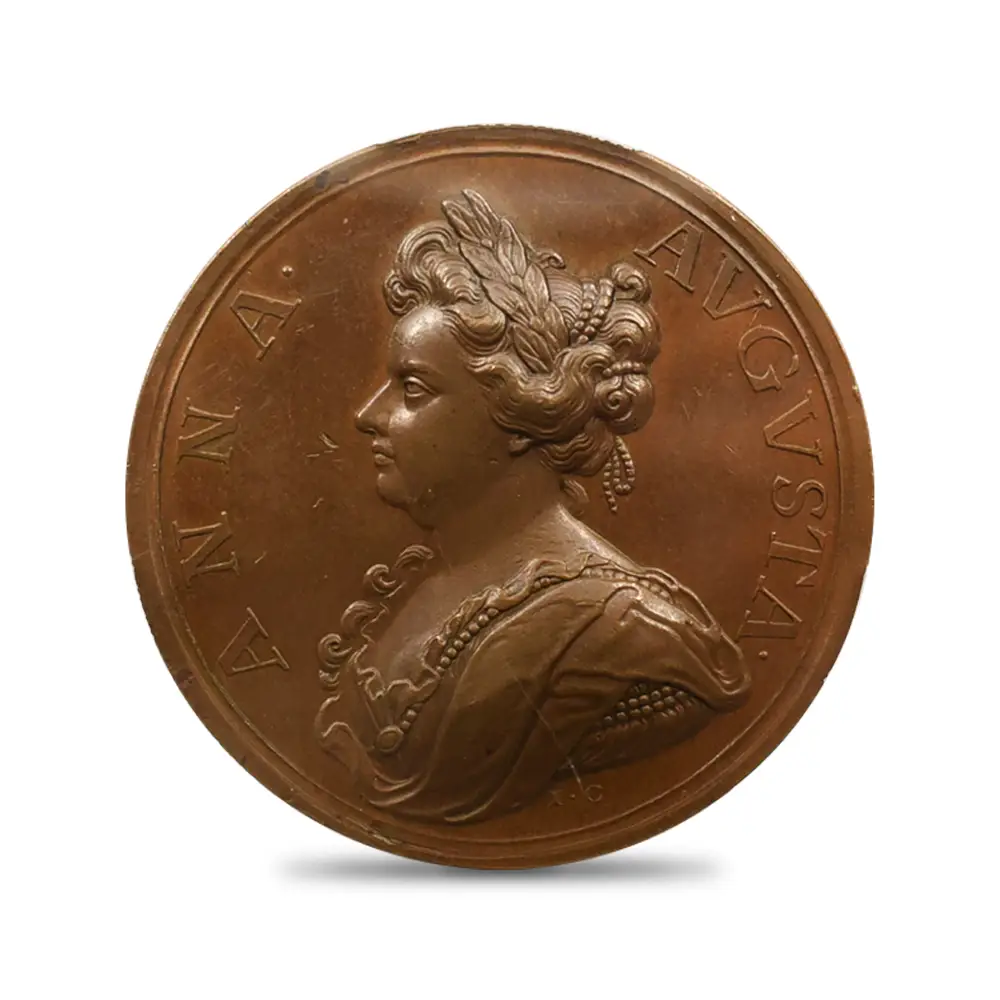 今回ご紹介させていただく作品は、アン女王治世下の1710年にイングランドが大きな勝利を収めたサラゴサの戦いでの戦勝を記念して発行された銅メダルです。サラゴサの戦いは。スペイン継承戦争中に勃発した、スペイン・ブルボン家の軍勢とイングランドを含むオーストリアの多国籍軍による戦闘です。メダルの裏面左には、玉座に座る堂々たるアン女王の姿が描かれています。その面前には各国の国旗を女王に捧げる有翼の天使が描かれており、ある種の物語性を感じさせます。裏面上部には「撃破されたスペイン」の文言が刻まれており、英国の勝利を称えています。そしてメダル表面には、左向きのアン女王のポートレートが三次元的な立体性の下に再現されています。通常のコイン上に描かれている肖像とは全く異なる豪華絢爛たるもので、頭髪を飾る髪飾りや衣装のドレープなどが細部にわたってきめ細やかに再現されています。肖像周囲には女王の王名アンと共に、サラゴサの戦いが勃発した8月を意味する「AUGUSTA」の一語が付されています。18世紀初頭のイングランドを舞台とするアン女王の治世を象徴する当銅メダルは、激動の時代に相応しい審美性と歴史的価値を有する記念メダルとして制作された第一級の芸術品に他なりません。