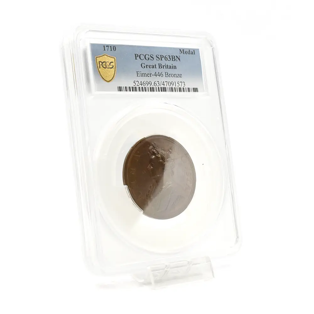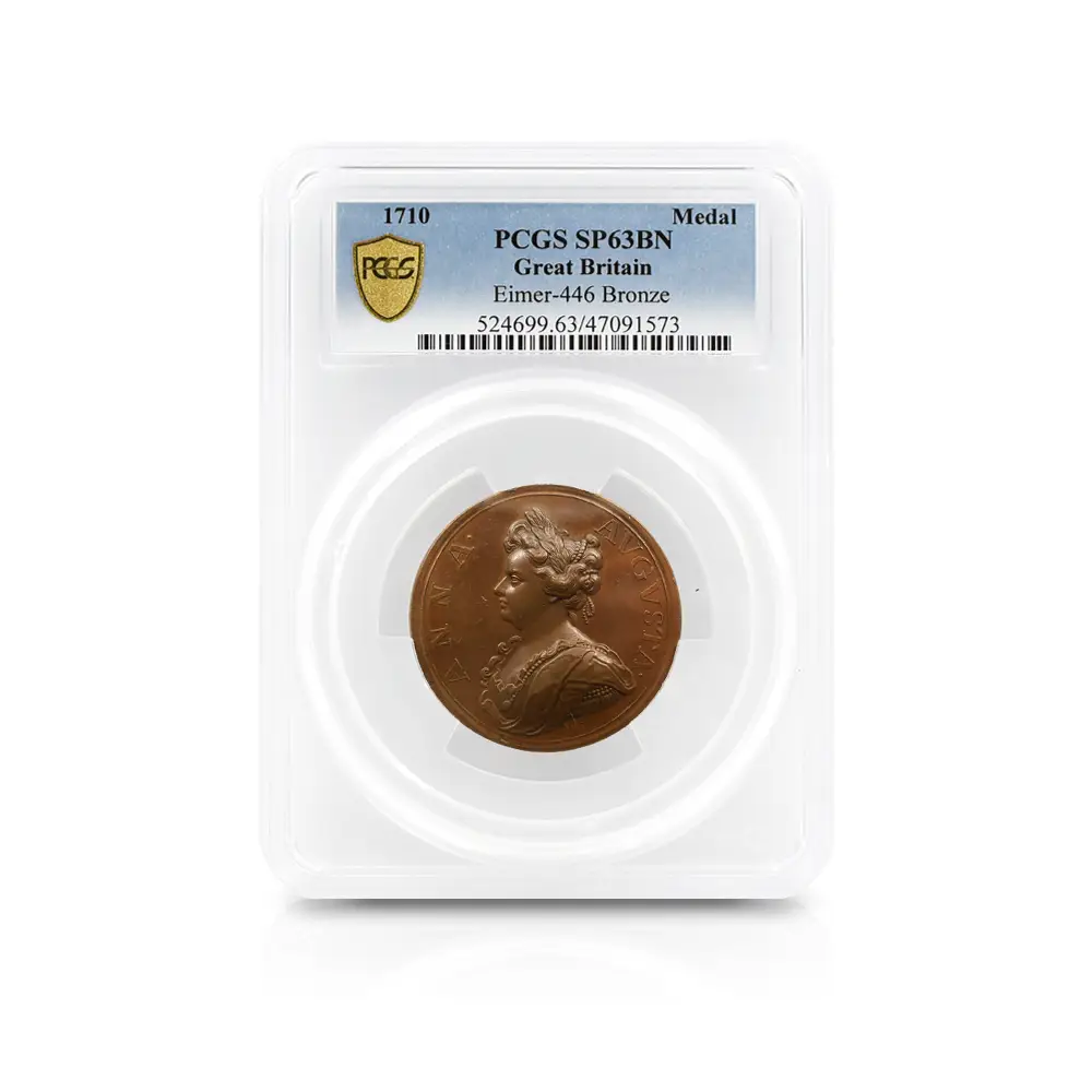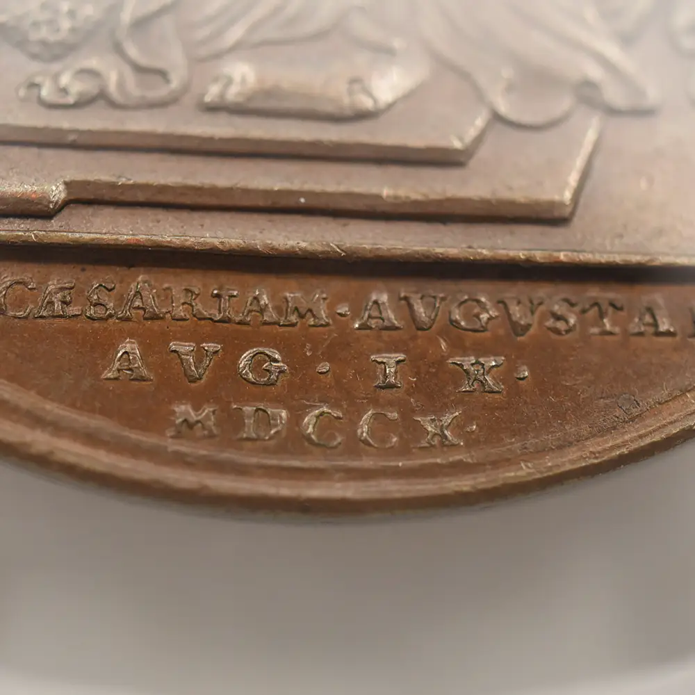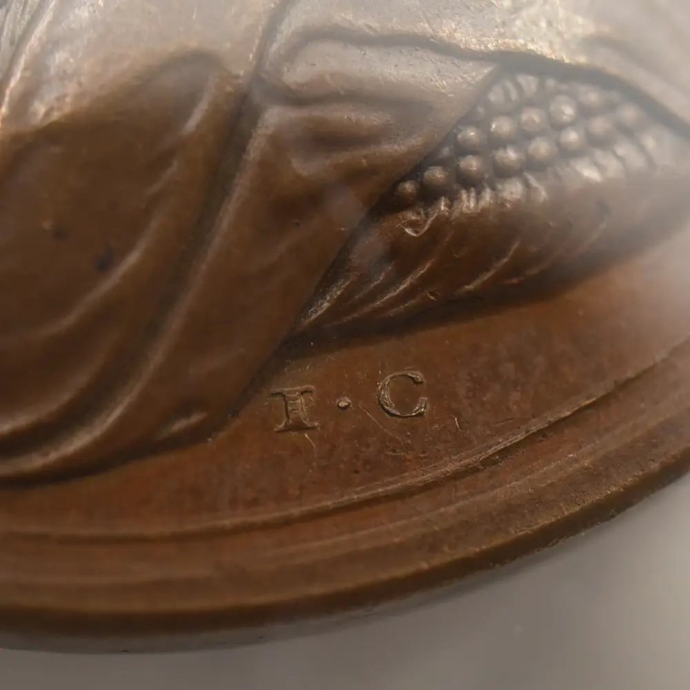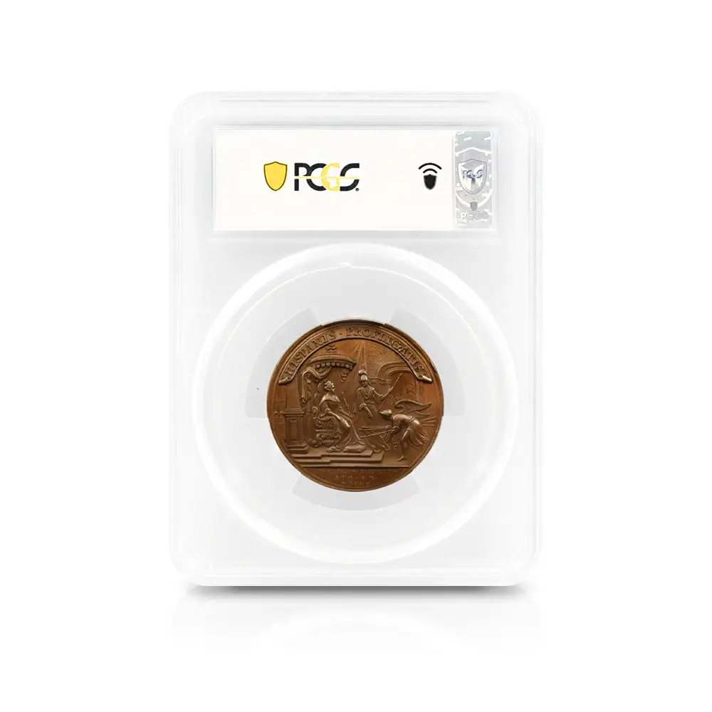 今回ご紹介させていただく作品は、アン女王治世下の1710年にイングランドが大きな勝利を収めたサラゴサの戦いでの戦勝を記念して発行された銅メダルです。サラゴサの戦いは。スペイン継承戦争中に勃発した、スペイン・ブルボン家の軍勢とイングランドを含むオーストリアの多国籍軍による戦闘です。メダルの裏面左には、玉座に座る堂々たるアン女王の姿が描かれています。その面前には各国の国旗を女王に捧げる有翼の天使が描かれており、ある種の物語性を感じさせます。裏面上部には「撃破されたスペイン」の文言が刻まれており、英国の勝利を称えています。そしてメダル表面には、左向きのアン女王のポートレートが三次元的な立体性の下に再現されています。通常のコイン上に描かれている肖像とは全く異なる豪華絢爛たるもので、頭髪を飾る髪飾りや衣装のドレープなどが細部にわたってきめ細やかに再現されています。肖像周囲には女王の王名アンと共に、サラゴサの戦いが勃発した8月を意味する「AUGUSTA」の一語が付されています。18世紀初頭のイングランドを舞台とするアン女王の治世を象徴する当銅メダルは、激動の時代に相応しい審美性と歴史的価値を有する記念メダルとして制作された第一級の芸術品に他なりません。