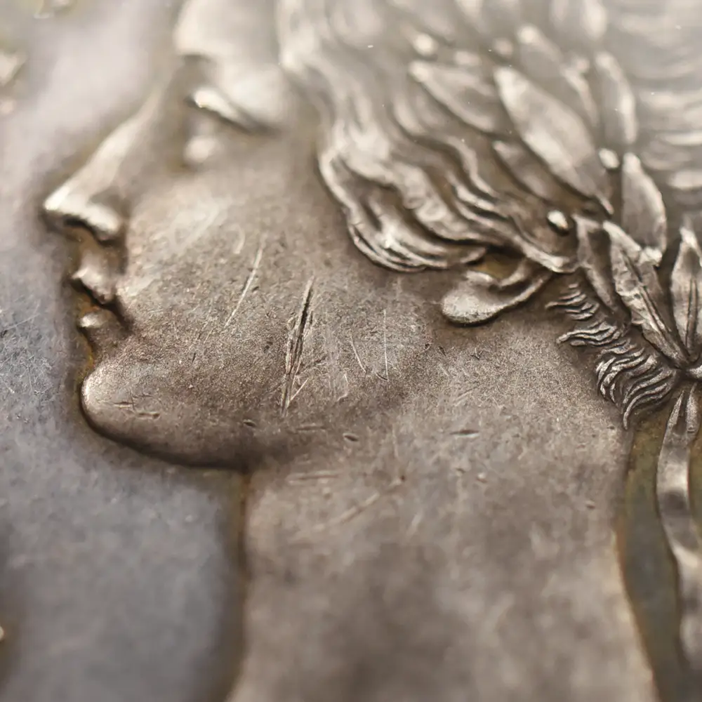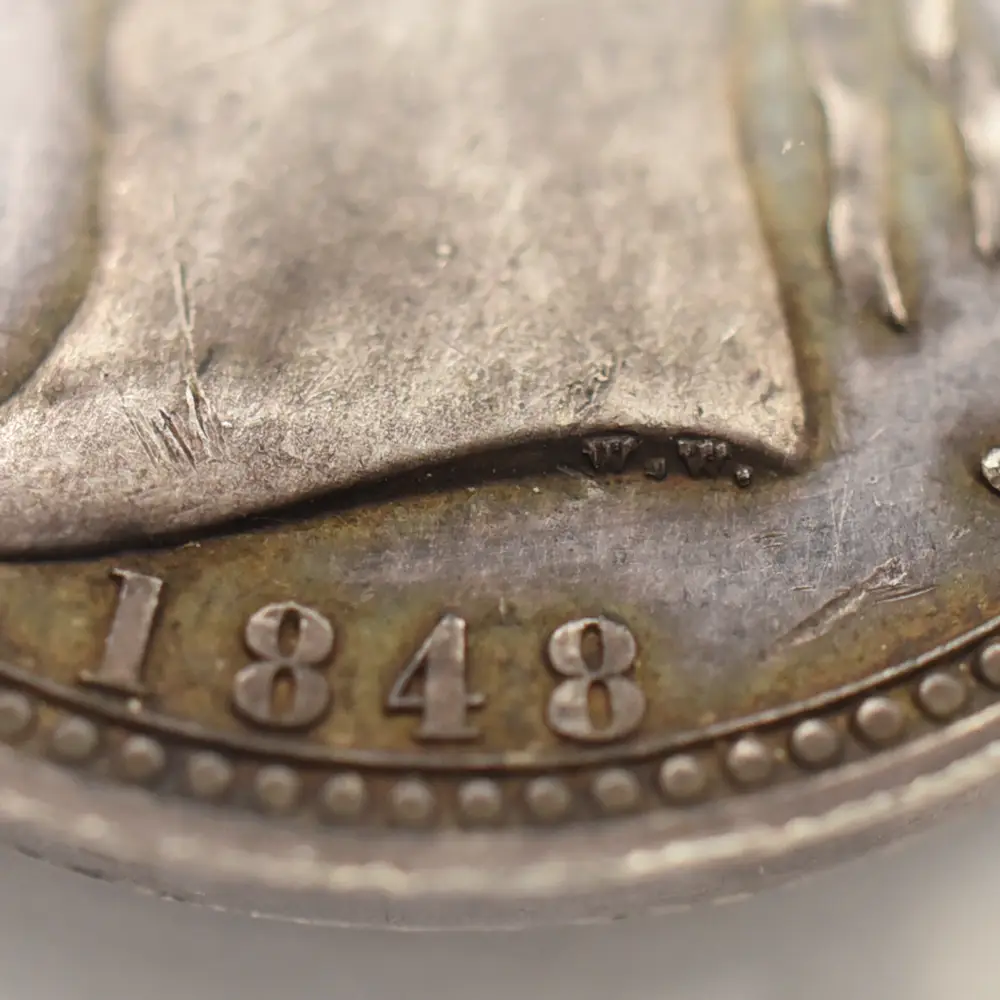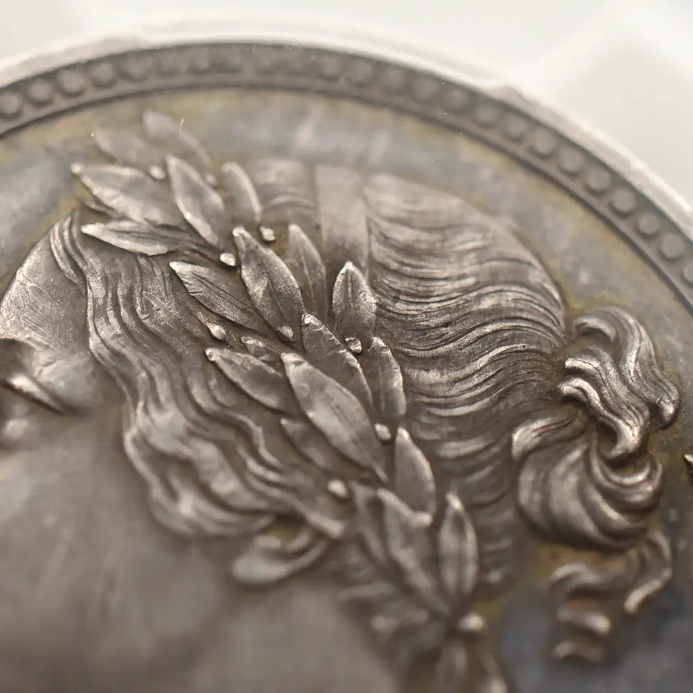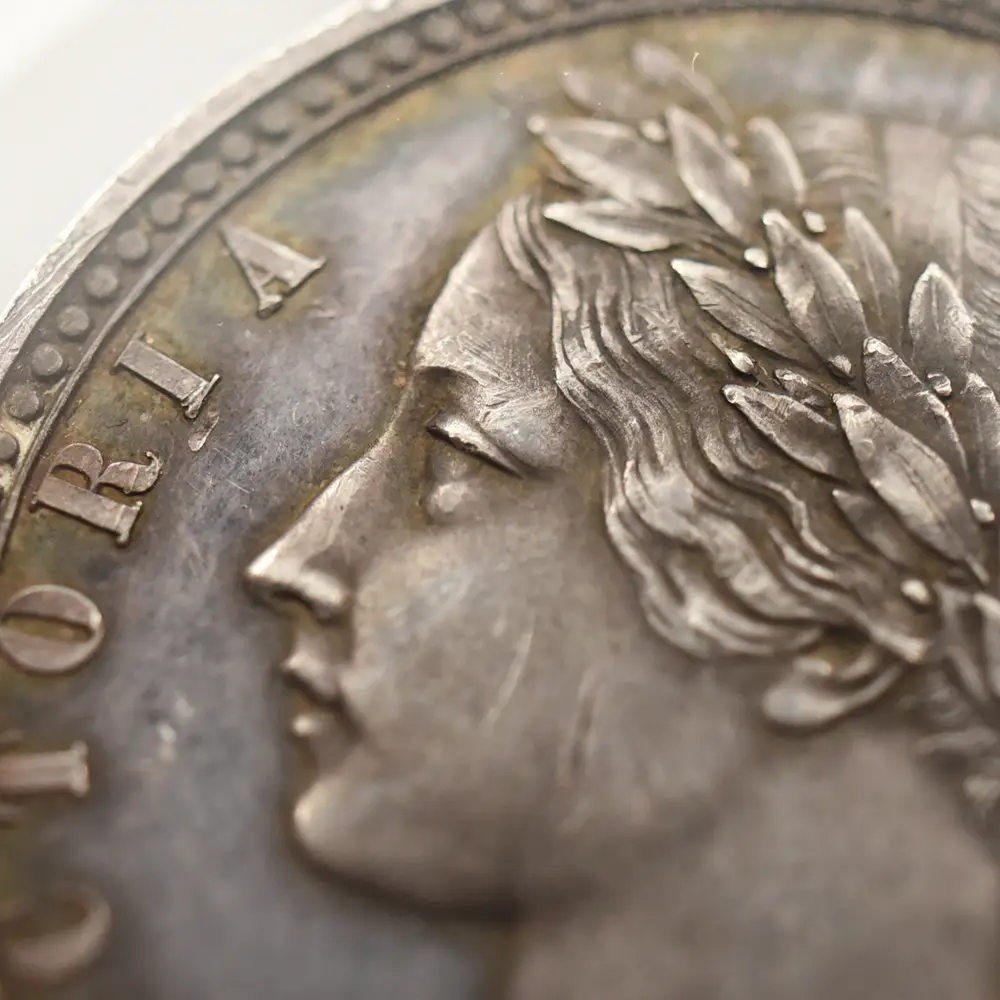 今回ご紹介させて頂くコインはヴィクトリア女王治世初期の1848年にリリースされたパターン・フローリン銀貨です。パターンコインとは、新貨幣が発行される前に流通用ではなく、新しいコインのデザインや仕様の最高度の出来栄えを示す見本として制作される特別のコインを指します。イギリスでは、1846年から47年にかけて、十進法通貨制度を模索した時期があり、その時に10分の1ポンド(2シリング)に相当する補助通貨単位としてフローリン銀貨が採用された経緯がありました。他の単位の候補としてはCentumやDecadeも挙がっていたこともあり、これらの表記が見られるフローリン銀貨も数多く残っています。イギリスにおけるフローリン銀貨は1848年までにパターンコインとして約30種類が制作されたことが記録に残っており、その中でも特に有名なものとしてゴチック様式の美しいデザインによって一世を風靡した「ゴチッククラウン銀貨」のデザインに基づく「ゴチック・フローリン銀貨」が挙げられます。当コインの裏面中央にはヴィクトリア女王の「ロイヤルサイファ」であるVRの文字が刻まれており、女王の威厳を表出しています。「ロイヤルサイファ」とは歴代君主が保持する私的な紋章で、主に国王の名前のイニシャルと国王を示すラテン語のRexもしくは女王を意味するReginaの頭文字Rを合わせて創作されたものです。その周囲を囲むように女王の治世には既に統合されていたグレートブリテン連合王国4か国の国章が厳かに刻まれています。イングランドのバラ、スコットランドのシャムロック、アイルランドのクローバーが見られますが、3本のダチョウの羽根から成る「スリー・オーストリッチ」はウェールズを象徴する紋章として知られています。そしてコイン表面には大変珍しい月桂冠を戴く若き日のヴィクトリア女王の鮮烈な肖像が刻まれており、表面全体に絶対的なオーラを拡散しています。即位当時18歳であった女王を描き絶賛された「ヤング・ヘッド」を彷彿させるこの美しくも威厳を湛えた肖像のデザインもまた、ワイオンの天与の才能の片鱗を伺わせる芸術性豊かなものです。ポートレートの周囲にはラテン語にて「女王ヴィクトリア」と刻まれています。1848年の西暦が時代を感じさせるとともに、経年によって表面にただよういぶし銀の心地よい色彩感と92.5%シルバーの純粋な質感が、デザインの古典美とアンティークコインとしての魅力を強調することに貢献しています。ヴィクトリア朝ならではの古雅な魅力を湛えた美しさを堪能することの出来る当パターン・フローリン銀貨の21世紀における運命的な降臨を心から喜ばずにはいられません。